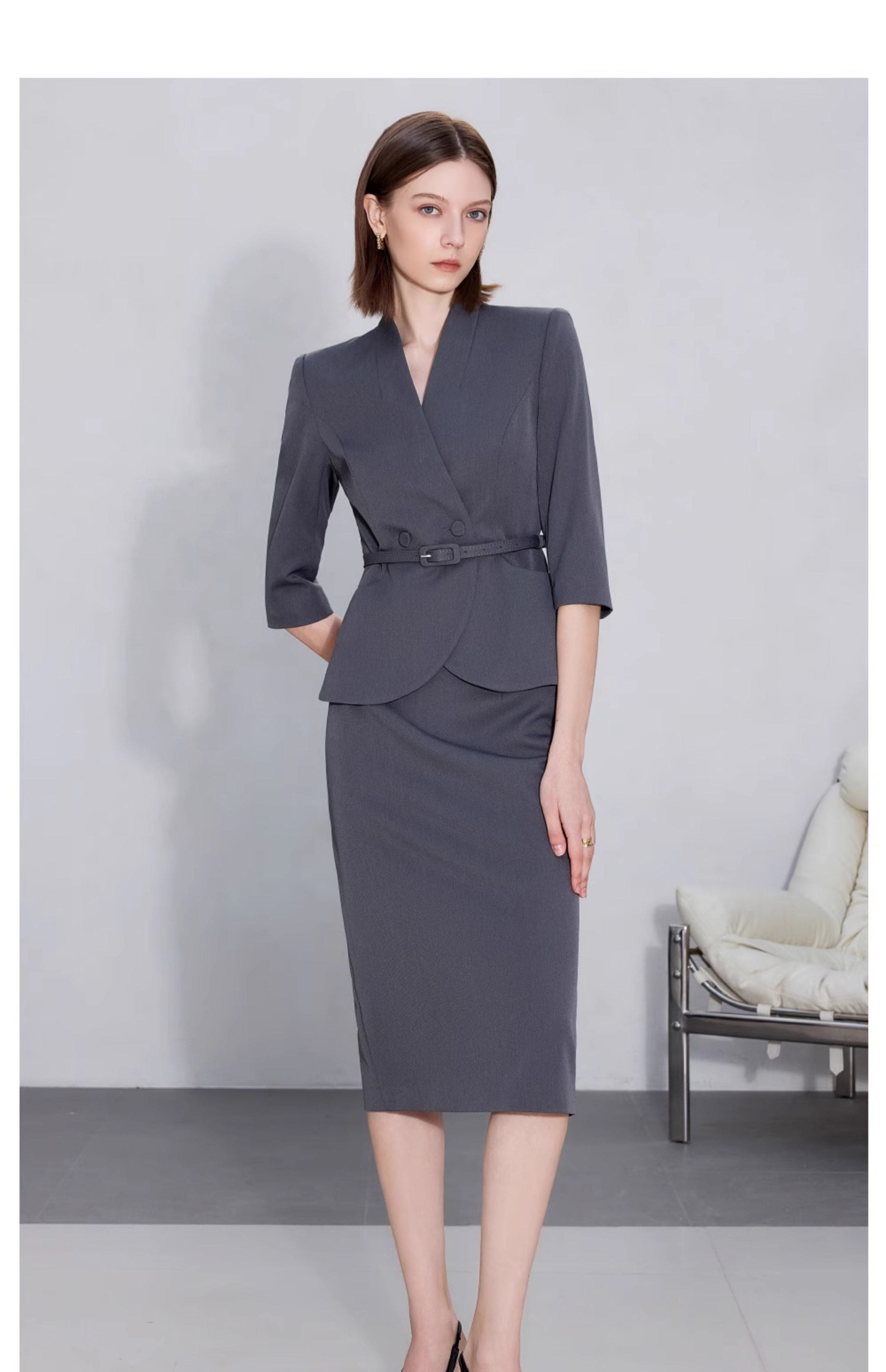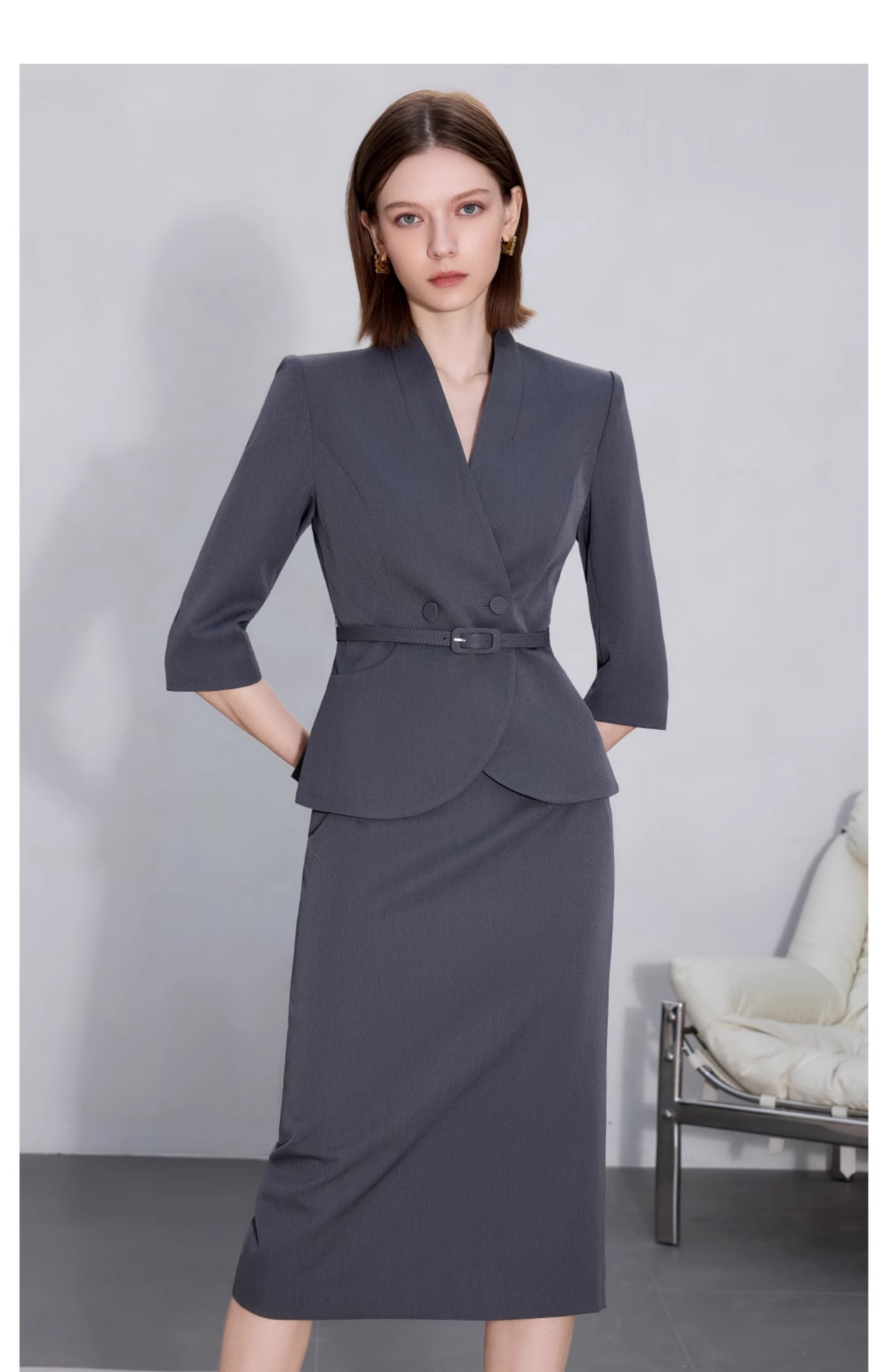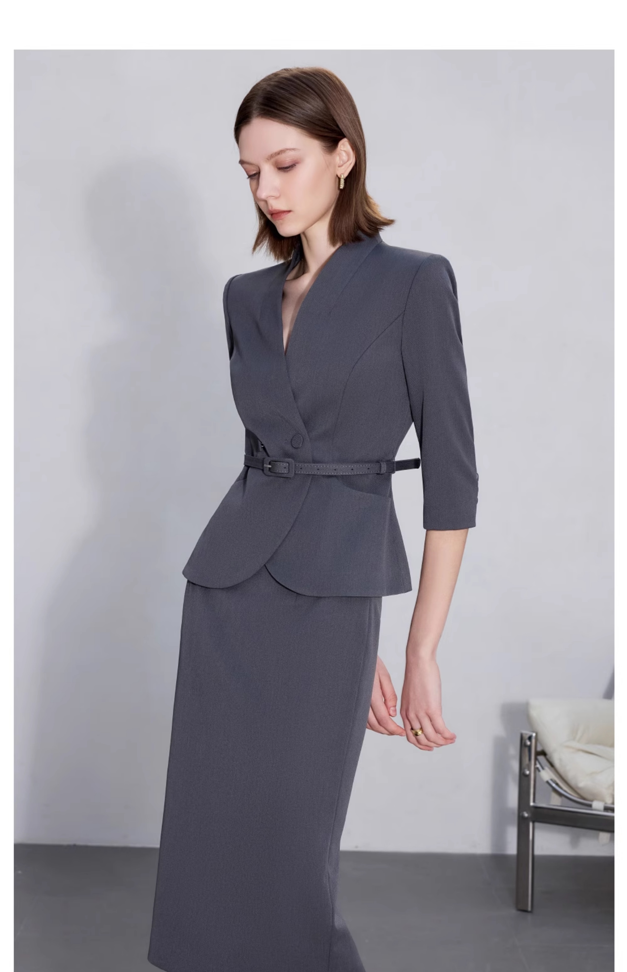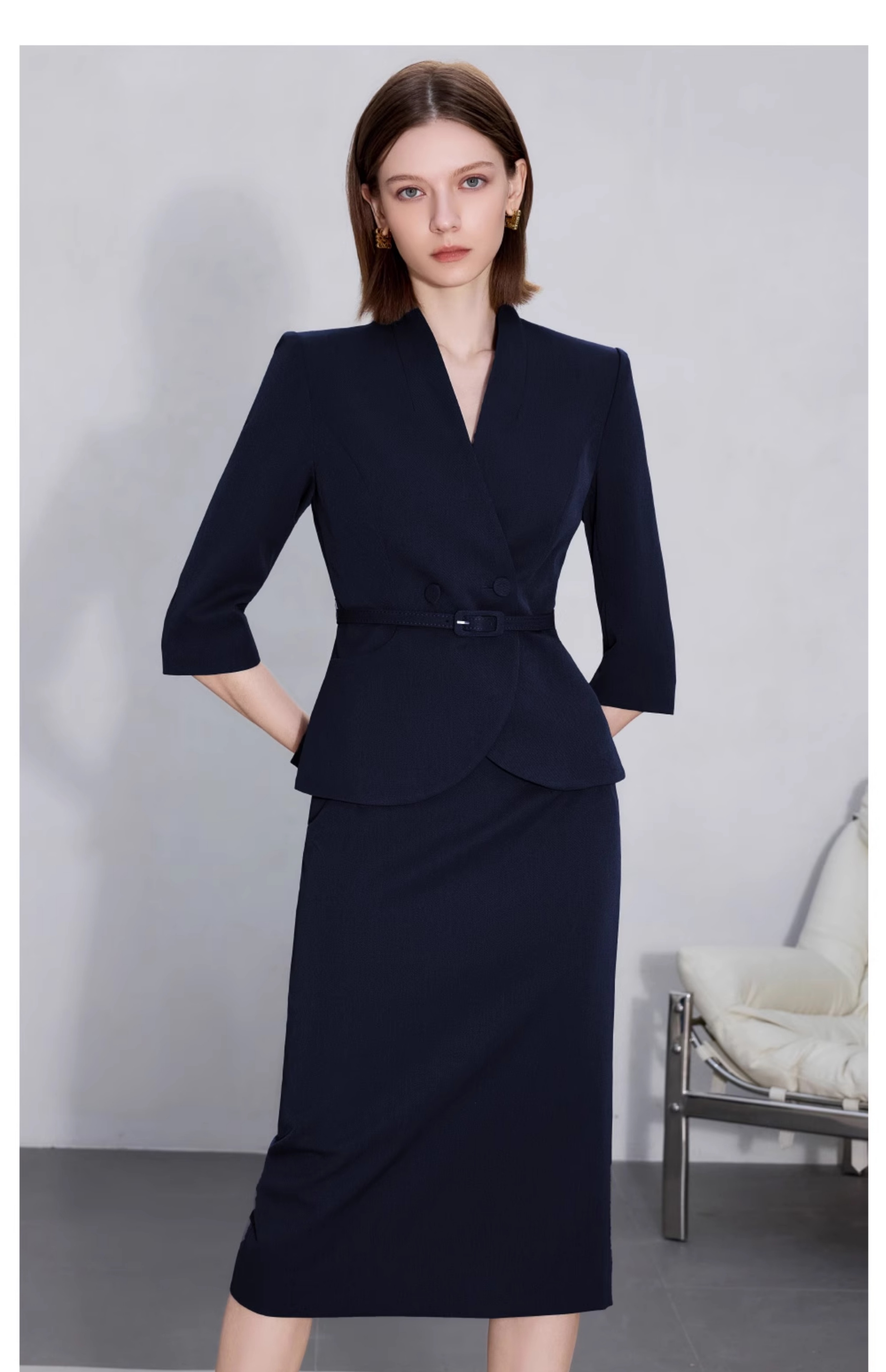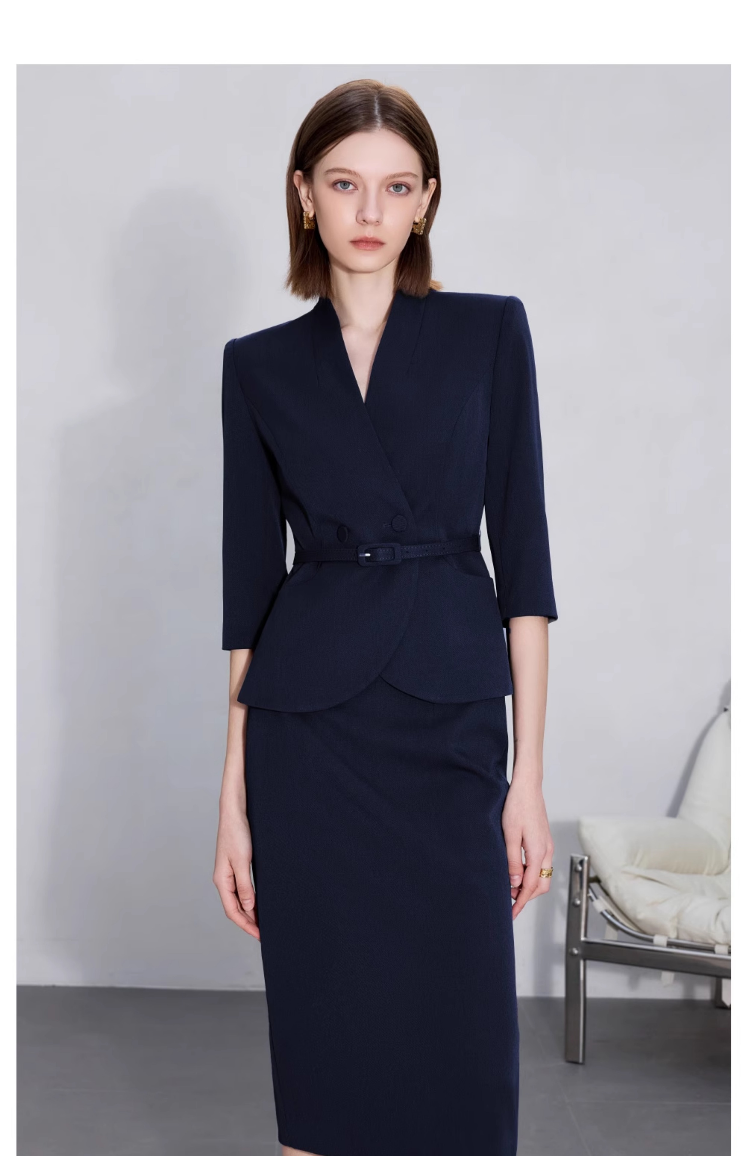 AD职场女装套装2025新款藏青色无领西装套装高级感职业装两件套裙