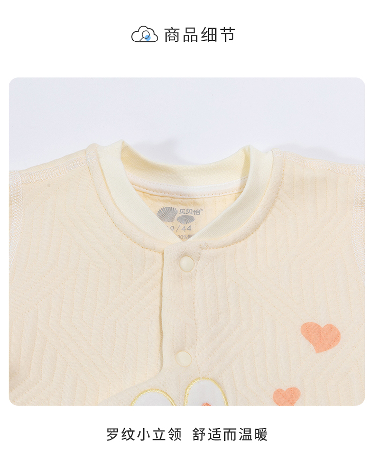 - 贝贝怡专注0-6岁婴幼儿服饰,坚持安全、柔软、舒适的产品理念,为千万中国家庭提供超高品质、安全可靠的婴幼儿服饰产品,妈妈放心,宝宝开心!