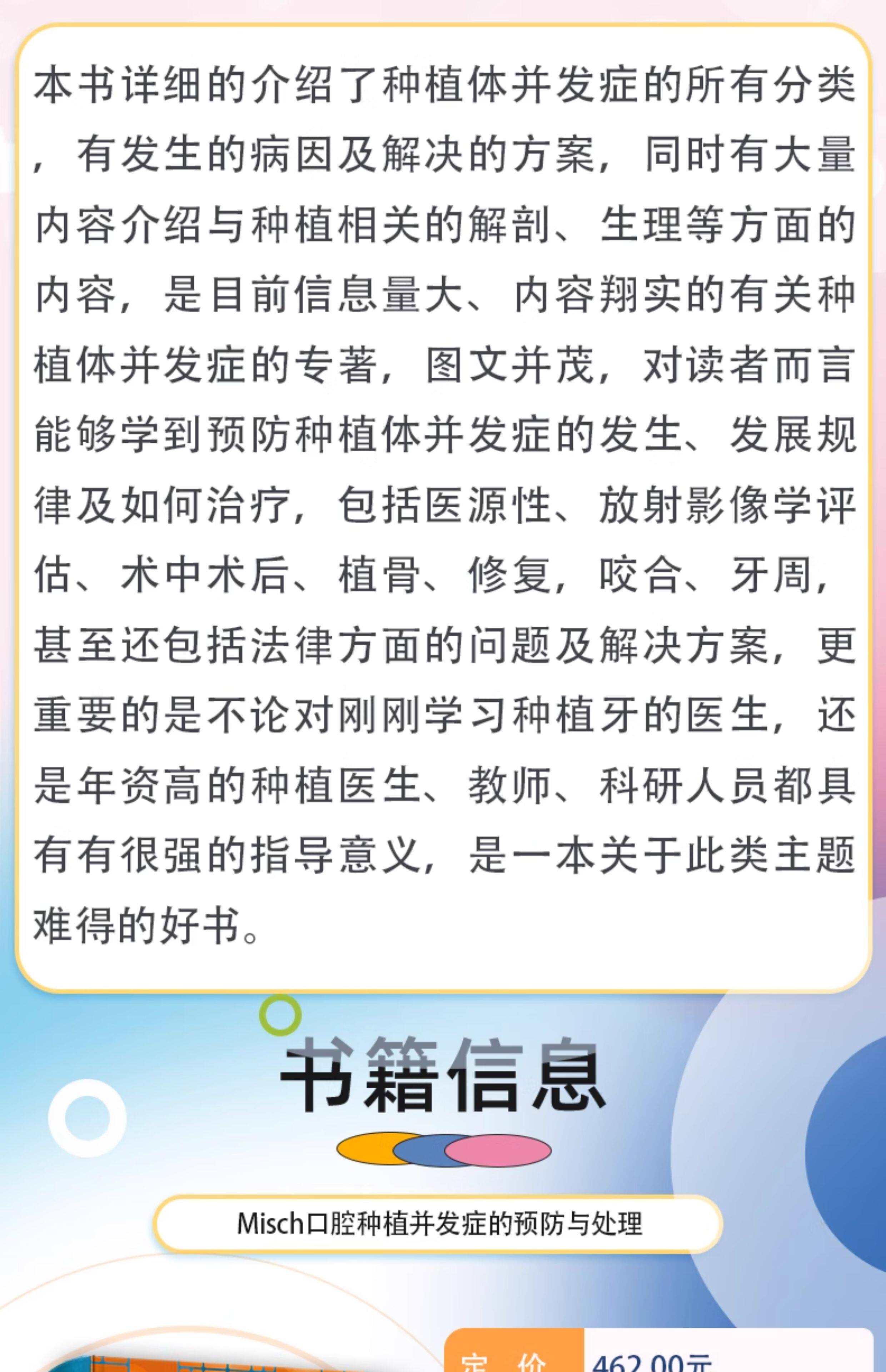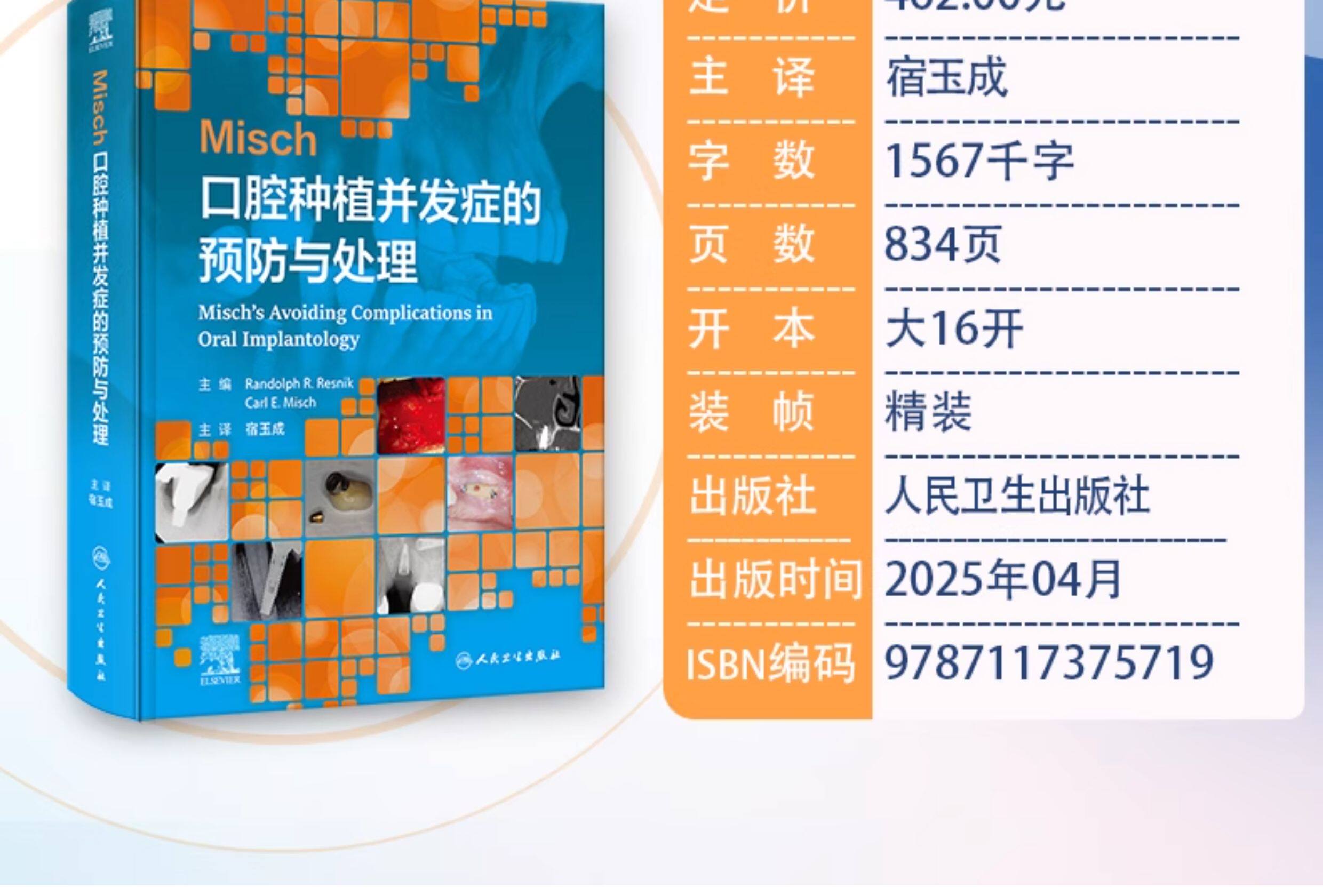 《Misch口腔种植并发症的预防与处理》由Carl E.Misch和Randolph R.Resnik联合编写,是口腔种植领域的经典著作。全书19章,涵盖诊断、治疗、手术、修复、牙周维护及医疗法律问题, 覆盖种植并发症。Misch博士是种植学巨擘,其理论和经验传承于本书。Resnik博士凭借丰富经验,为本书提供宝贵知识。本书强调预防并发症,每章深入探讨病因、预防和处理方法,为临床医生提供了 且实用的指导。书中包含1000多幅高质量图片和插图,清晰展示并发症及其解决方法。并发症管理建议由世界知名专家开发,提供实用指导。本书为种植医生提供 、科学的管理框架,适合各阶段医生。它不仅能帮助医生提升专业素养,减少临床并发症,还能守护患者口腔健康,是种植医生 的参考资料。