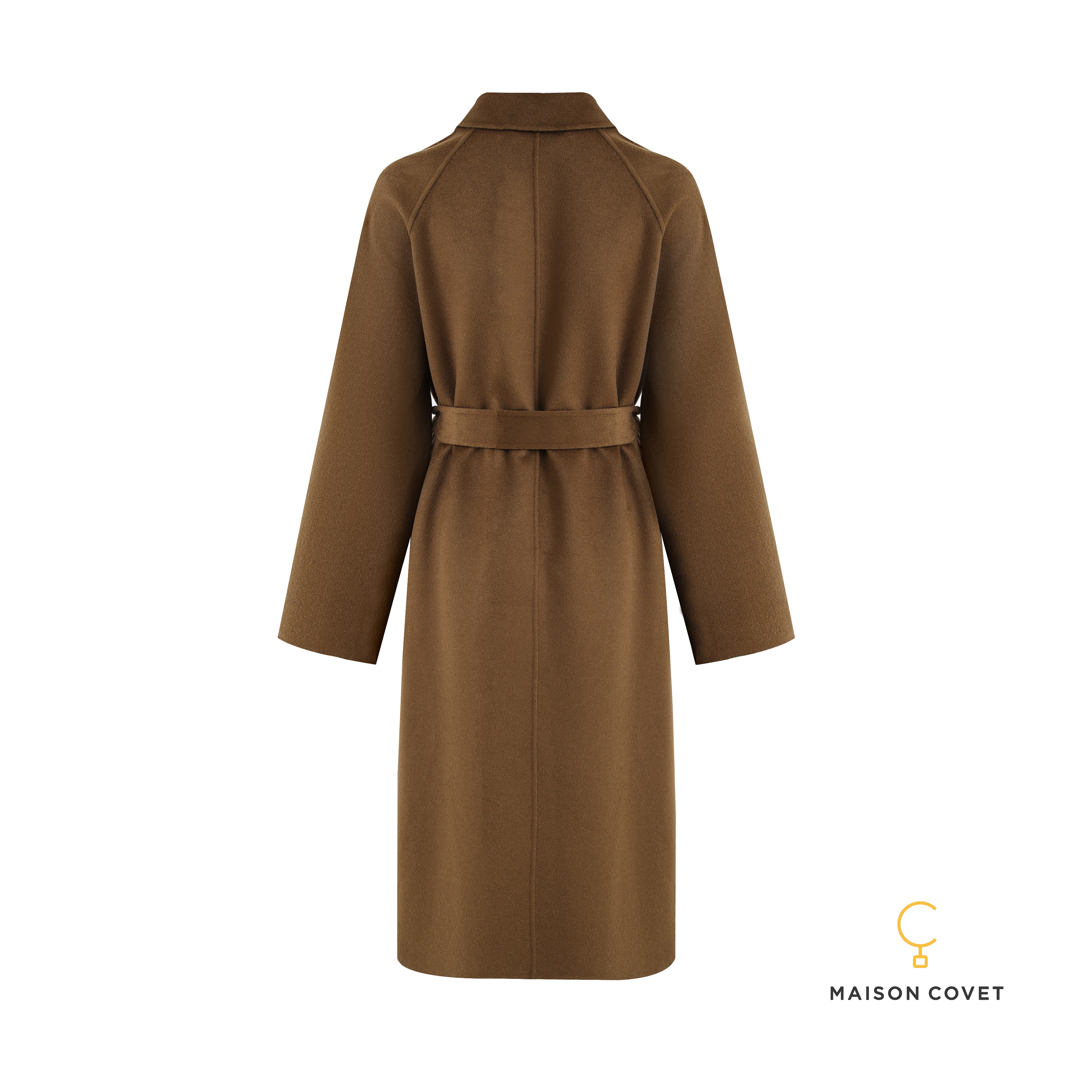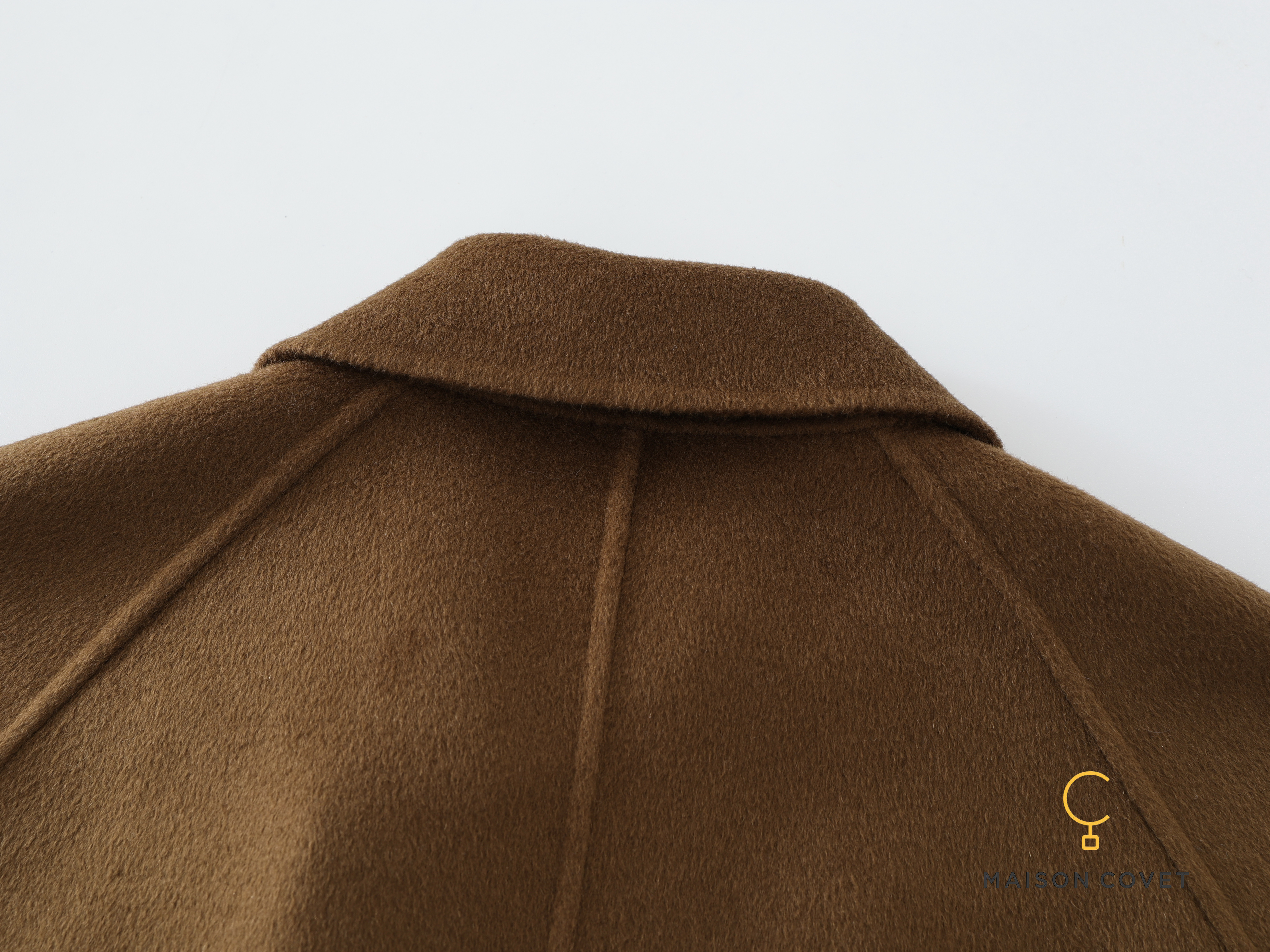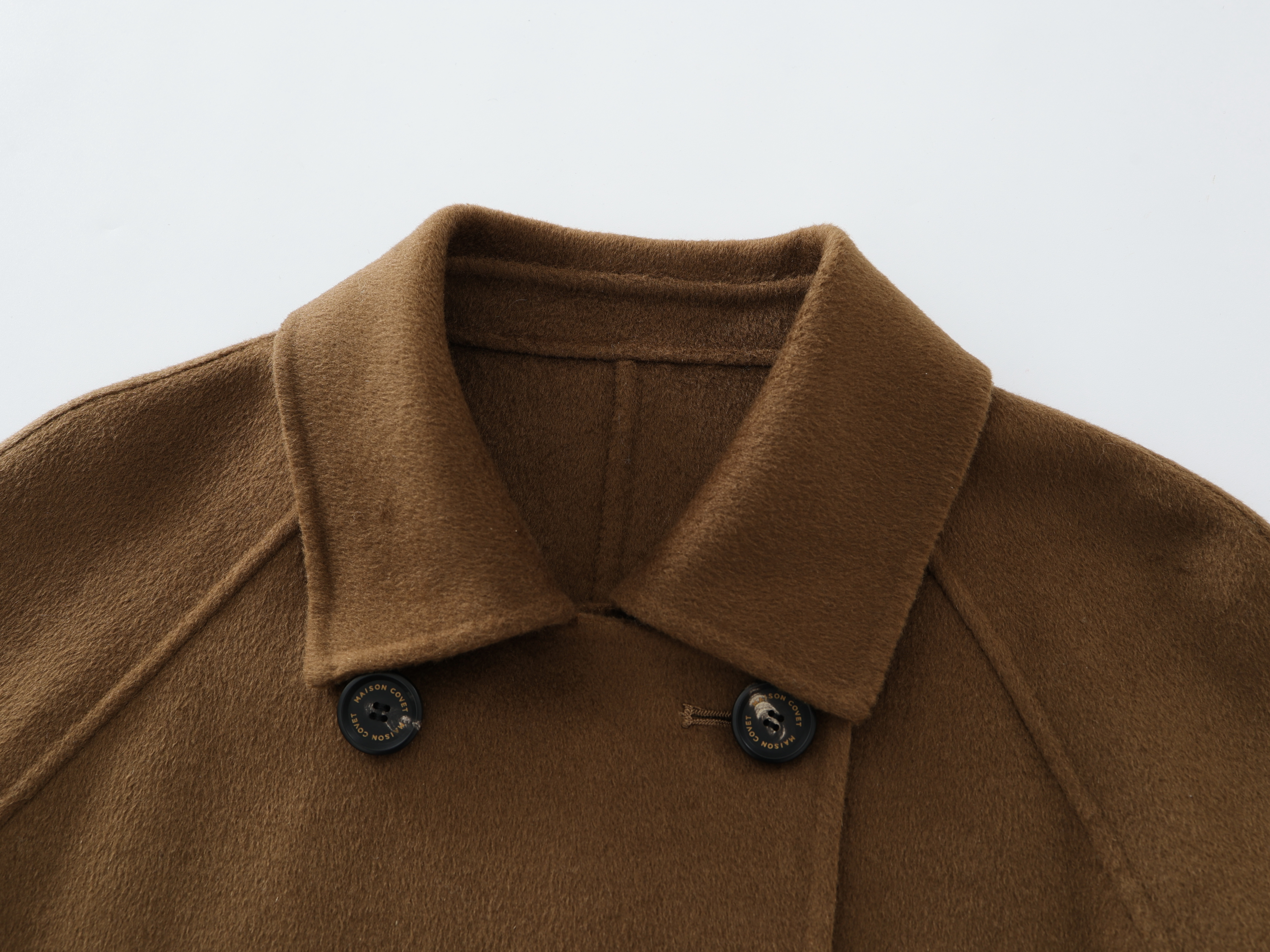 此款大衣采用手工缝双面纯山羊绒面料制成