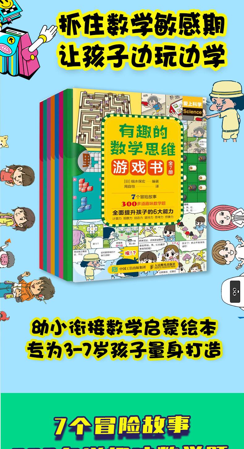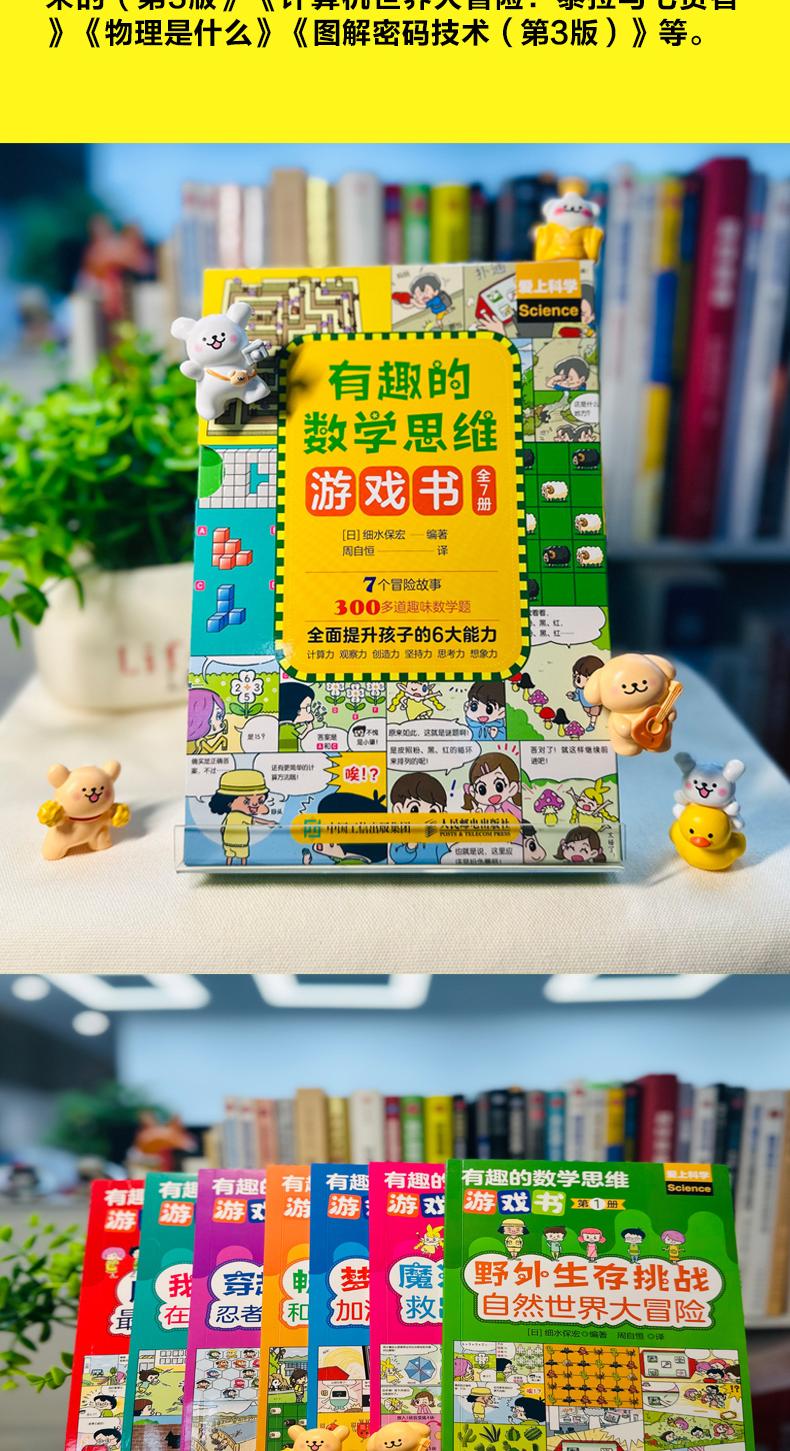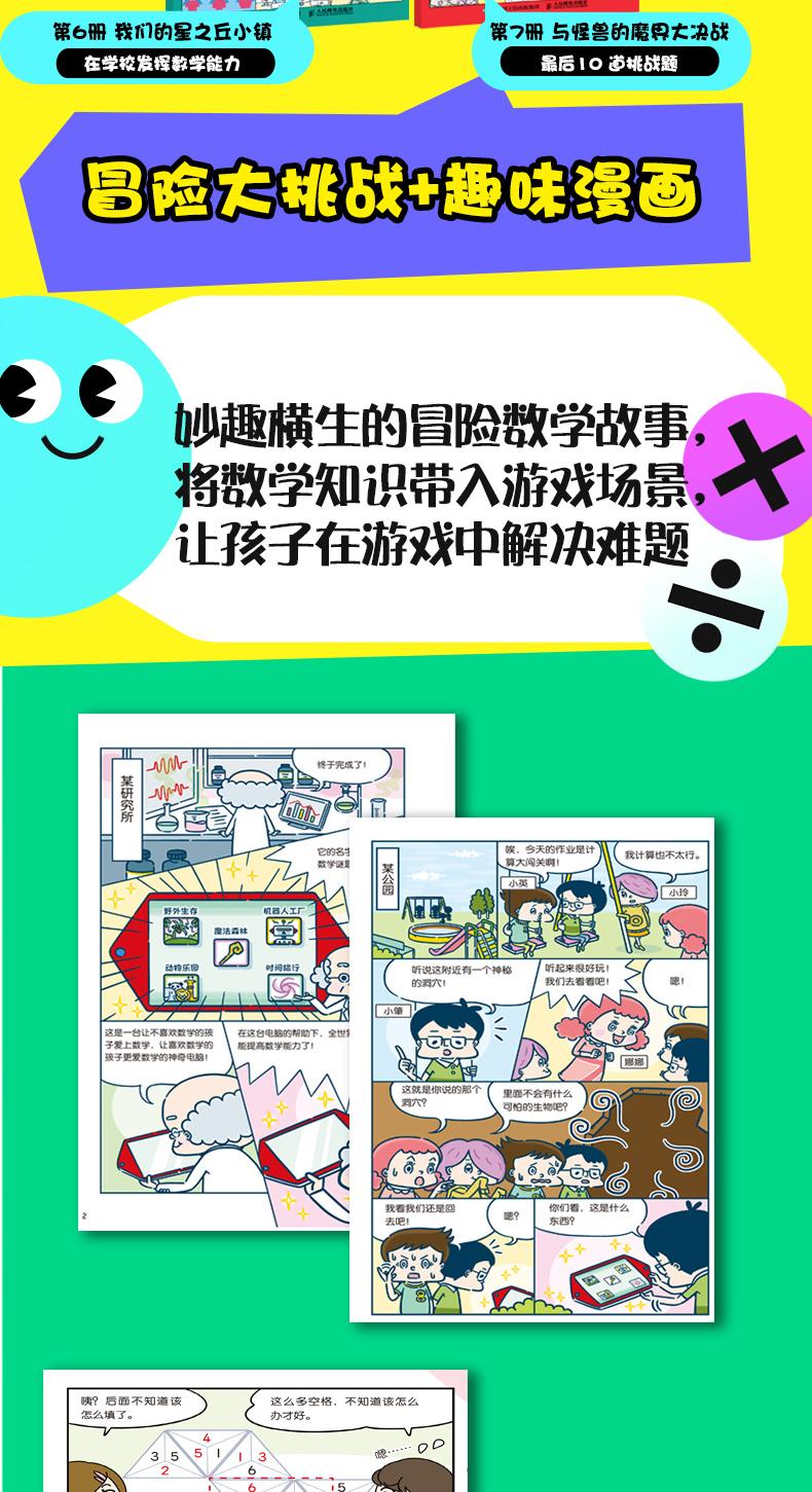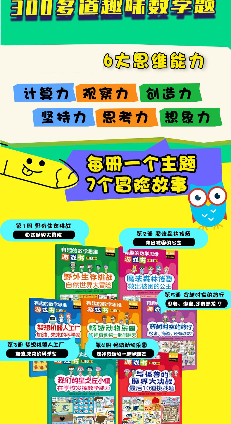 《有趣的数学思维游戏书》是一套关于儿童数学思维启蒙的漫画故事书。全套书共7 册,以激发孩子学数学的兴趣、启发孩子的数学思维为出发点,设计了7 个充满趣味的漫画探险故事,例如:野外生存大挑战,在魔法森林中拯救被困公主,参观机器人工厂,畅游动物乐园,穿越到恐龙世界,与魔界大反派决战,等等。在每个冒险故事中,小主人公们只有解开一个又一个的数学谜题,才能顺利通关。本套书引导孩子用数学的视角感知世界,培养孩子的数学思维,让数学学习变得更有趣。本套书适合3*9岁孩子阅读。