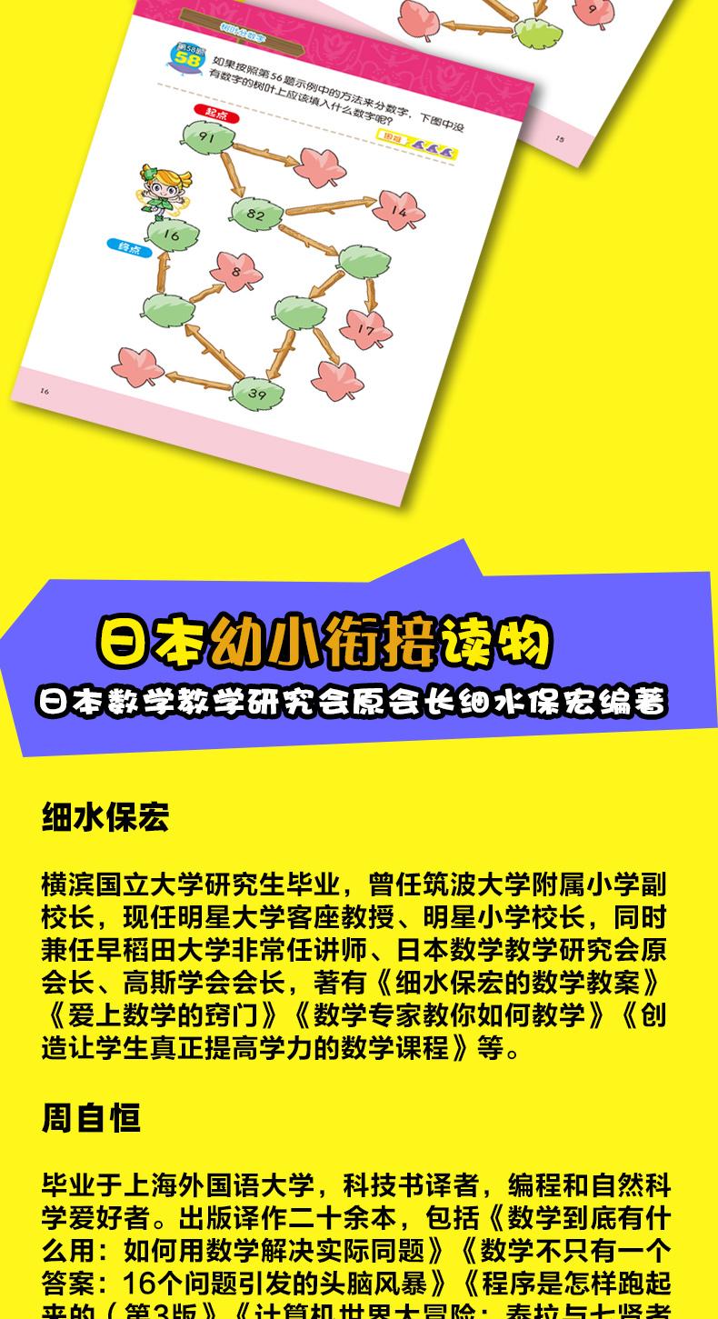 细水保宏:横滨国立大学研究生毕业,曾任筑波大学附属小学副校长,现任明星大学 客座教授、明星小学校长,同时兼任早稻田大学非常任讲师、日本数学教学研究会原会长、高斯学会会长,著有《细水保宏的数学教案》《爱上数学的窍门》《数学*教你如何教学》《创造让学生真正提高学力的数学课程》等。 周自恒:毕业于上海外国语大学,科技*书译者,编程和自然科学爱好者。出版译作二十余本,包括《数学到底有什么用:如何用数学解决实际同题》《数学不只有一个答 案:16个问题引发的头脑风暴》《程序是怎样跑起来的(第3版》《计算机世界大冒险:泰拉与七贤者》《物理是什么》《图解密码技术(第3版)》等。
