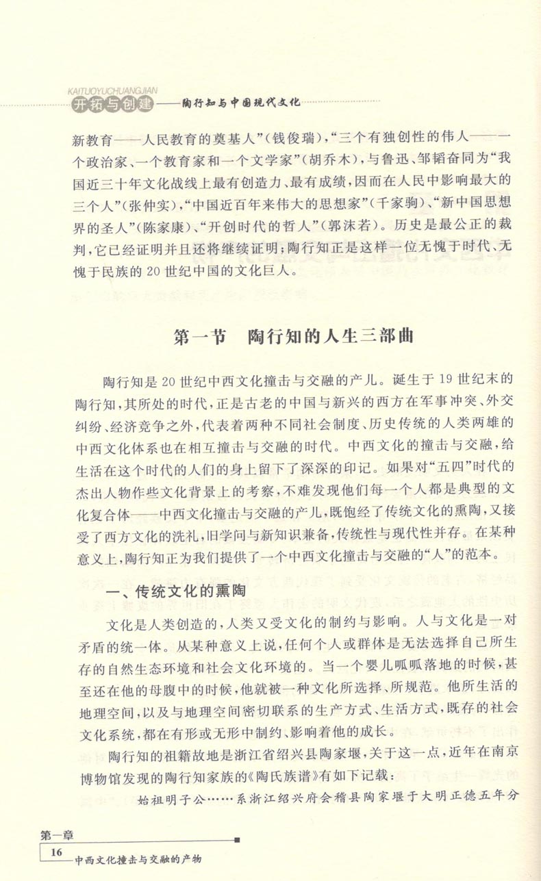 本书与传统的从教育角度研究陶行知的做法不同,另辟蹊径,以“开拓与创新”为主线,以“人物活动”为基点,以20世纪中西文化碰撞与交融为背景,从文化视角对陶行知一生的事业、思想和人格做了整体考察,不仅探讨了陶行知对近现代中国教育改革的重大贡献,而且还从语言文字、大众艺术、科学普及、新闻出版、对外影响等方面,研究了陶行知对中国现代文化诸多领域的开拓与创建,提出了“陶行知是20世纪综合性的文化伟人”这一最新论断。本书开辟了教育家研究的新视角,提出了陶行知研究的新观点,还在人物研究方法论上做出了新探索,形成了独具特色的“历史、比较、系统和心理分析综合研究法”。