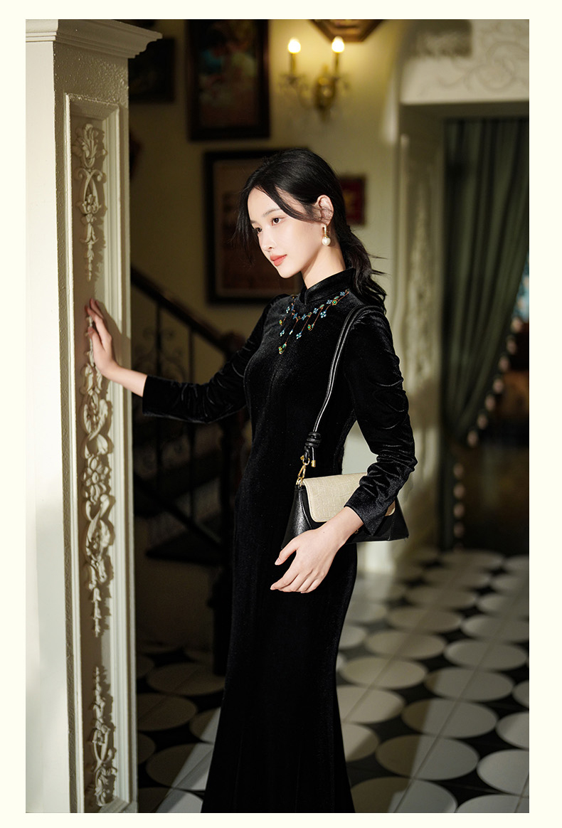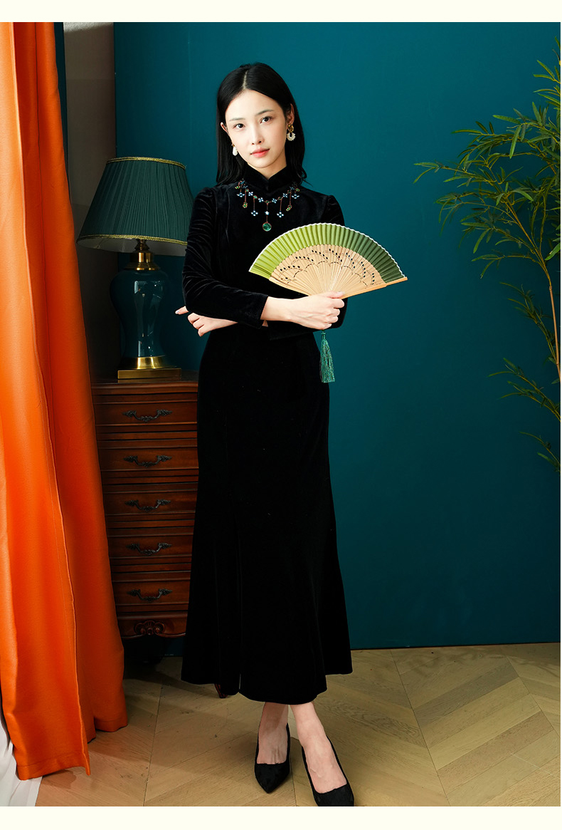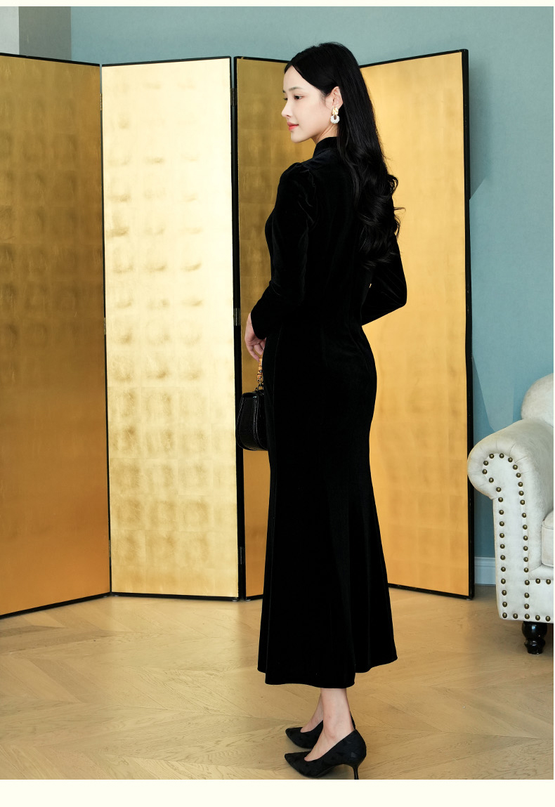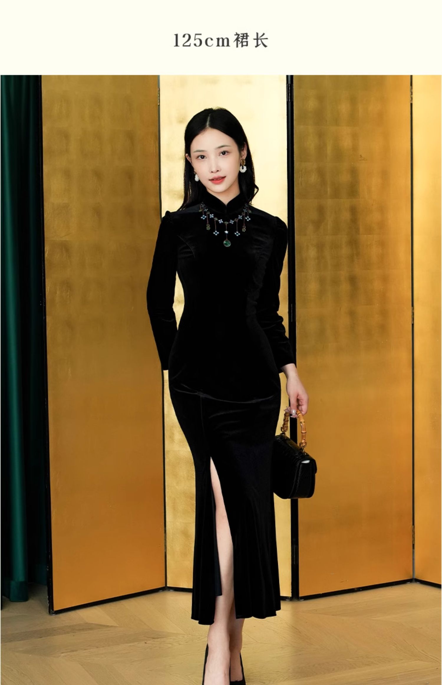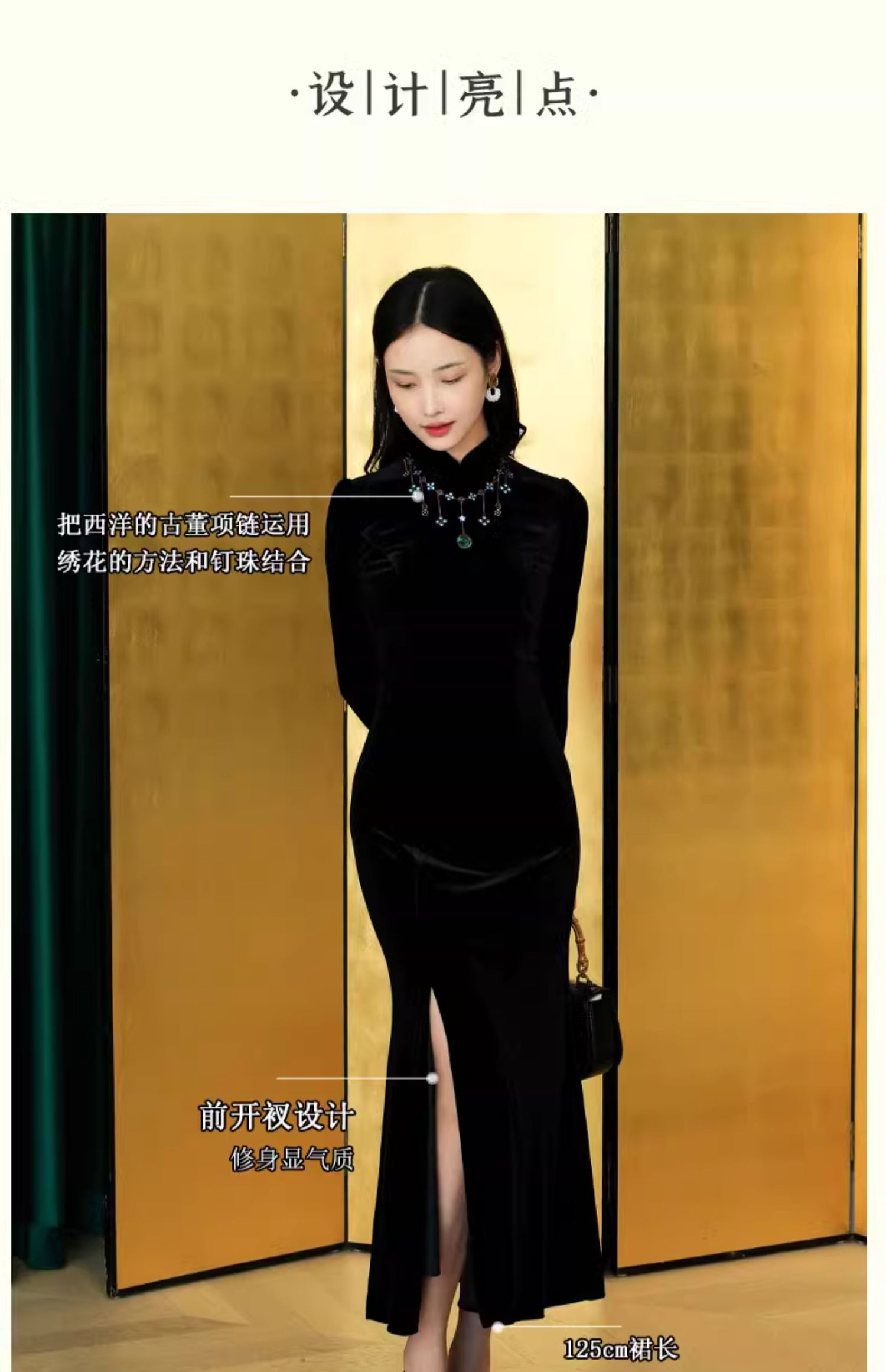 上海逸红颜梳影2025年秋冬新款丝绒新中式刺绣项链开衩鱼尾连衣裙
