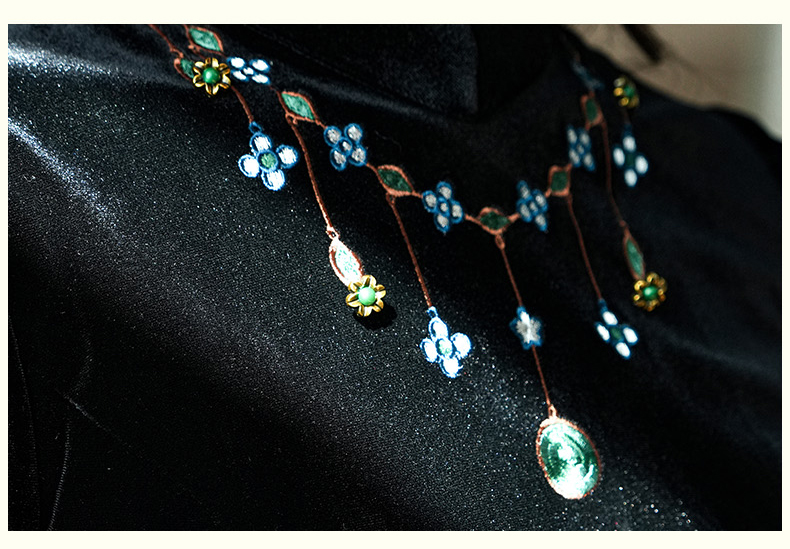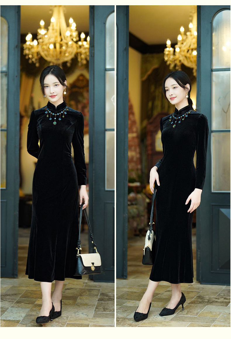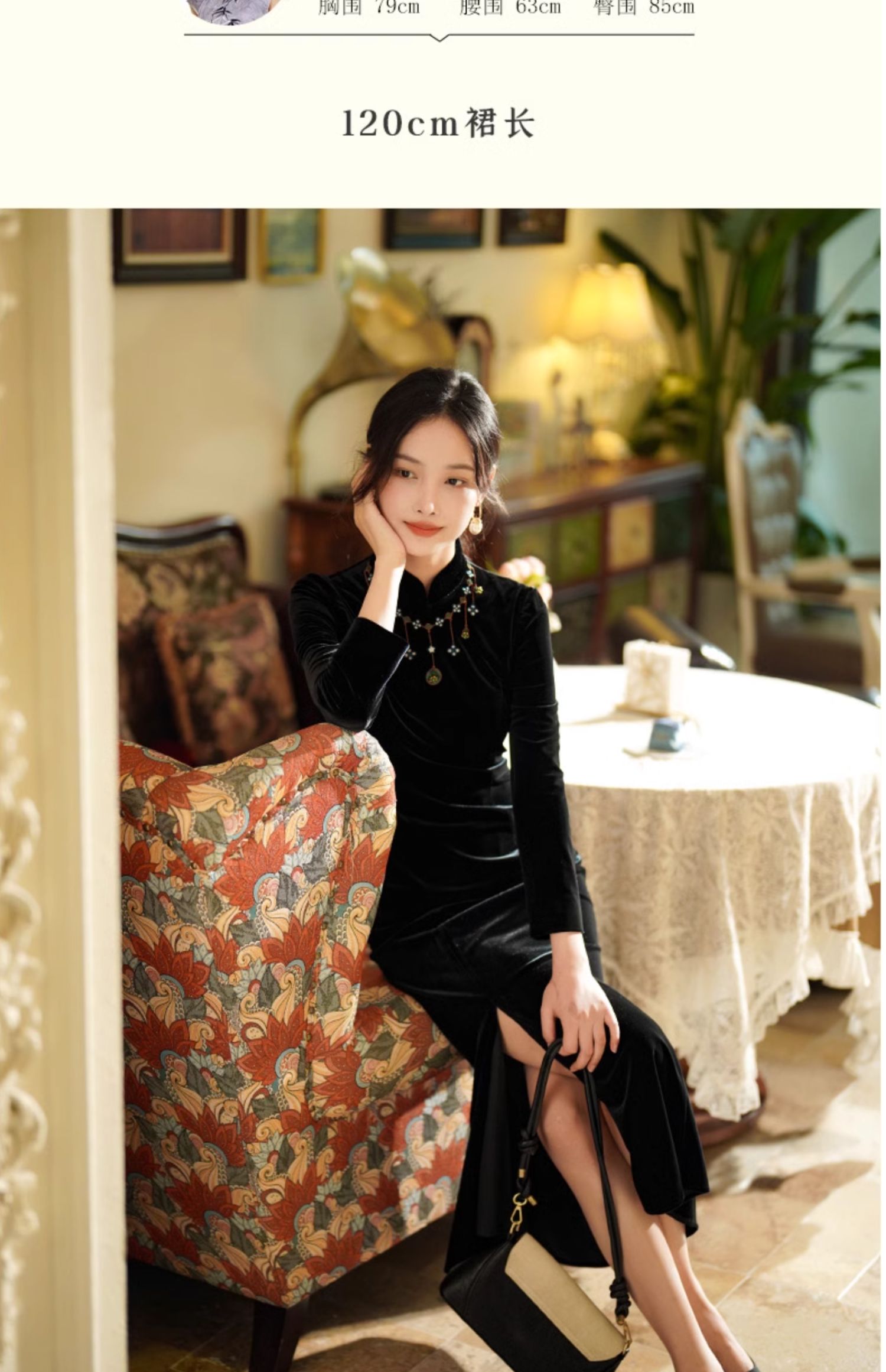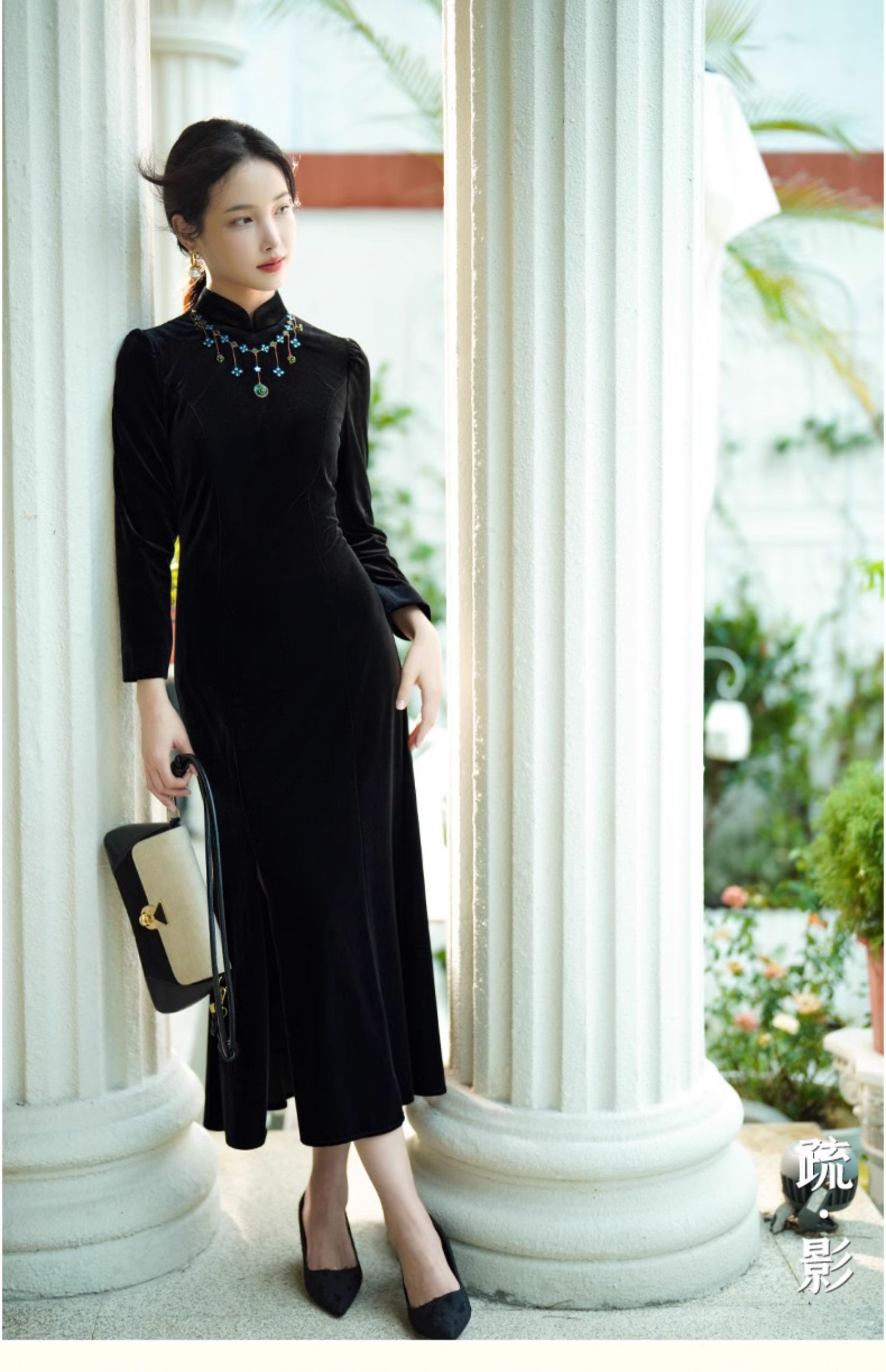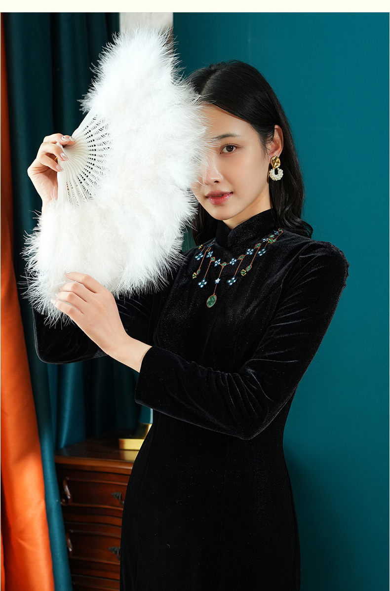 上海逸红颜梳影2025年秋冬新款丝绒新中式刺绣项链开衩鱼尾连衣裙