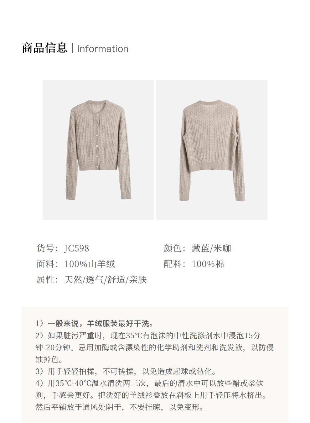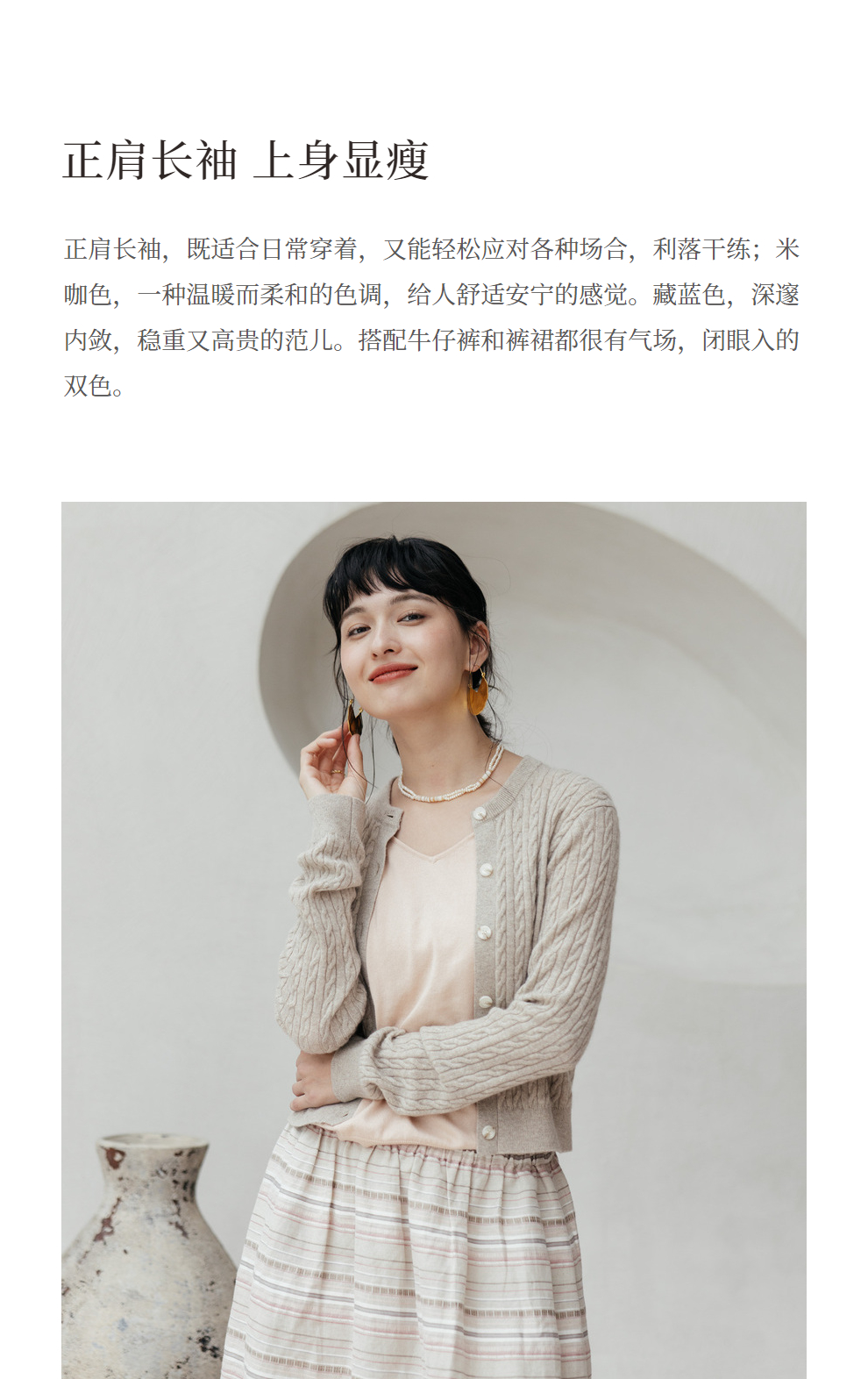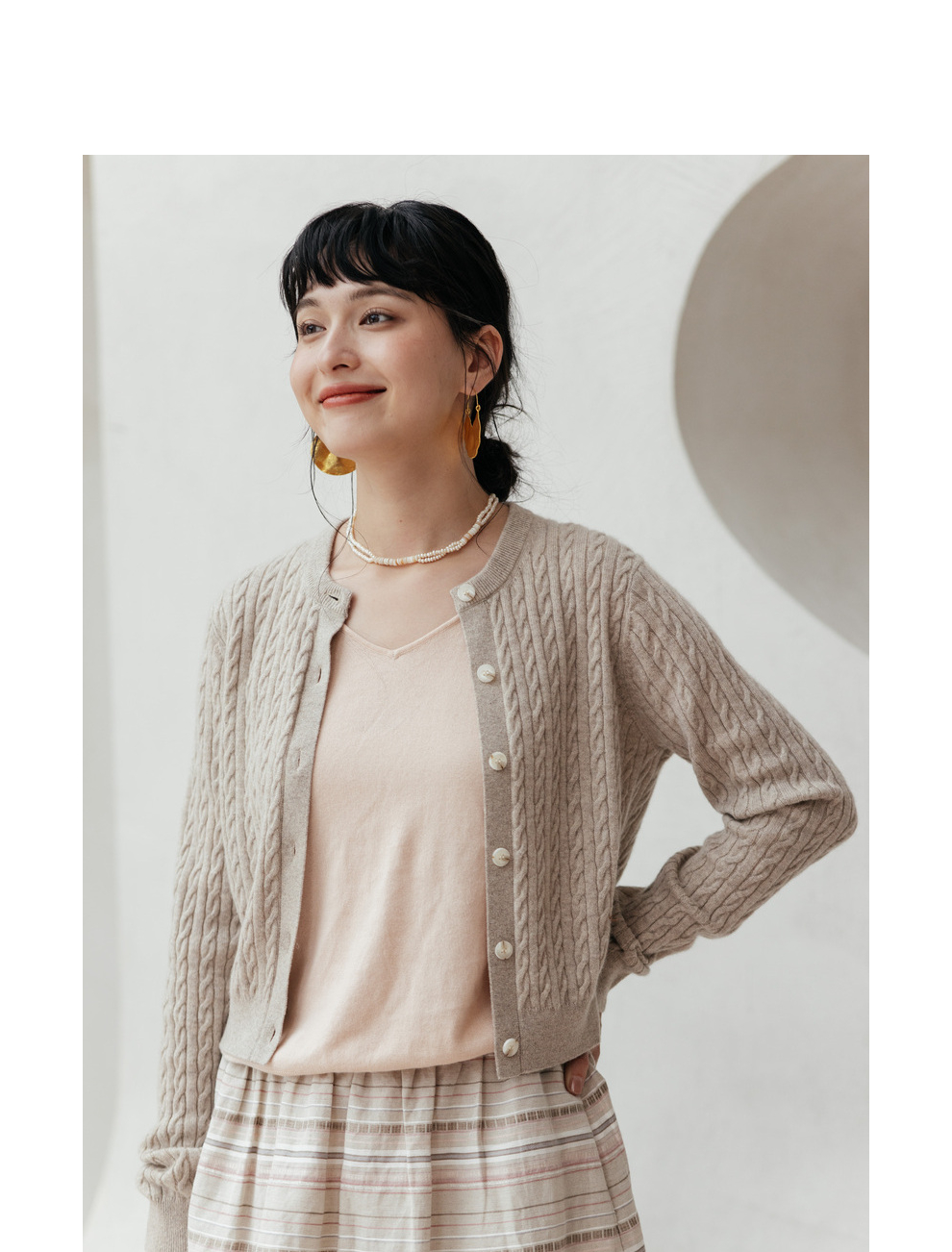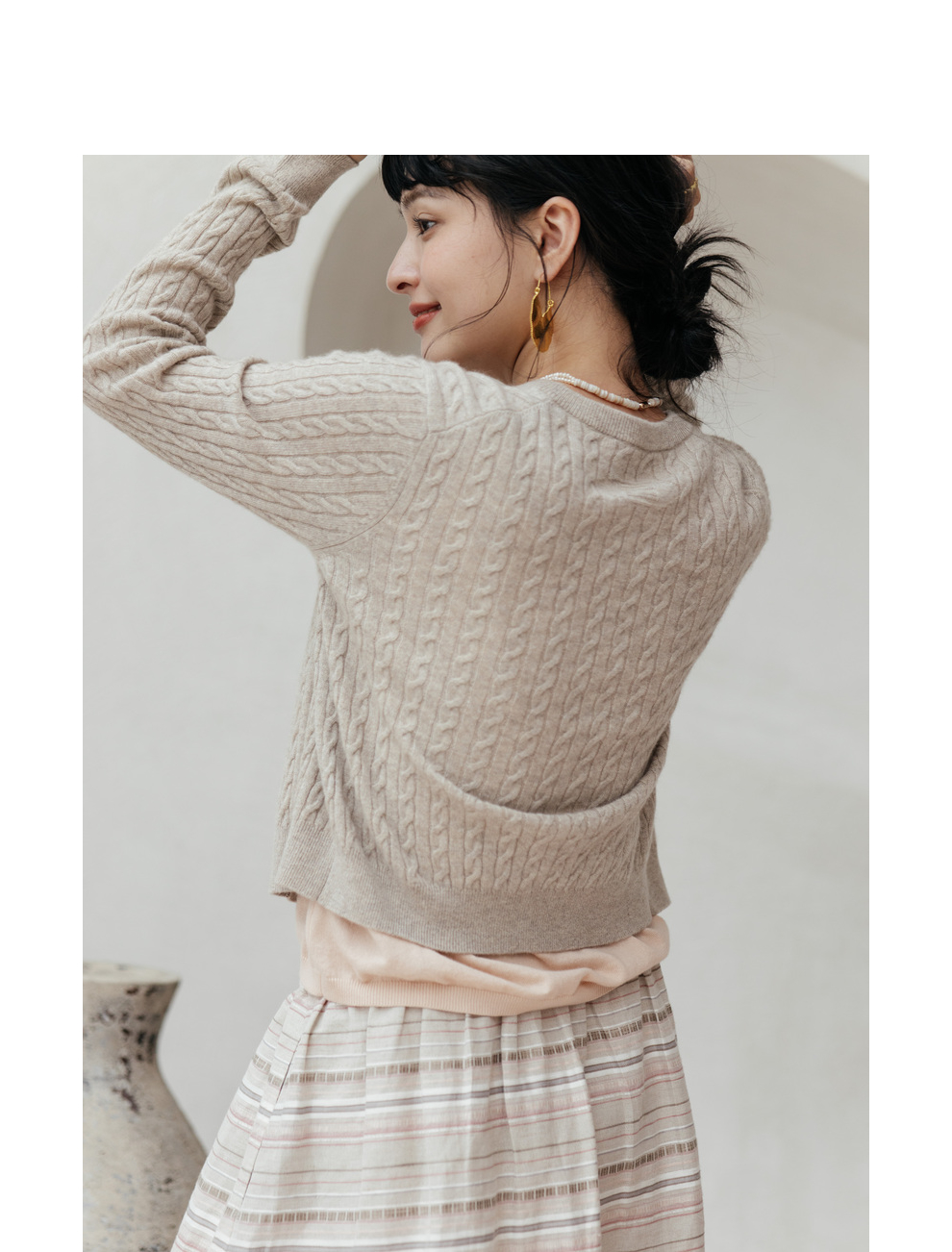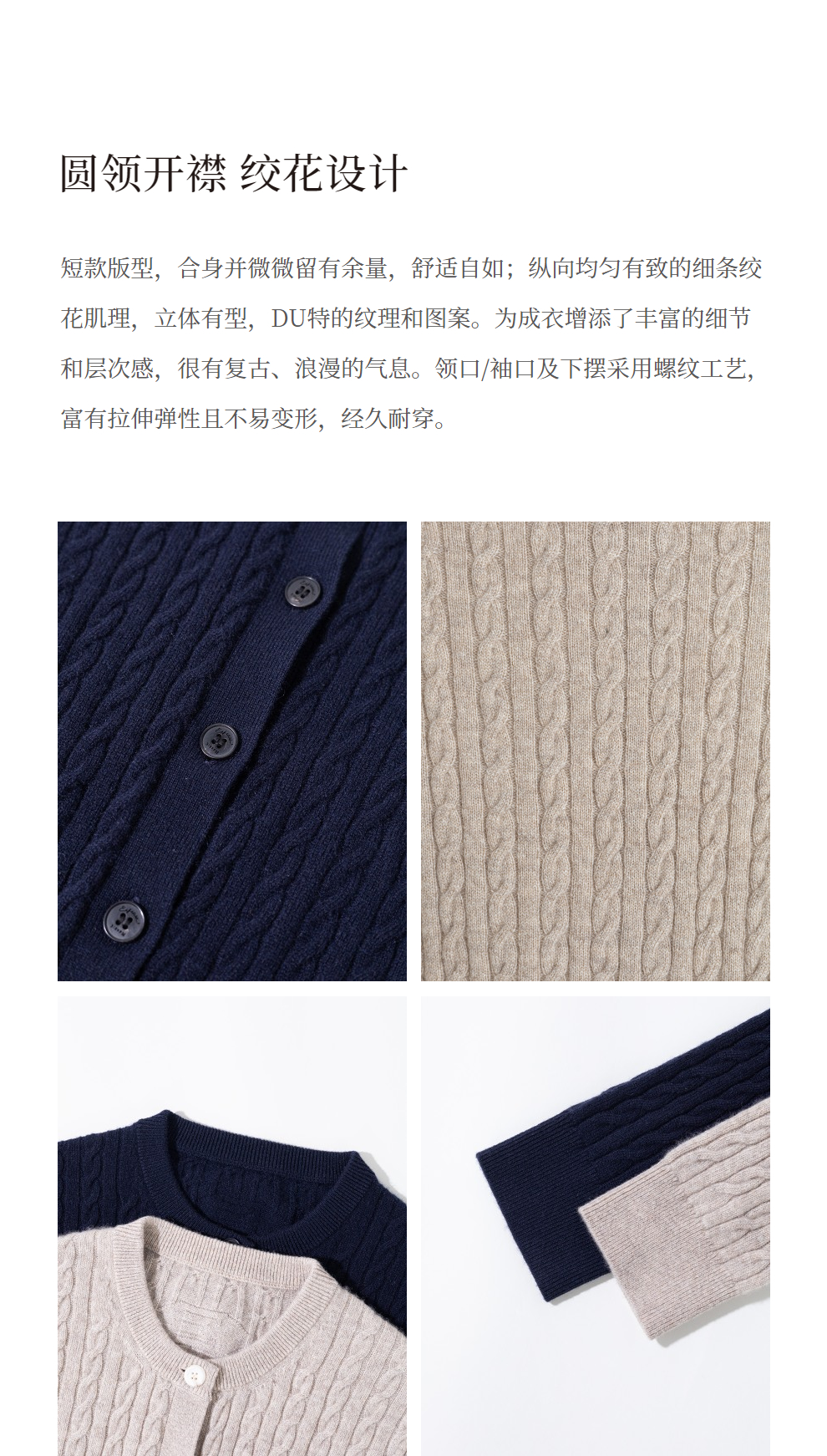 绽放旅行女装598朵/100%山羊绒绞花感正肩长袖圆领显瘦开襟针织衫