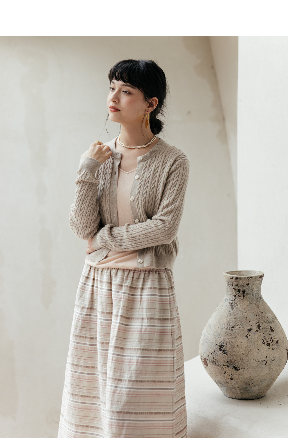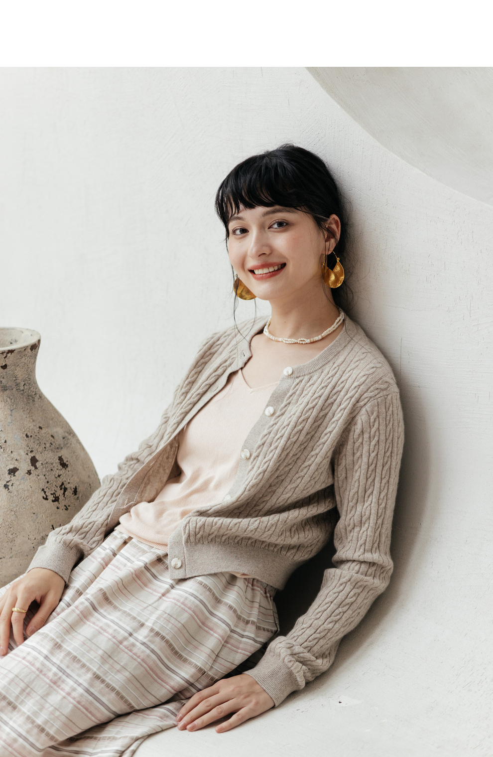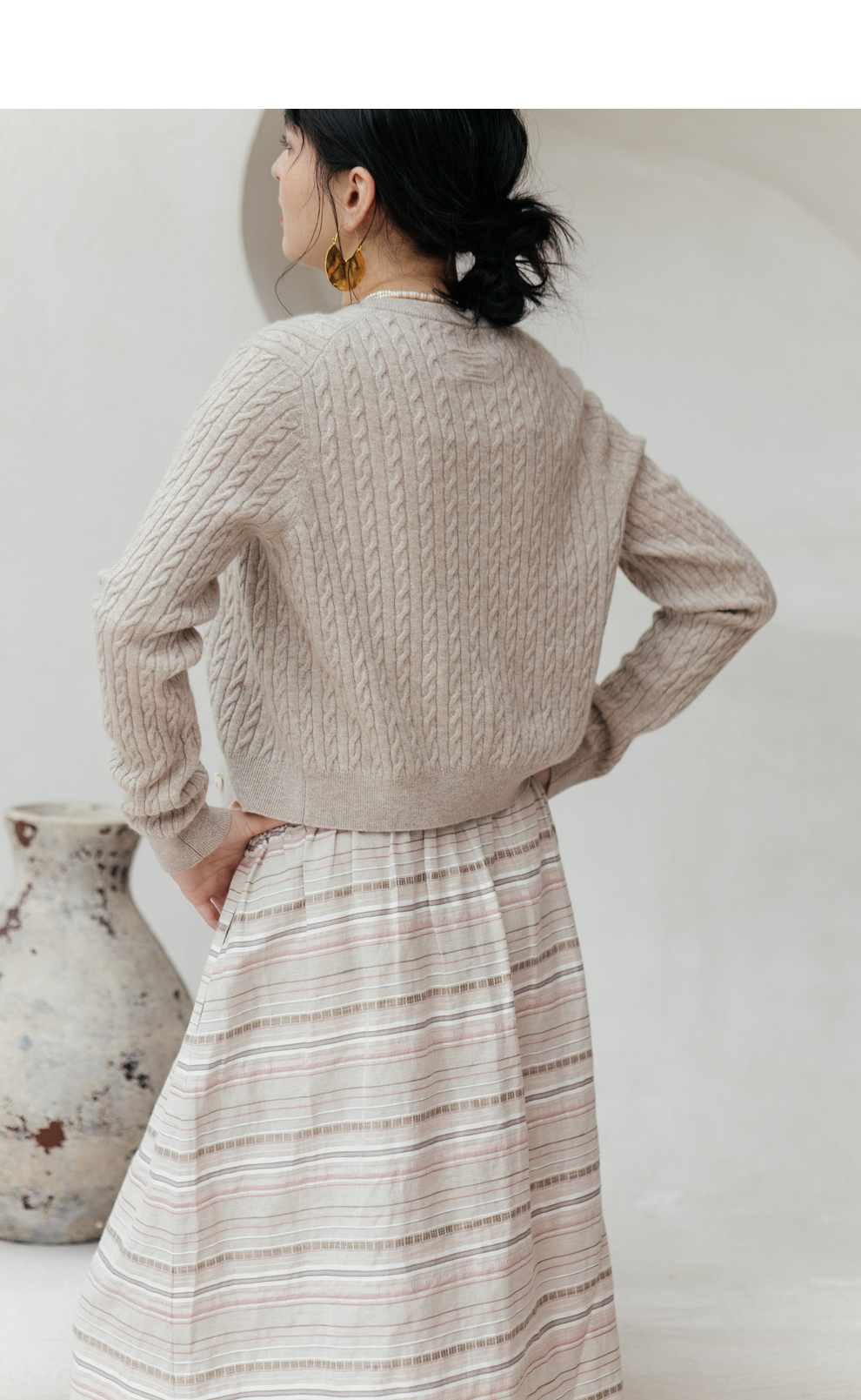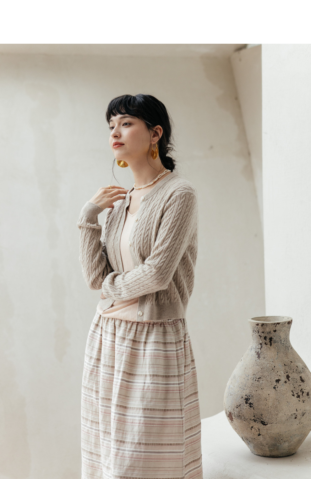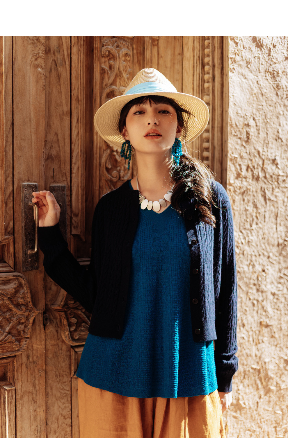 绽放旅行女装598朵/100%山羊绒绞花感正肩长袖圆领显瘦开襟针织衫