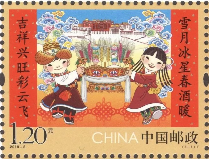 该套邮票是《拜年》系列的第五套。邮票主图为“欢欢”“喜喜”,背景衬以位于西藏拉萨的布达拉宫。“欢欢”和“喜喜”身着藏族传统服饰,手捧象征吉祥的切玛,在藏民族聚居区向全国各族人民拜年。画面两侧楹联文字为“雪月冰星春酒暖 吉祥兴旺彩云飞”。整个画面轻松愉悦,洋溢着新年的喜庆气氛。
