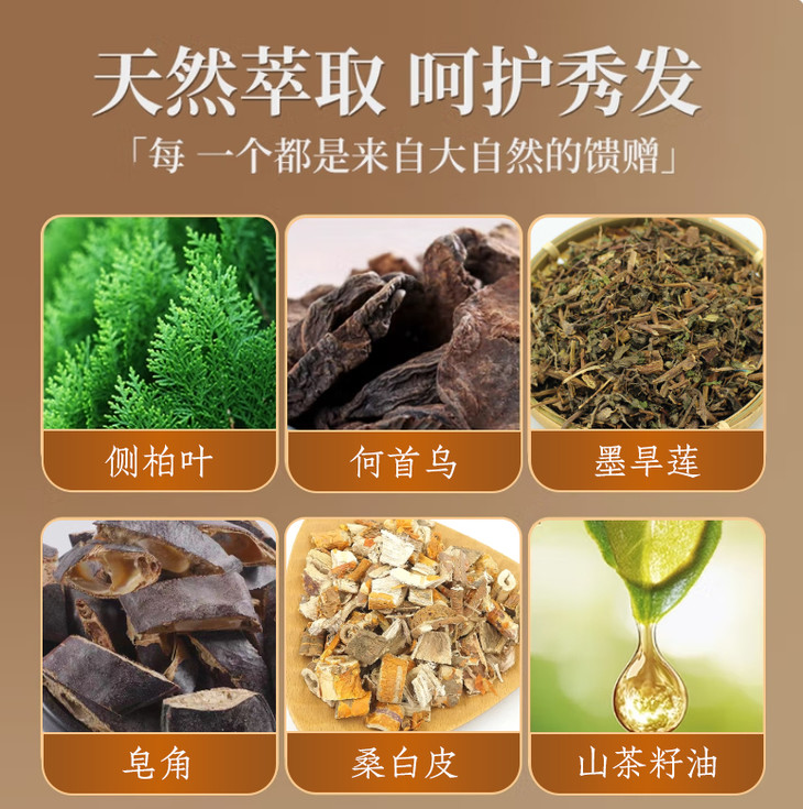 【成分】侧柏叶、制首乌、骨碎补、女贞子、桑白皮、墨旱莲、皂角、川芎、生姜、乌斯曼草、金银花根提取液,甘油、橄榄油、茶油等。