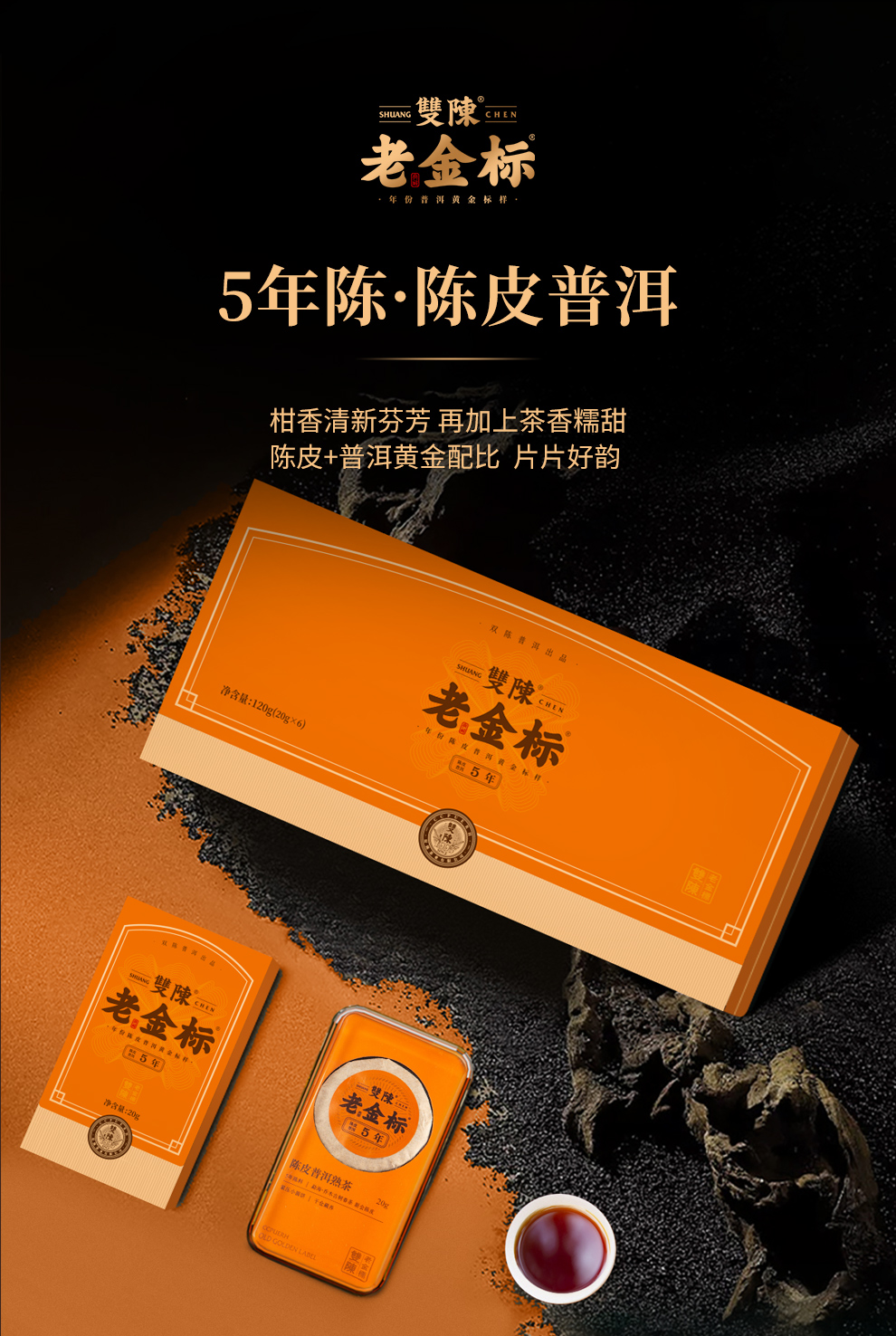双陈老金标5年陈皮普洱熟茶勐海古树春茶新会陈皮120g/盒送礼品饮甘甜片片好韵办公旅行装