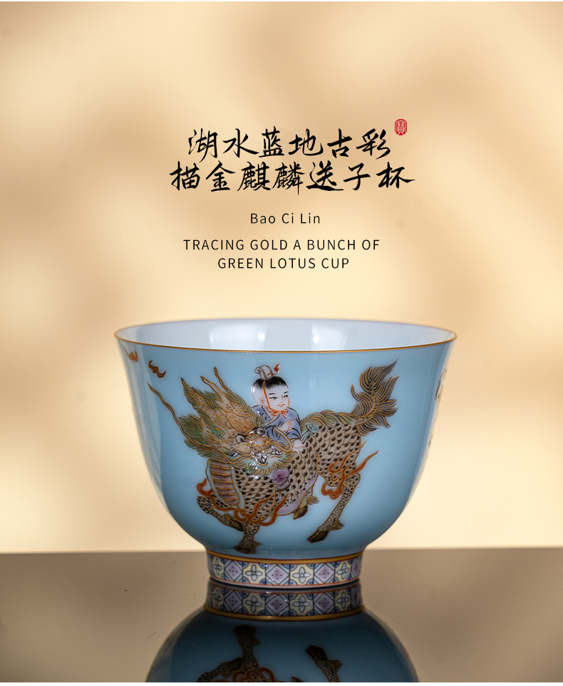 湖水蓝地古彩描金麒麟送子杯 商品图1