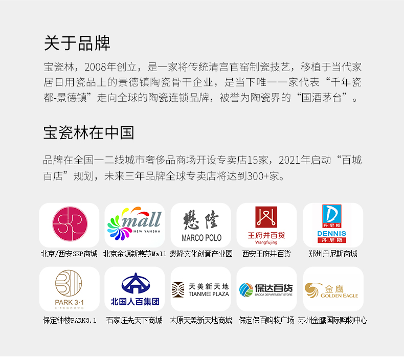 宝瓷林,2008年创立,是一家将传统清宫官窑制瓷技艺,移植于当代家居日用瓷品上的景德镇陶瓷骨干企业,是当下唯一一家代表“千年瓷都-景德镇”走向全球的陶瓷连锁品牌,被誉为陶瓷界的“国酒茅台”。
