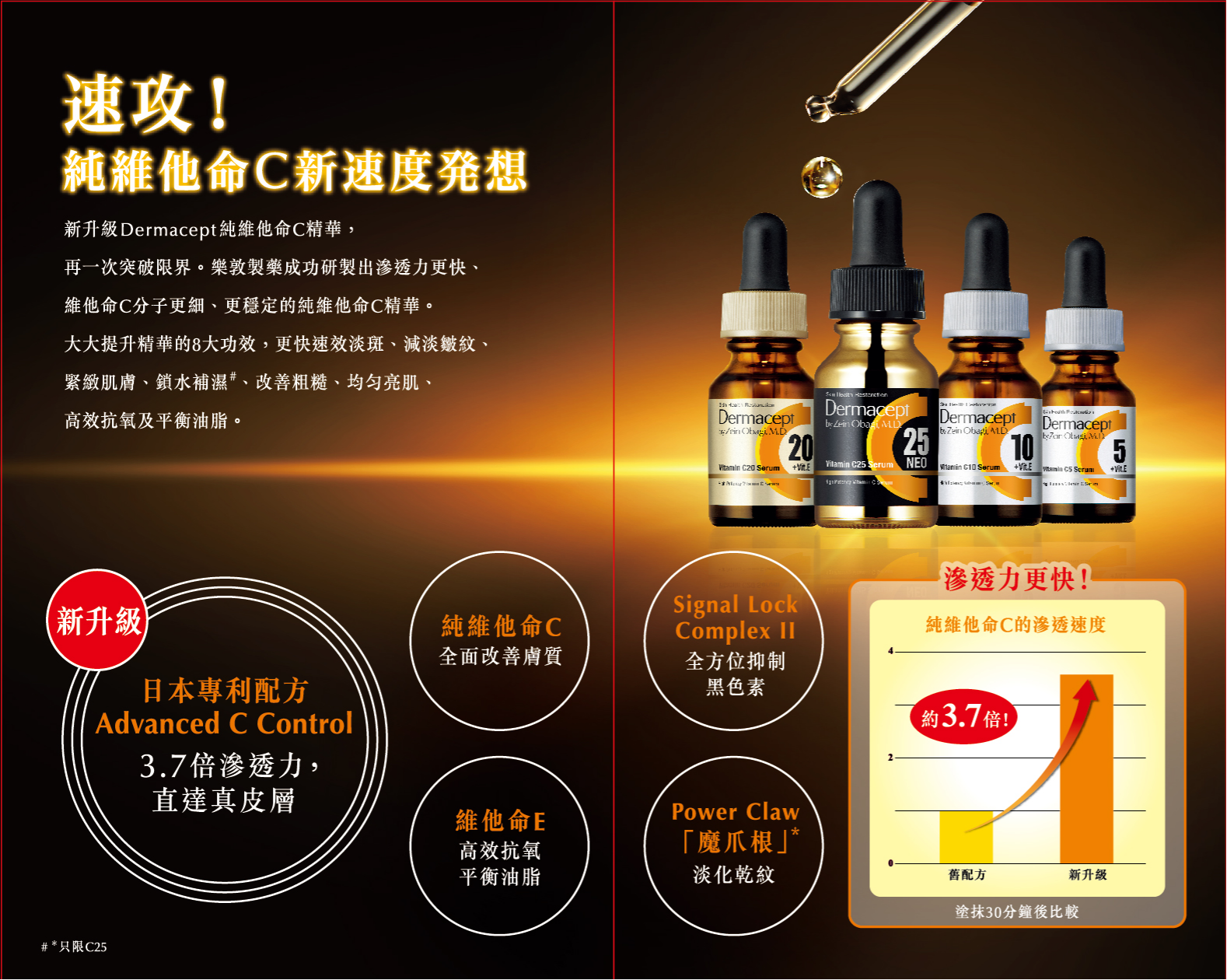 新升级Dermacept 纯维他命C精华,再一次突破限界。乐敦制药成功研制出渗透力更快、维他命C分子更细、更稳定的纯维他命C精华。 大大提升精华的8大功效,更快速效淡斑、减淡皱纹、紧致肌肤、锁水补湿#、改善粗糙、均勻亮肌、高效抗氧及平衡油脂。
