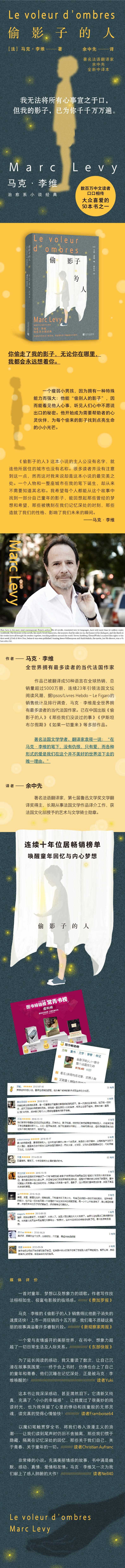 我希望每个人都能从这个故事中找到一部分自己童年的影子,能回想起那些曾经的梦想和希望,那些被镌刻在我们记忆深处的时刻,那些造就了我们的性格、影响了我们未来的瞬间。马克李维 在马克李维的笔下,没有仇恨,只有爱,而各种形式的爱是我们在这个并不美好的世界活下去的唯一理由。法国文学学者、翻译家袁筱一 一首对童年、梦想以及想象力的颂歌。作者写作技法栩栩如生、极富电影般的临场感。《费加罗报》 马克bull;李维的《偷影子的人》销售得比他影子消失的速度还快!上市一周狂销四十五万册,我们毫不质疑这美丽的故事满溢着许多睿智片段。《新观察家周报》 一个爱与友情盛开的美丽世界,在书中,想象力超越了一切日常生活及人际关系。《东部快报》 为了延长阅读的感动,我又重读了数次,让自己沉浸在故事氛围里终于合上书时,仿佛也合上了自己的童年和青春,他们沉睡在记忆深处,正是被马克bull;李维唤醒的!读者Yuki 这本书让我深深感动,甚至潸然泪下。它清新又纯真,充满了;小小的幸福感,让我度过了很美妙的阅读时光,也为我保留了心里的悸动和孩童般的无邪灵魂,读完真的觉得心情愉快!读者Framboise64 以魔幻笔触贯穿全书,将我们卷入浪漫主义的浪潮让我们读到尾声时仍旧不舍抽离,那些我们惯于隐藏、隔离在记忆深处的回忆,那些关于我们自己、关于青春、关于童年的一切。读者Christian Aufranc 非常棒的小说。充满美丽情感的故事,书中满是幽默、感动、真情、爱情和友情。马克bull;李维又一次为我们献上了感人肺腑的大作!读者Nell40 |