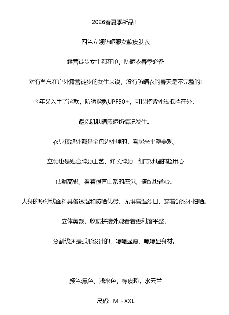 【rjhw-22366】26春夏新品!女士户外休闲立领皮肤轻盈外套!!