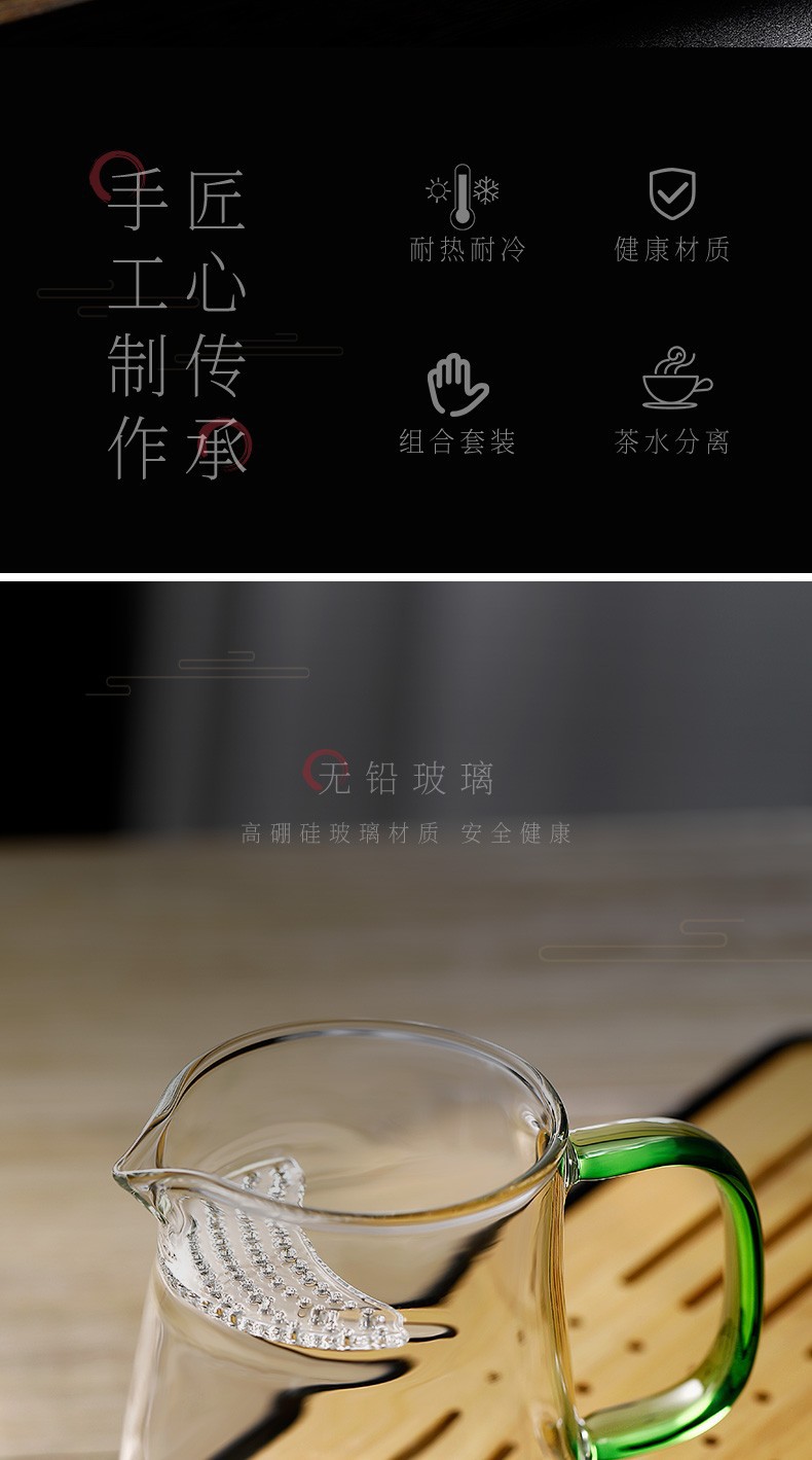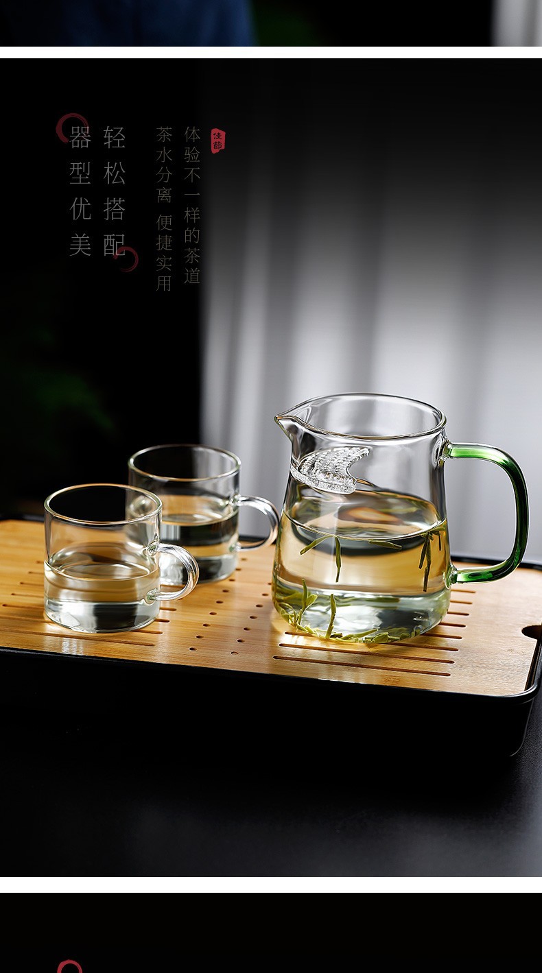 益思泉丨湖绿/黄色把手 茶漏一体公道杯 高硼硅玻璃 茶具 450ml 多款可选