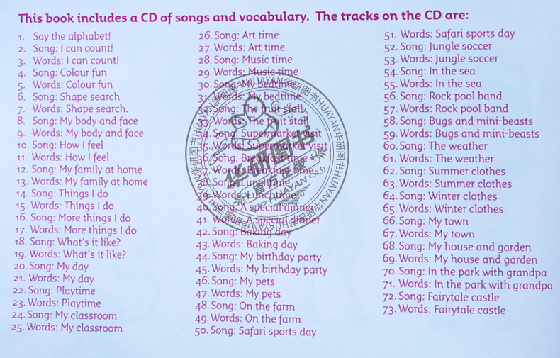 原版CD音频配套书本内容,36个主题+300个单词学习,配合36首英文学习歌曲,真的非常好听哦!