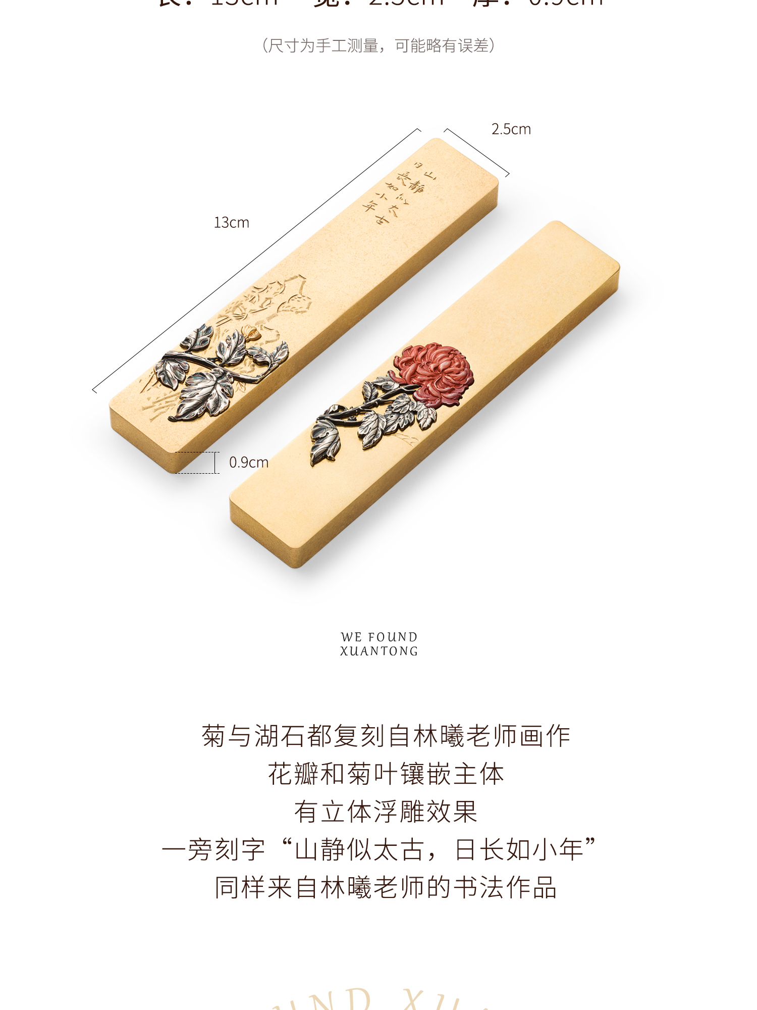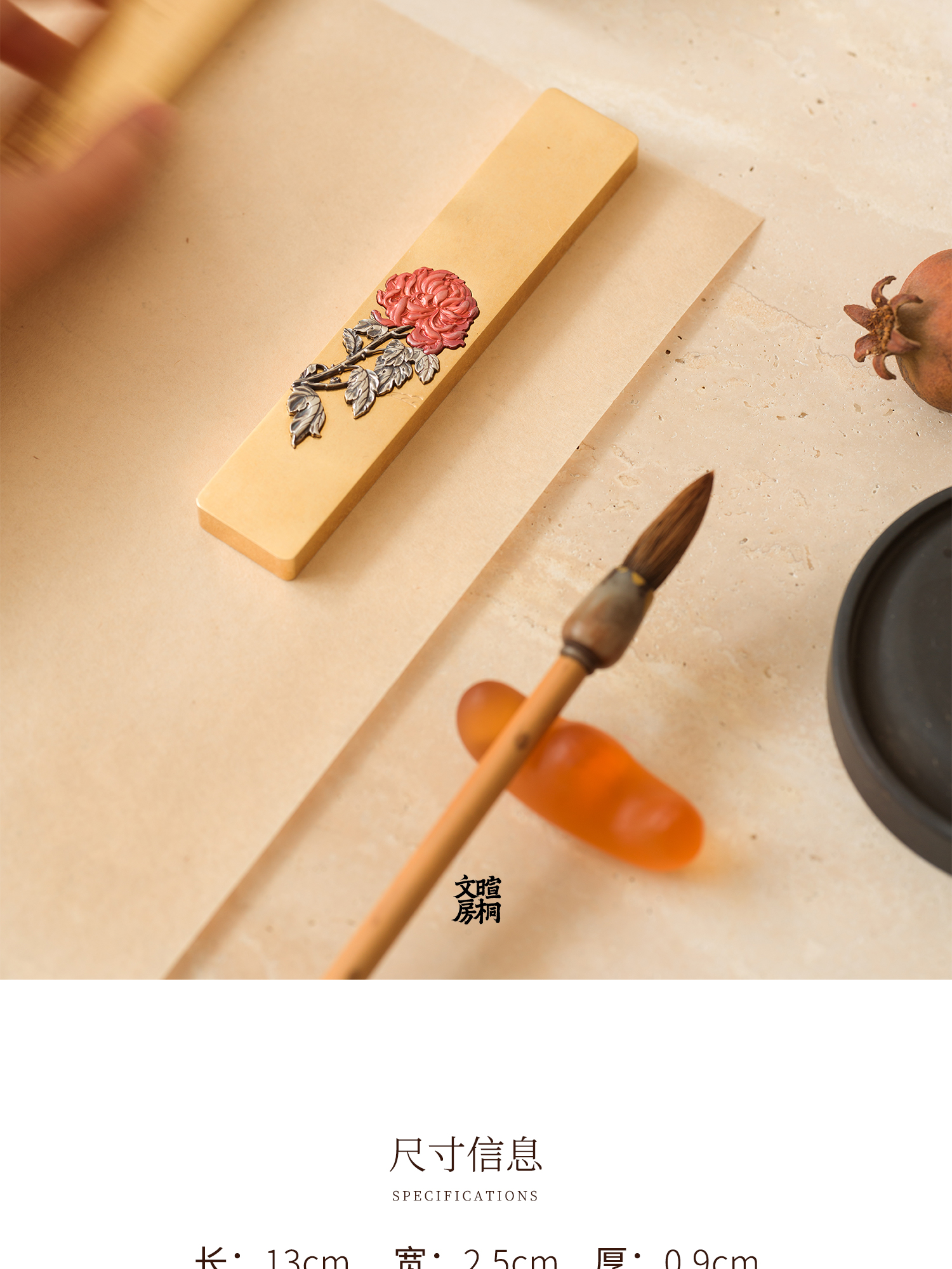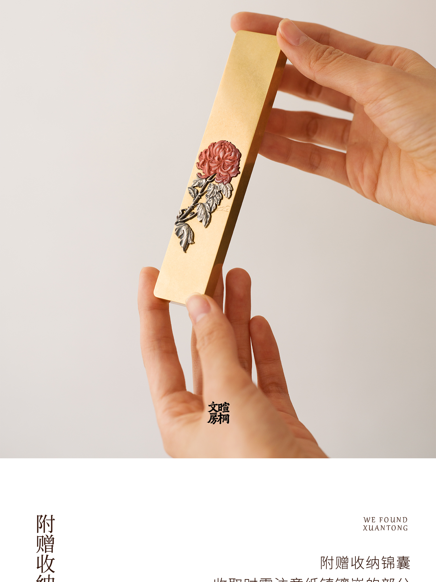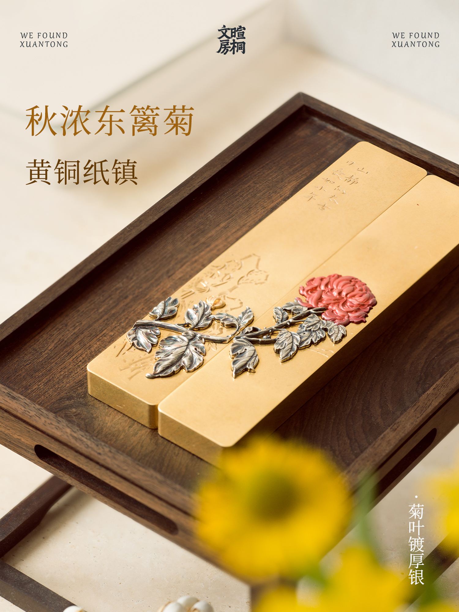 暄桐文房 秋浓东篱菊 纸镇 黄铜 白铜 紫铜 浮雕镶嵌