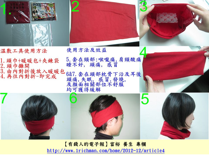 以下为各位分享好用的温敷工具;(1).魔术头巾(5~10元)+(2).暖暖包+(3).夹炼袋(0.5元) ,可以舒缓头部、颈部、颜面相关的症状(如下图所示)