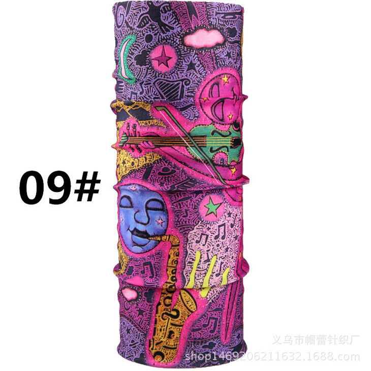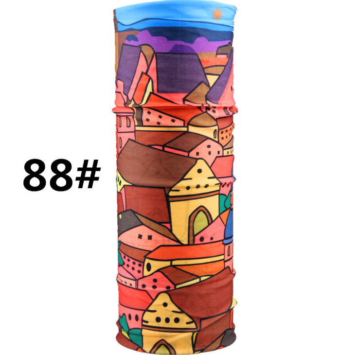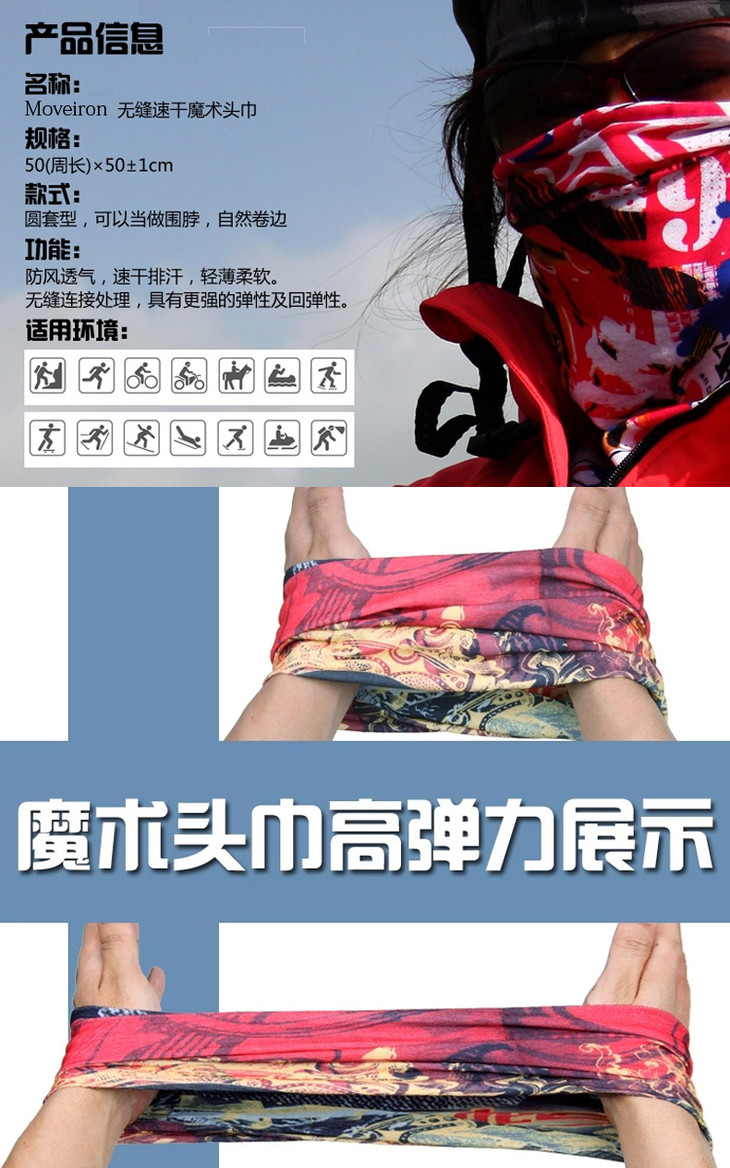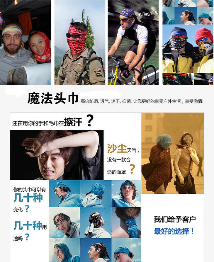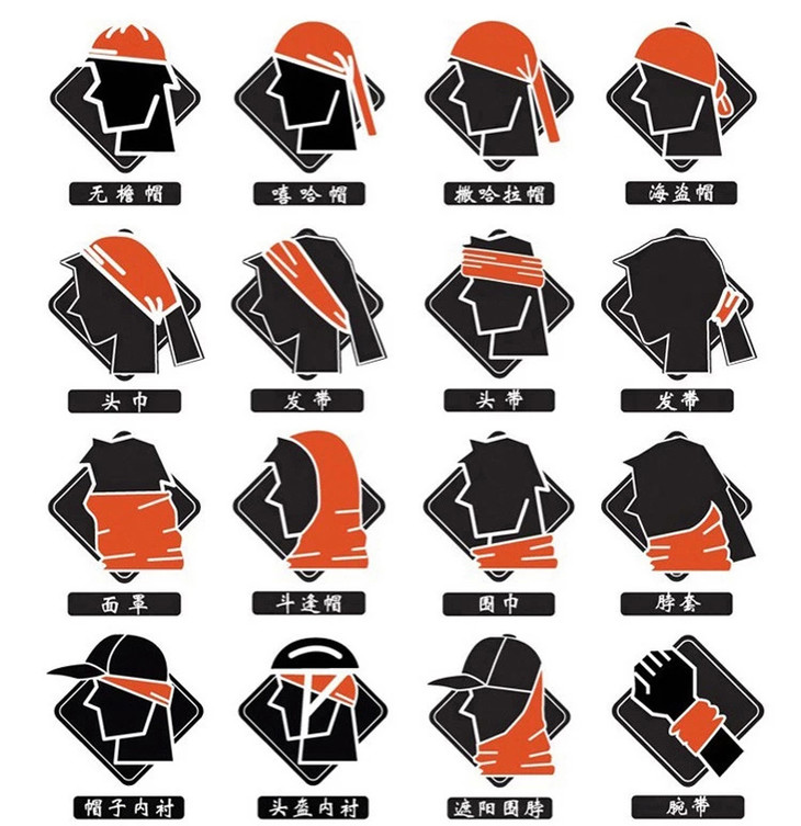 1、至少有十种以上的 不同扎法,变换出不同的效果,可用作头巾、围巾、头带、风沙罩、无檐圆帽、帽兜、护腕......