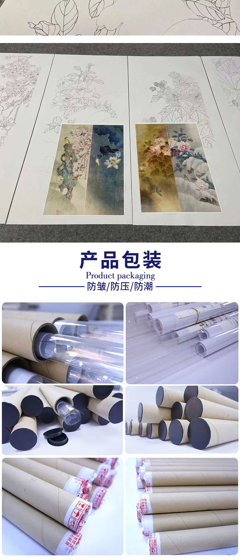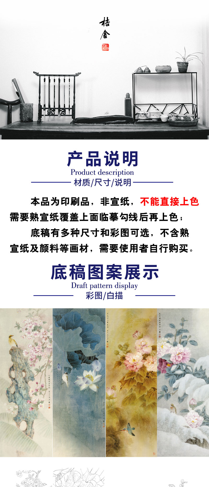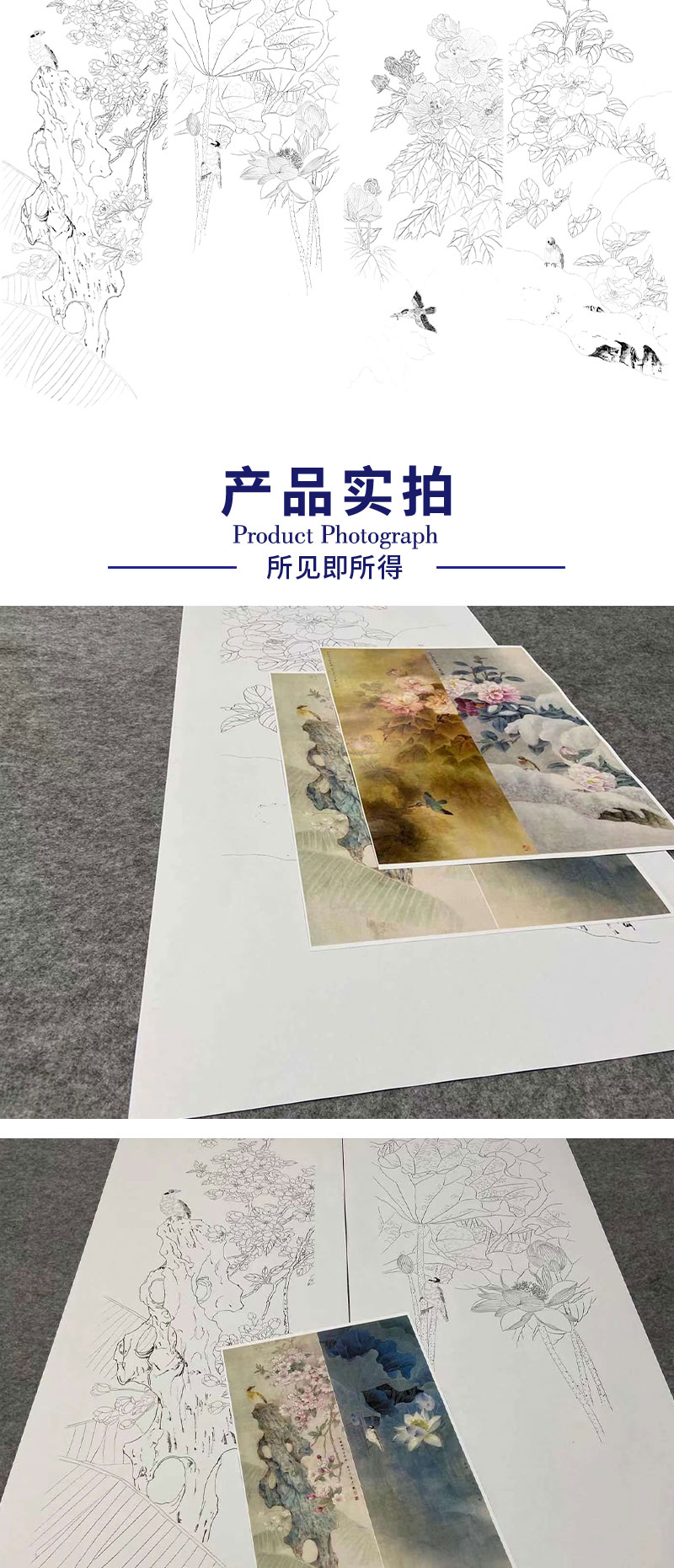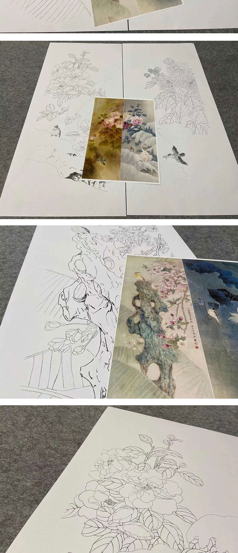 【四条屏】周中耀工笔画白描底稿《春夏秋冬》荷花牡丹临摹勾线花鸟线稿TP32