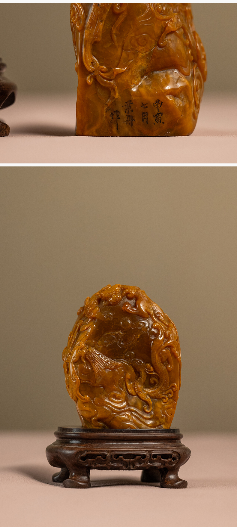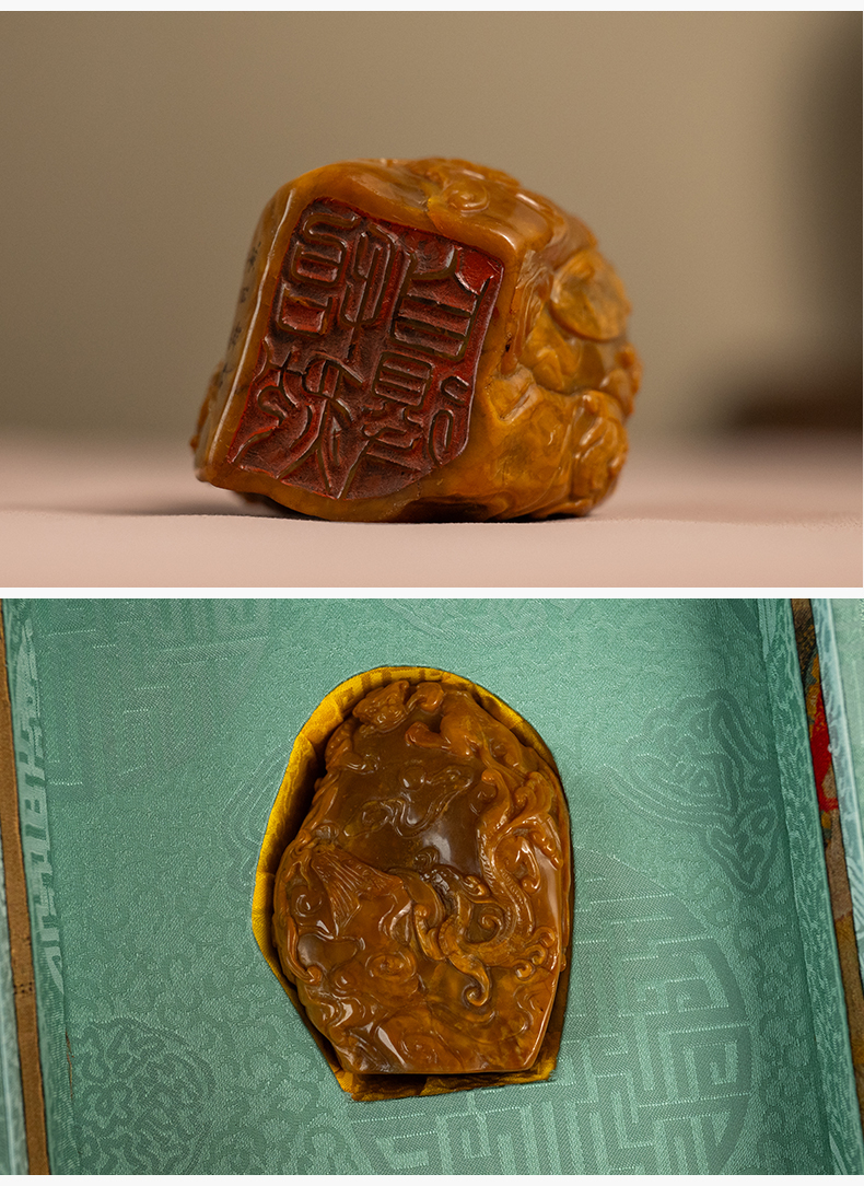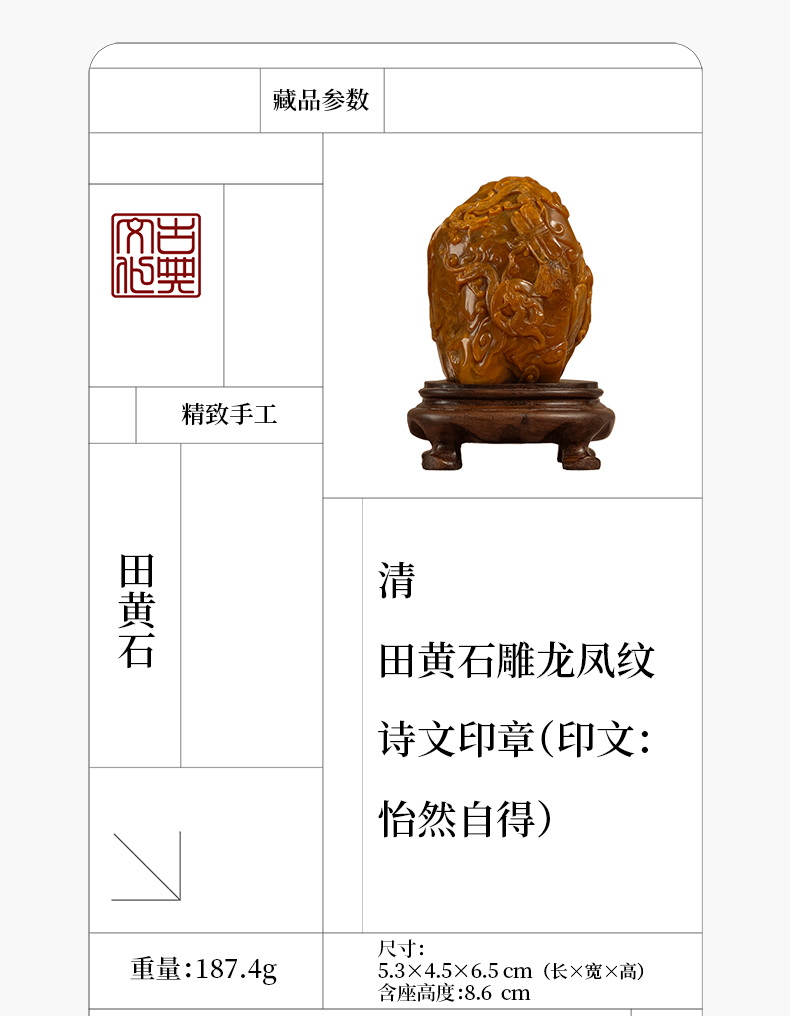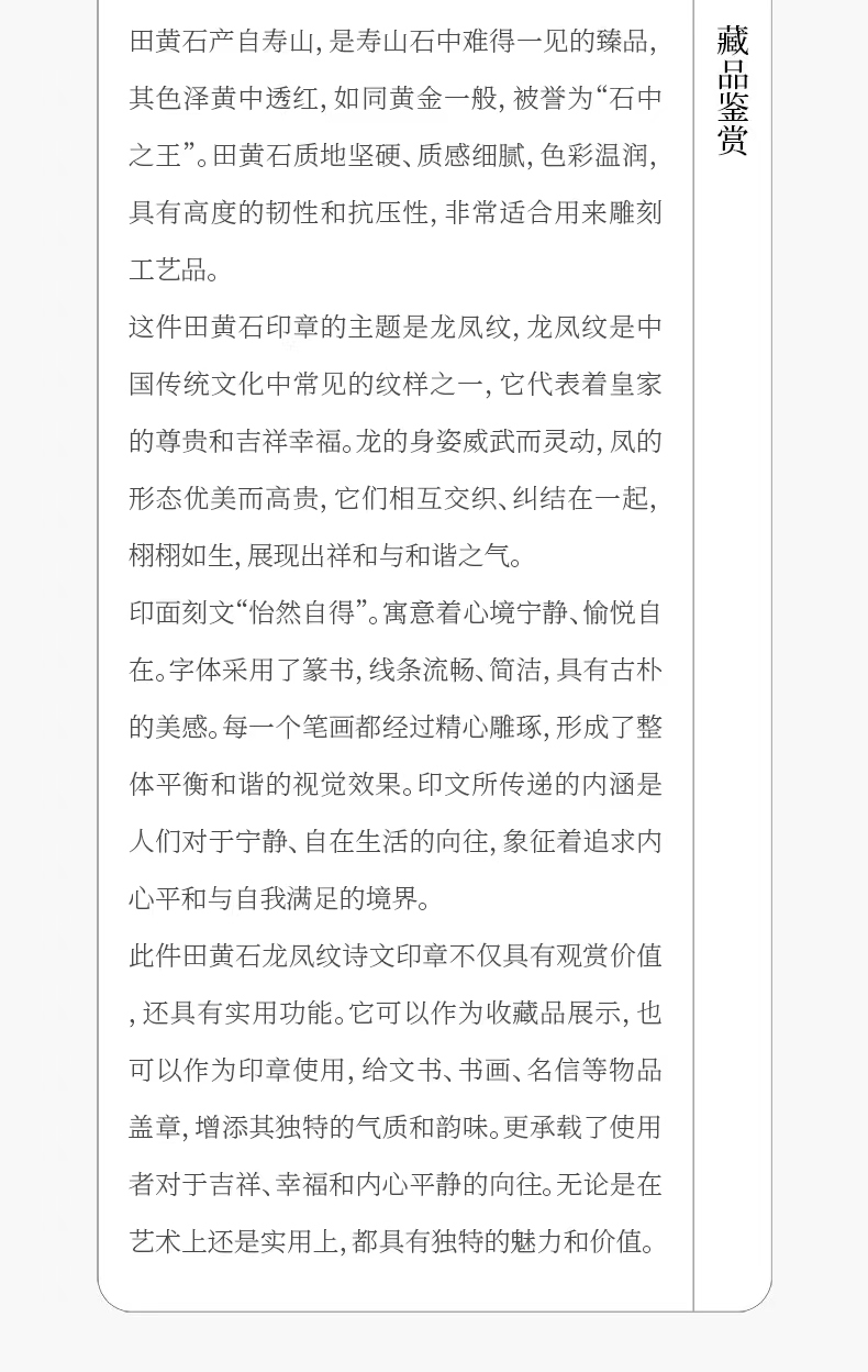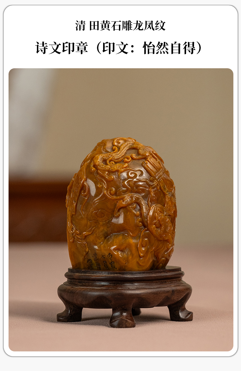 清 田黄石雕龙凤纹诗文印章(印文:怡然自得)