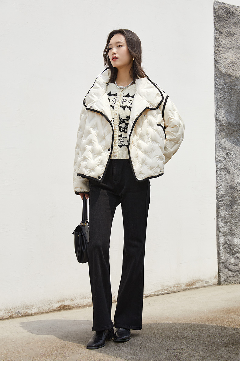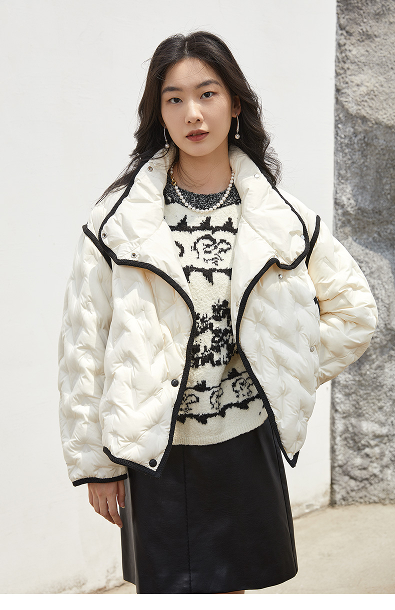 轻熟氛围感冬季保暖 奶油白菱格绗缝羽绒服 黑边撞色立领宽松短款休闲外套
