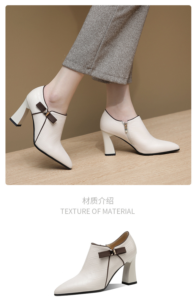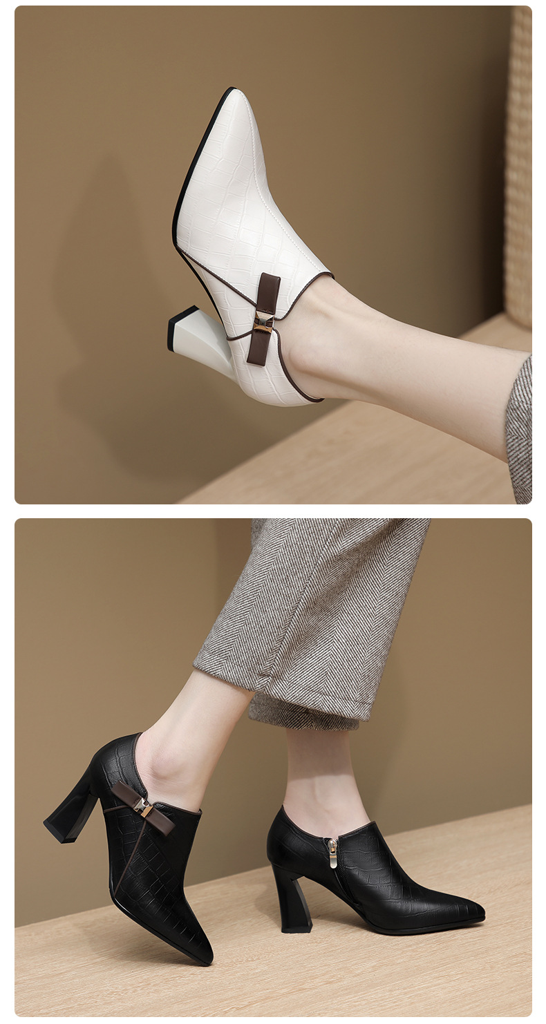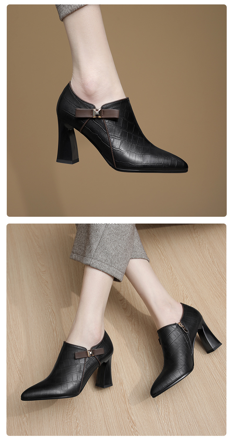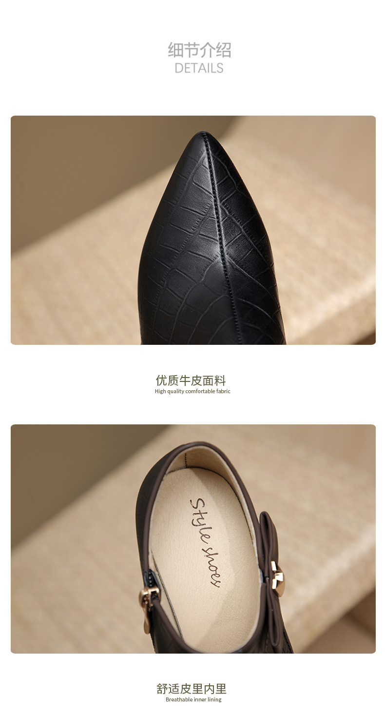 法式新款秋冬单鞋,黑色软皮尖头粗跟高跟高跟鞋蝴蝶结深口女鞋GLS514