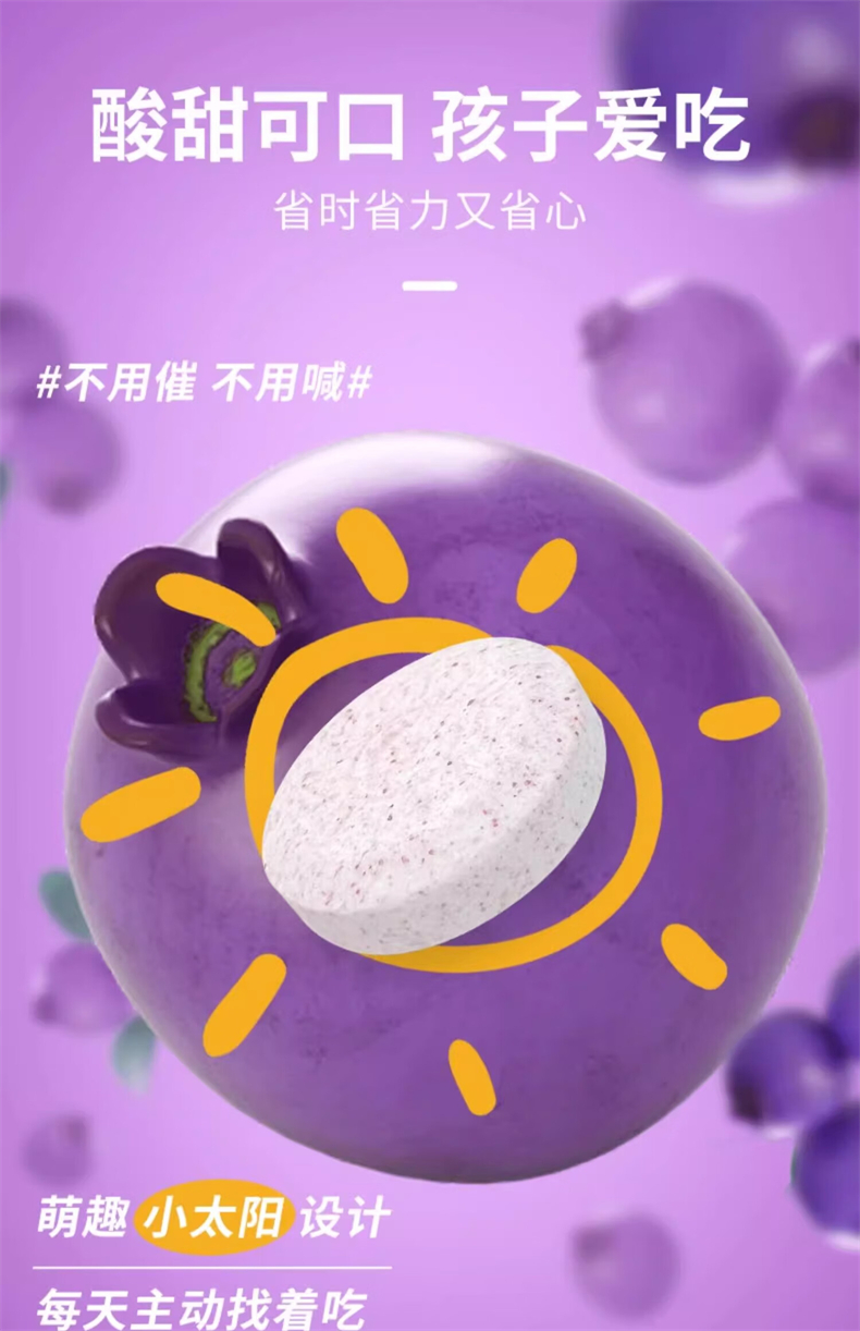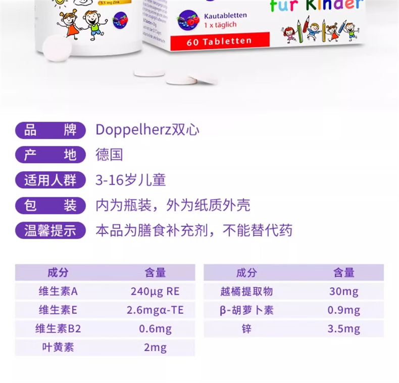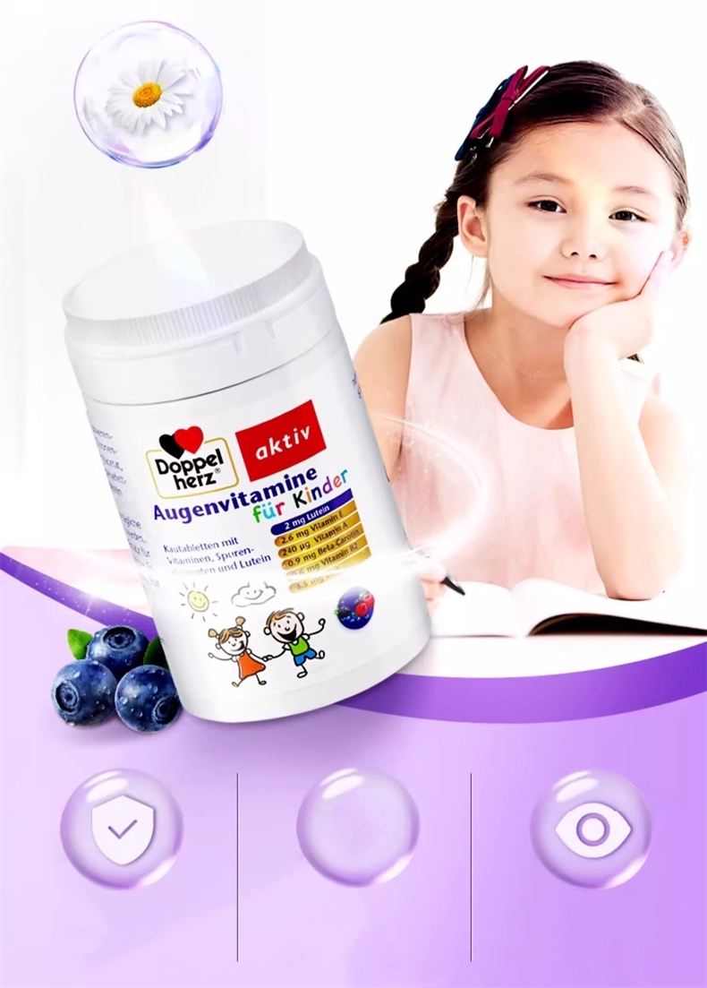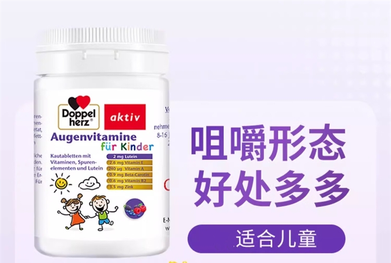 【跨境】德国Doppel herz双心 儿童蓝莓叶黄素咀嚼片60片/瓶(3-16岁)学生儿童青少年