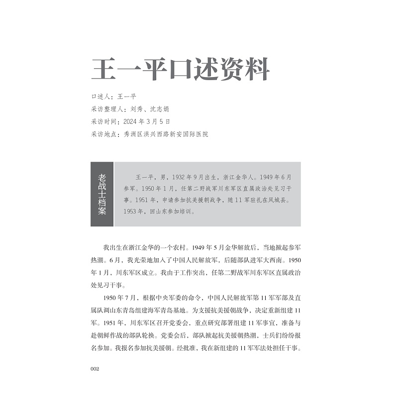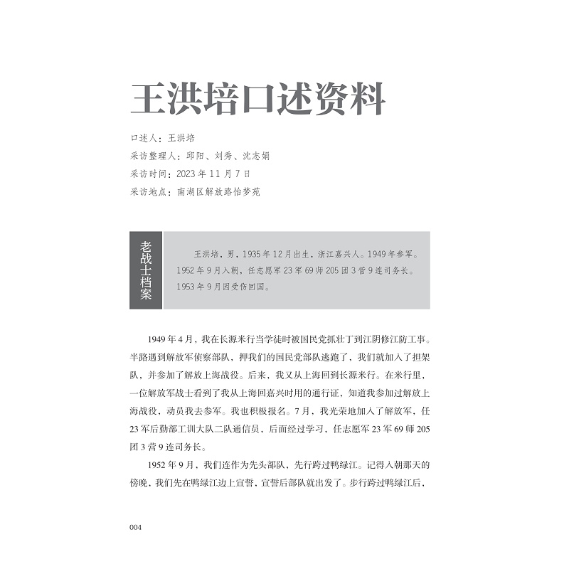 每个人的记忆都是时代汪洋中的一道波浪,每个人物的生活故事都是社会大背景的一道缩影。作为口述史著作,课题组梳理确定了108位志愿军老战士名单,并选取上门采访的方式对其中90位进行了资料征集,其中年龄最小的87岁、最大的98岁,男性84位、女性6位,将其口述资料进行整理后收录其中。全书共设8章,分市本级、南湖区、秀洲区、嘉善县、平湖市、海盐县、海宁市、桐乡市。写法上以第一人称视角,通过不同军种、不同时期参战的老兵真人讲述,以一句句平实细微的话语呈现出他们的参军、入党等革命故事,及参加战役战斗过程、细节等内容,深入挖掘展现志愿军老战士的感人事迹、政治品格、价值追求、精神风范和人生感悟。