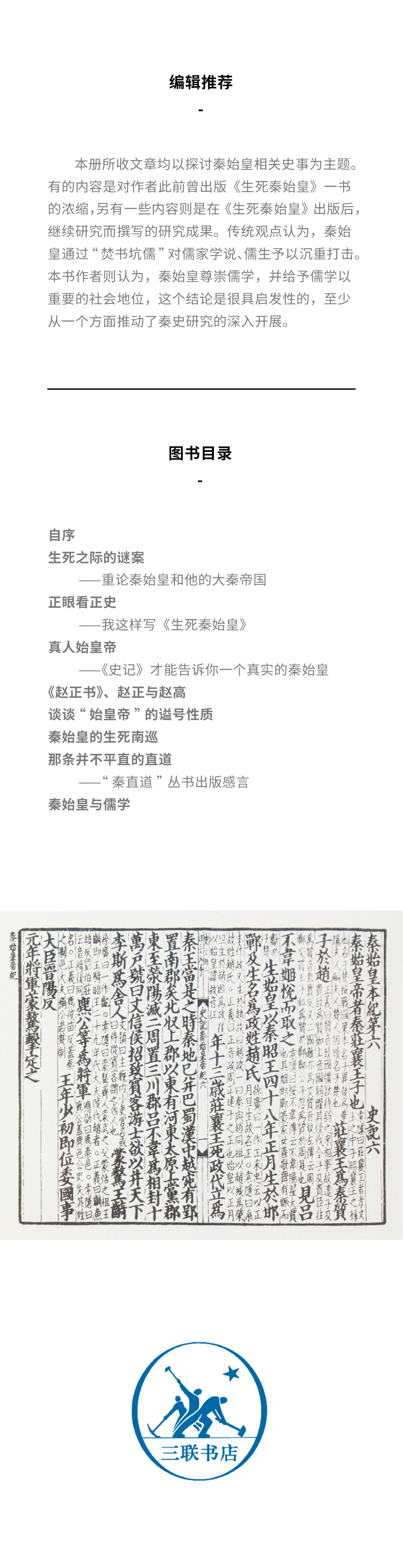 本册所收文章均以探讨秦始皇相关史事为主题。有的内容是对作者此前曾出版《生死秦始皇》一书的浓缩,另有一些内容则是在《生死秦始皇》出版后,继续研究而撰写的研究成果。尤其是《秦始皇与儒学》一篇,篇幅最大,讨论的问题也最为重要。传统观点认为,秦始皇通过“焚书坑儒”对儒家学说、儒生予以沉重打击。本书作者则认为,秦始皇尊崇儒学,并给予儒学以重要的社会地位,这个结论是很具启发性的,至少从一个方面推动了秦史研究的深入开展。