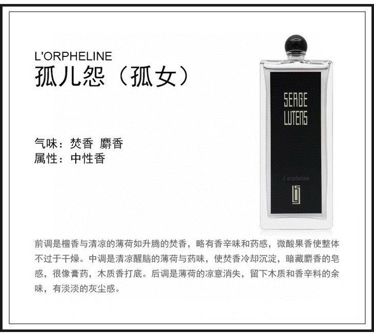 卢丹氏孤女怨香水#50ml/#100ml👍灵感来源于灰烬☠。孤女可以说是天才之作,那种脱离红尘,冷暖看众生的焚香味让人欲罢不能😇。这是一种让人宁静的香,男女都可以用。更是一款悦己的香,清冷美丽,一身黑衣😎,安静清和,不卑不亢。不需要取悦任何人🙅,只要达到内心的平静平和就足够了!整体来讲孤女冷调,略重口,爱的人非常爱😘。