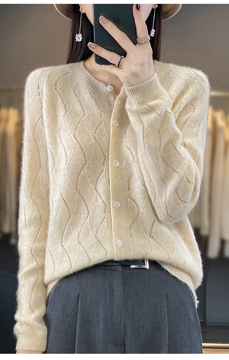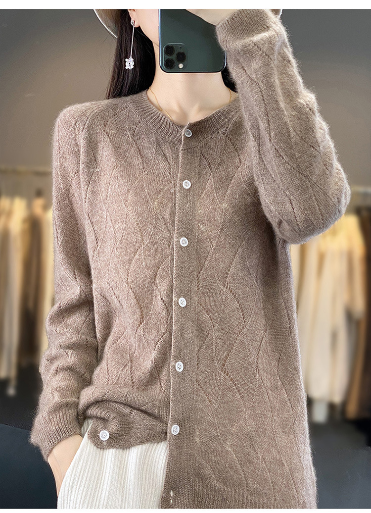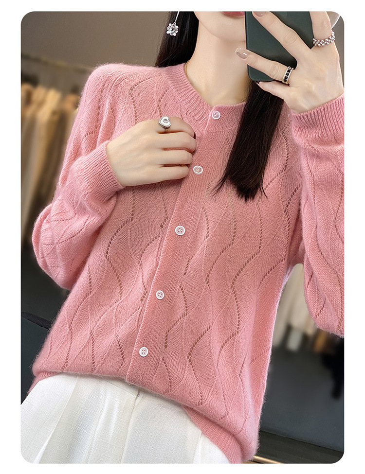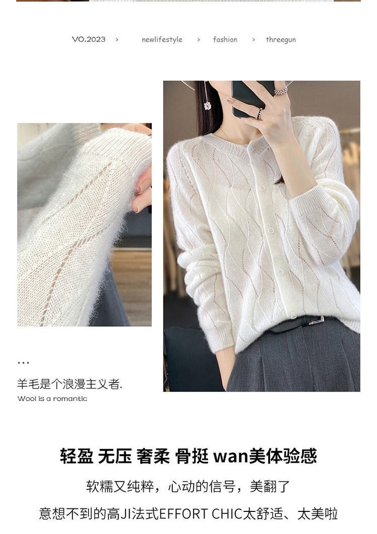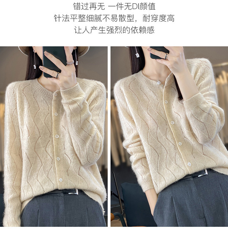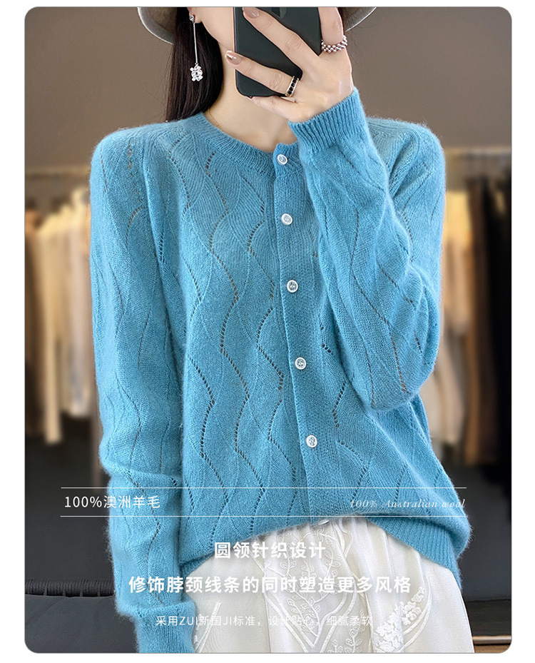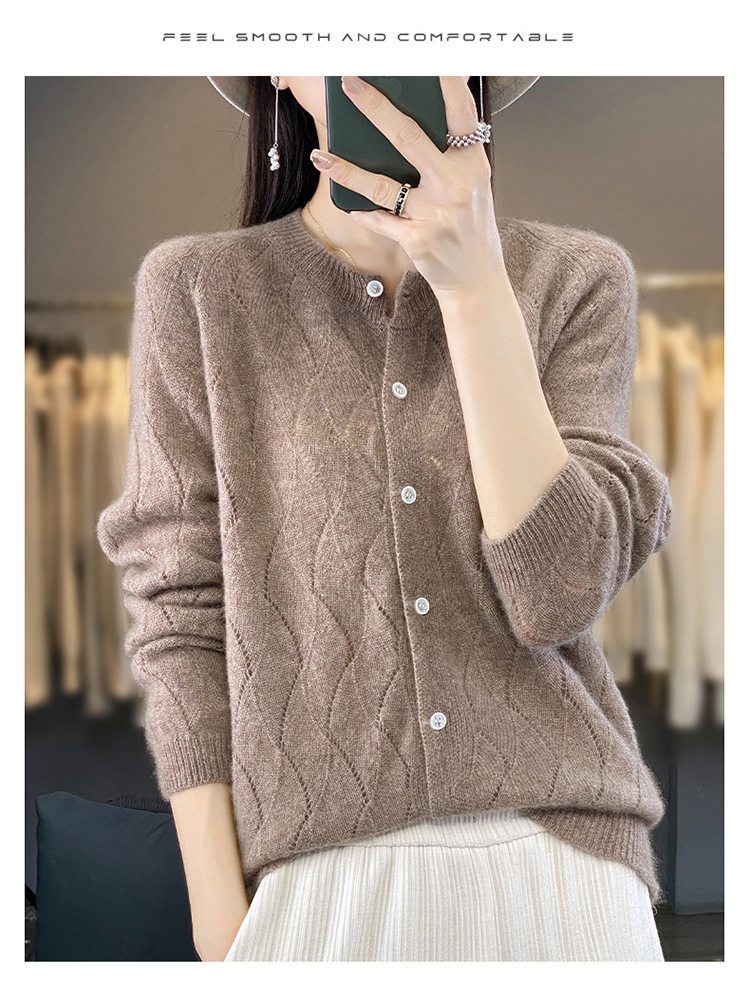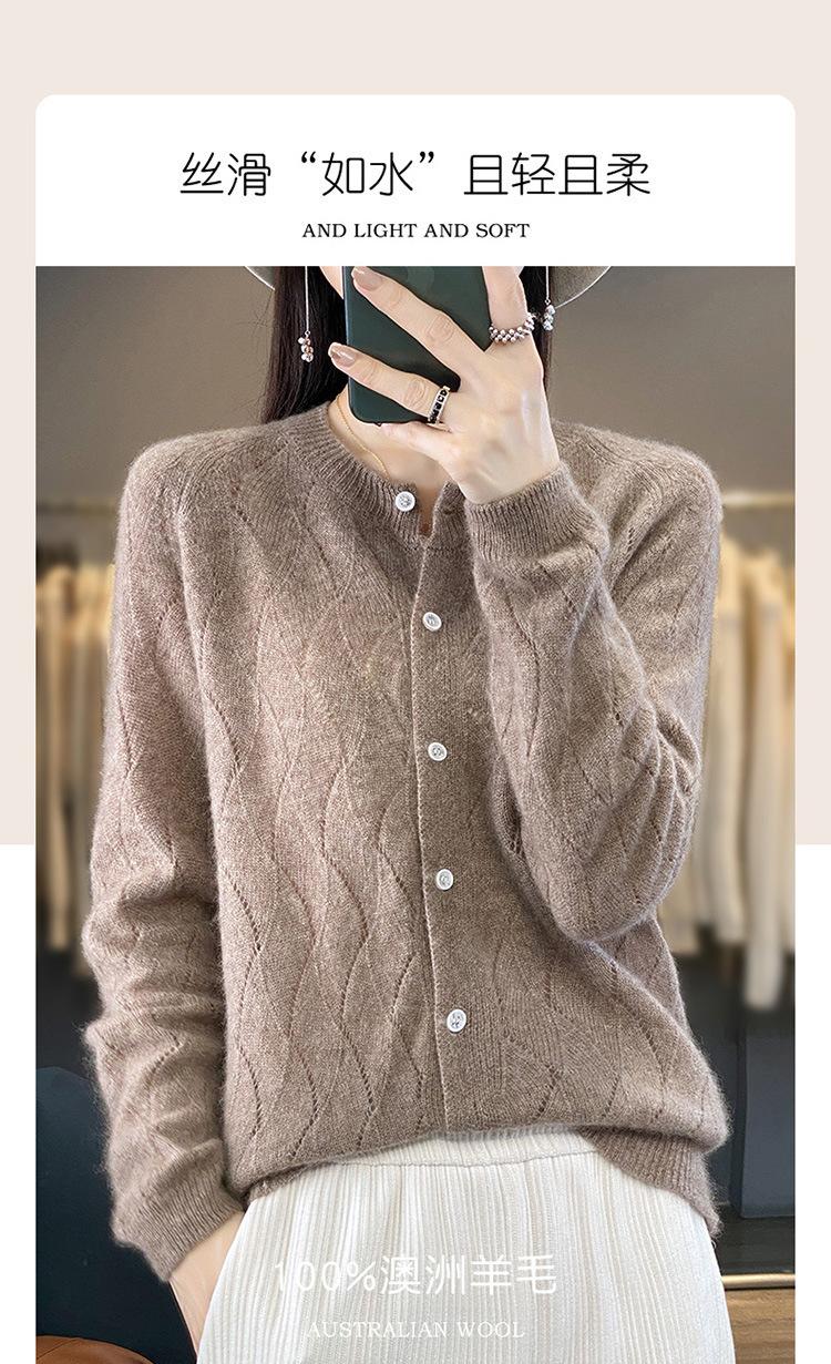 QHJY-DMR285韩版时尚波浪纹纯羊毛开衫女23秋季新款纯色圆领外套长袖针织上衣