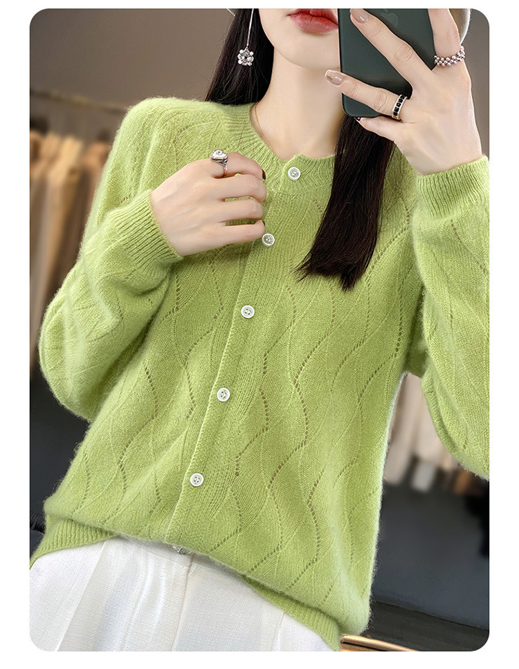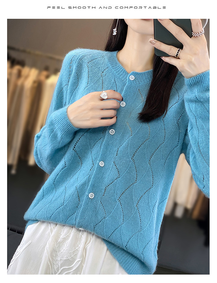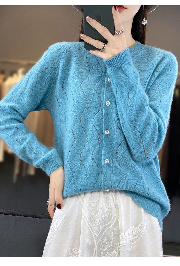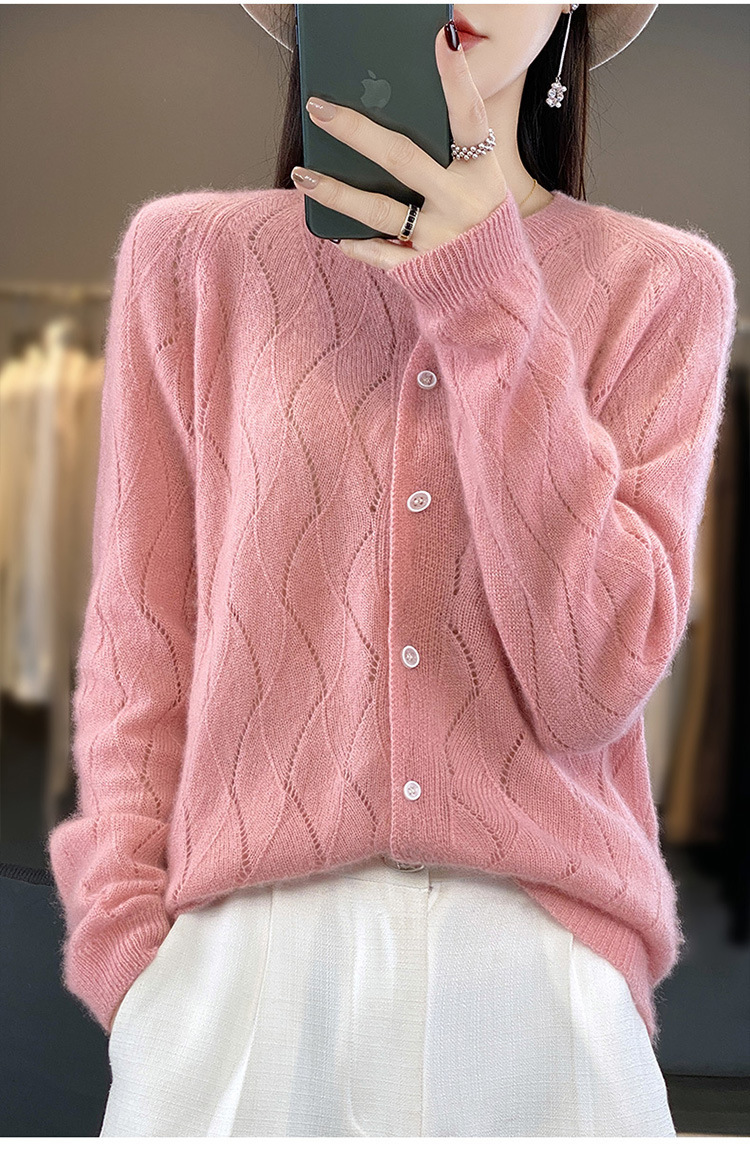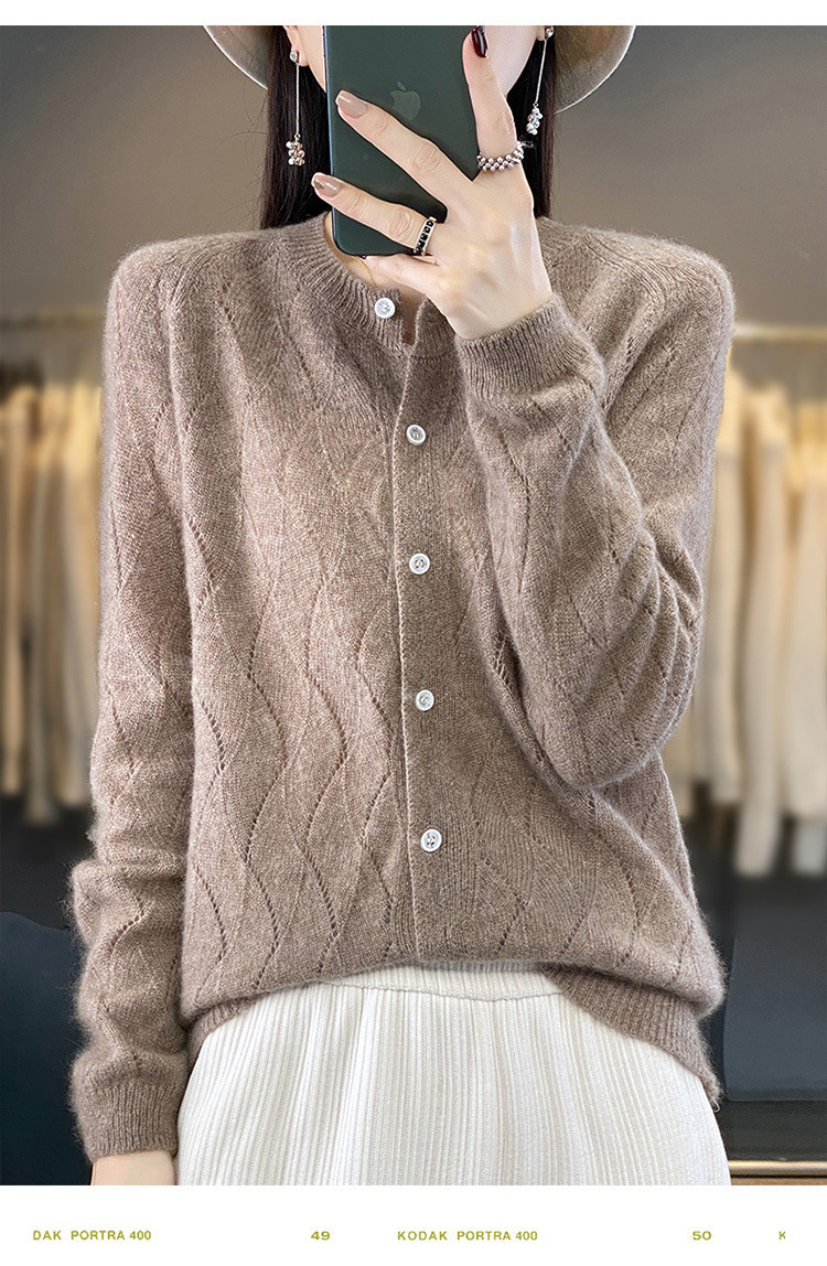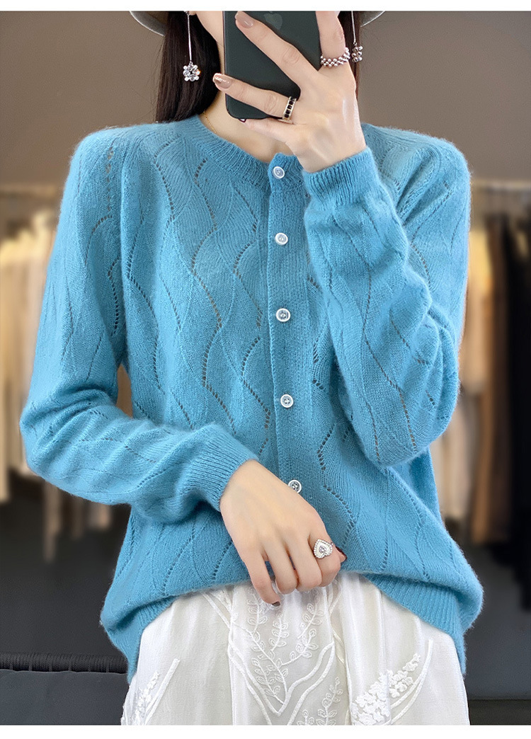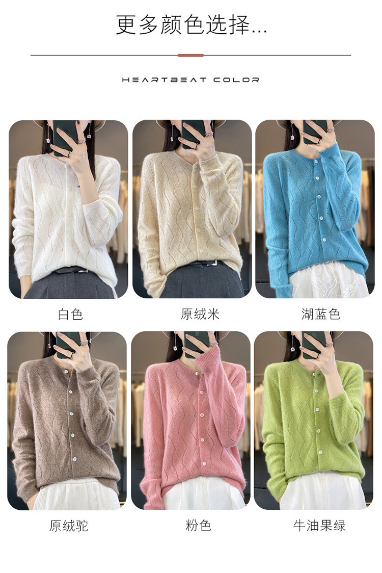 QHJY-DMR285韩版时尚波浪纹纯羊毛开衫女23秋季新款纯色圆领外套长袖针织上衣