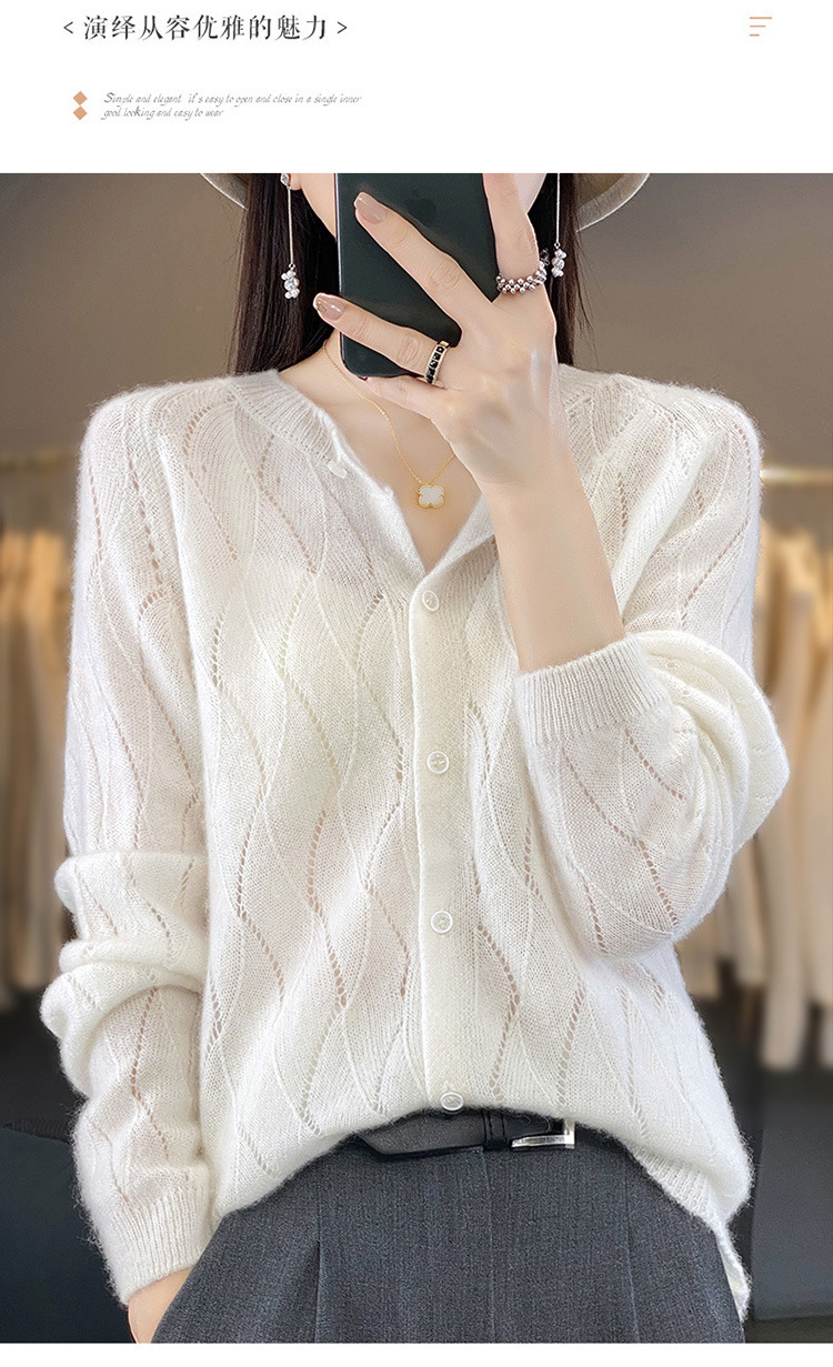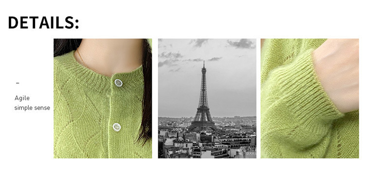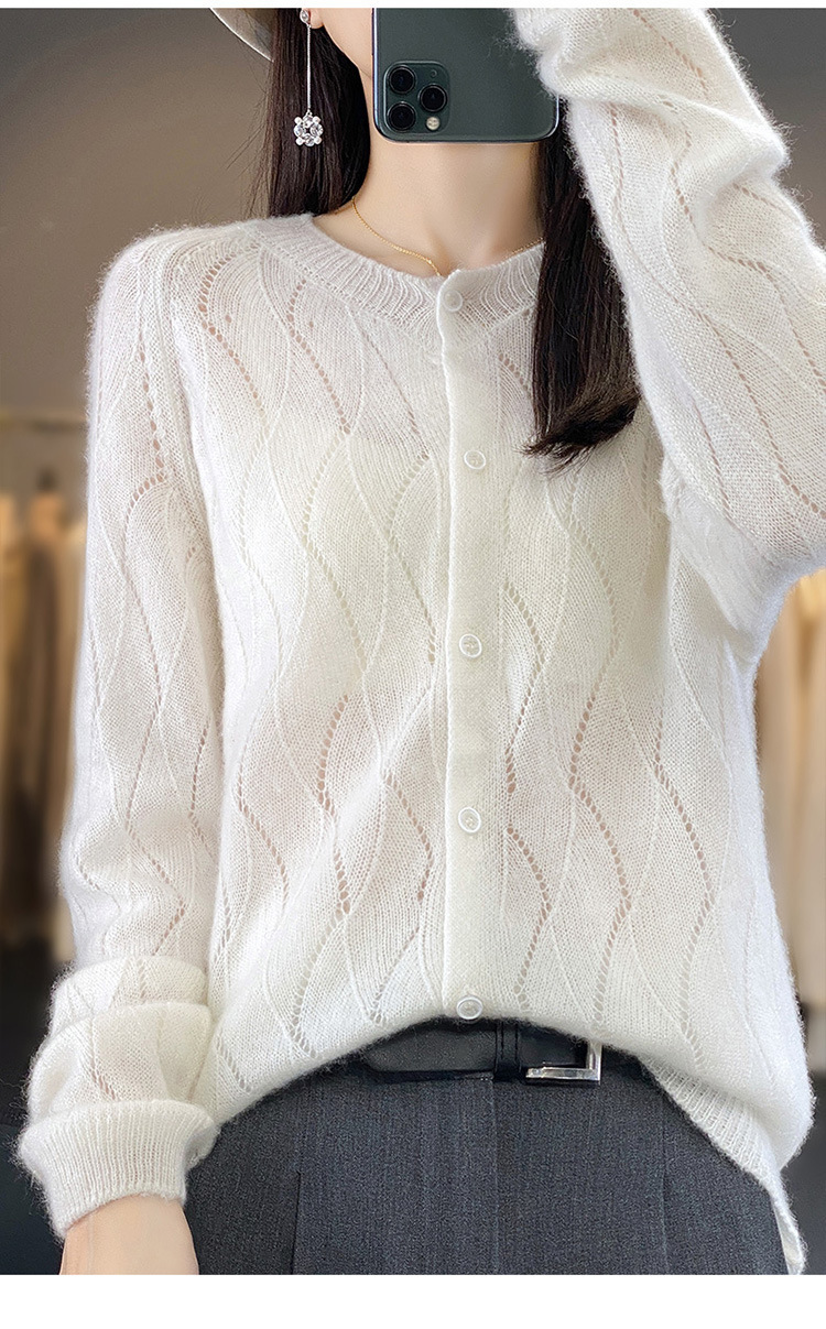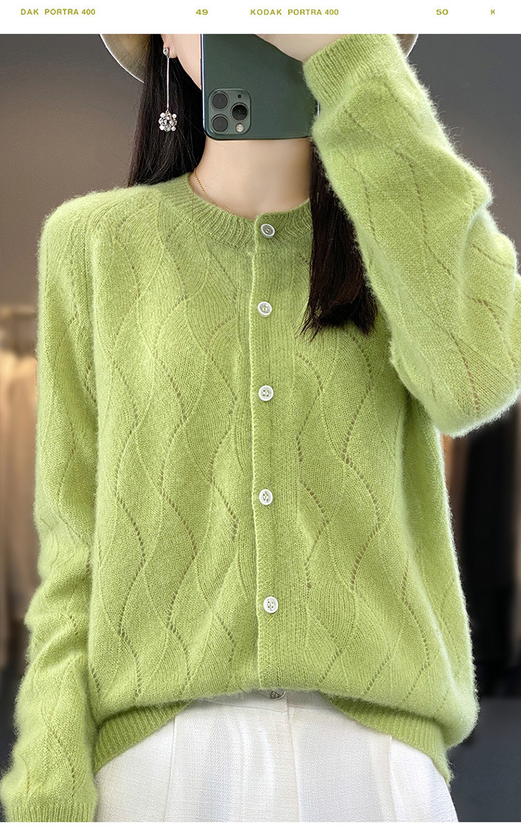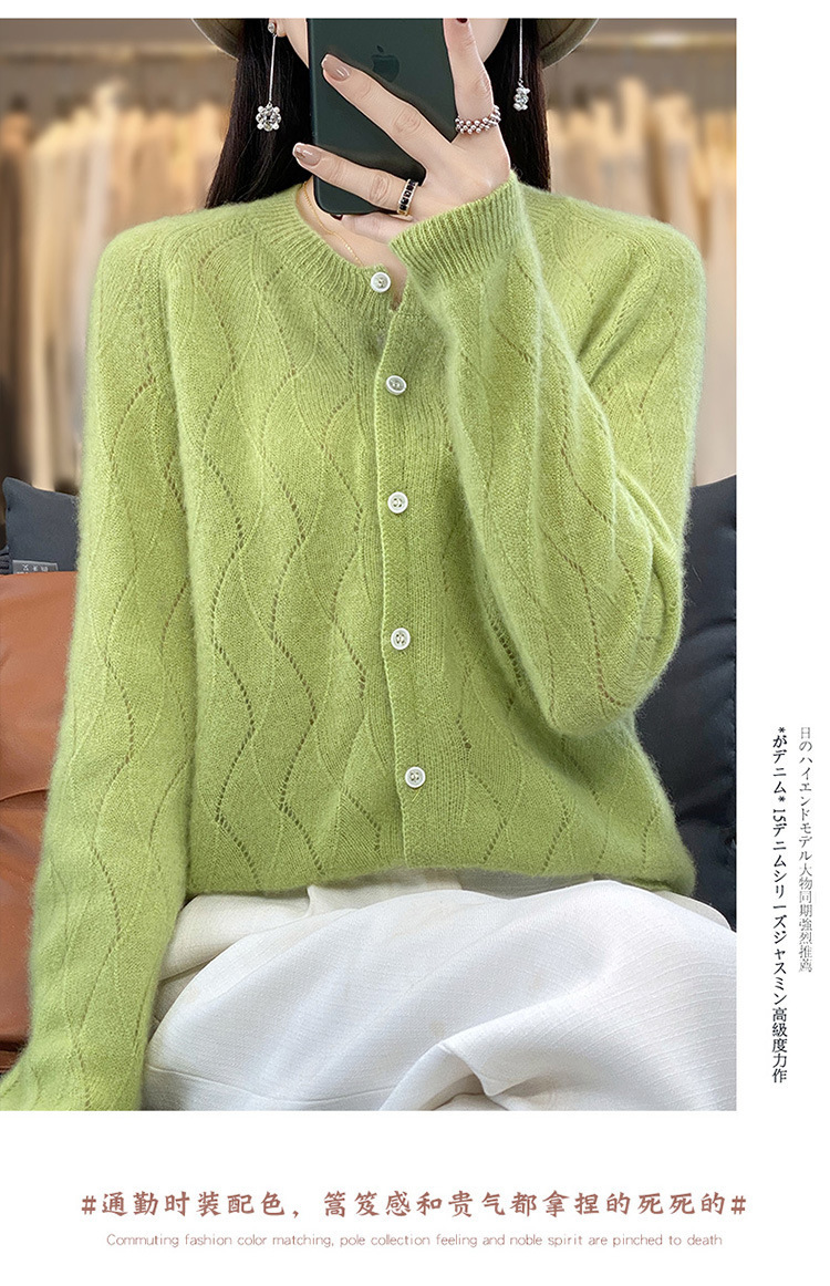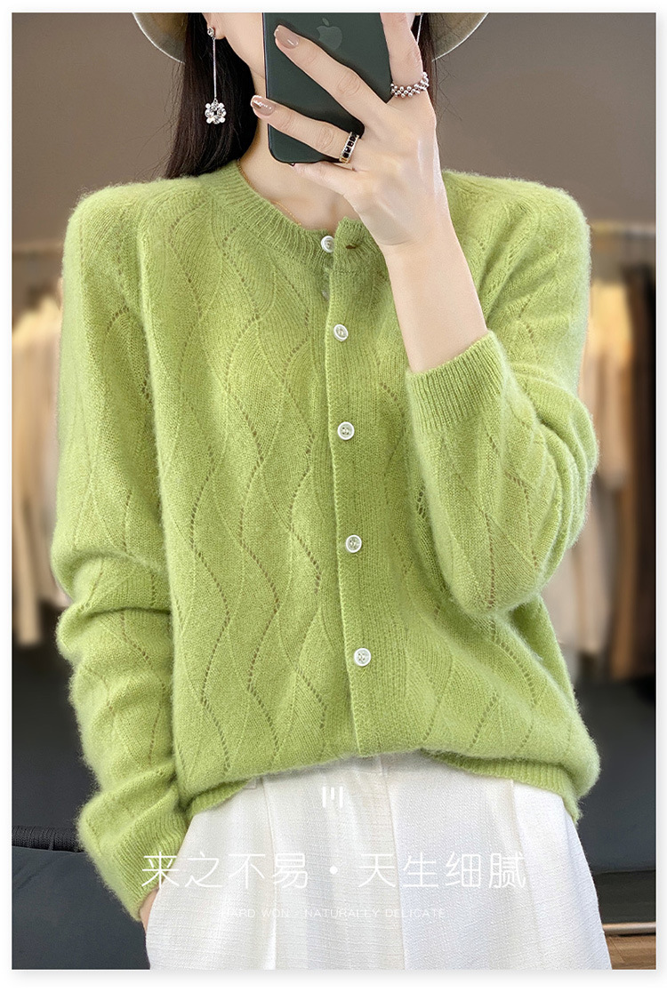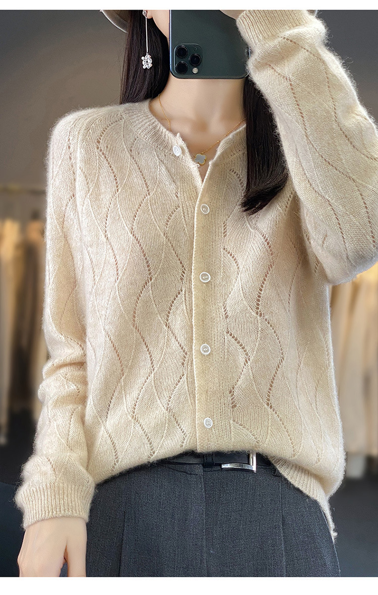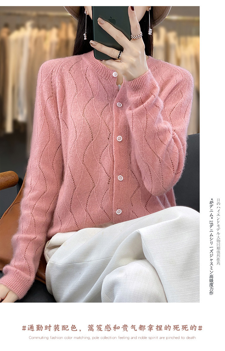 QHJY-DMR285韩版时尚波浪纹纯羊毛开衫女23秋季新款纯色圆领外套长袖针织上衣