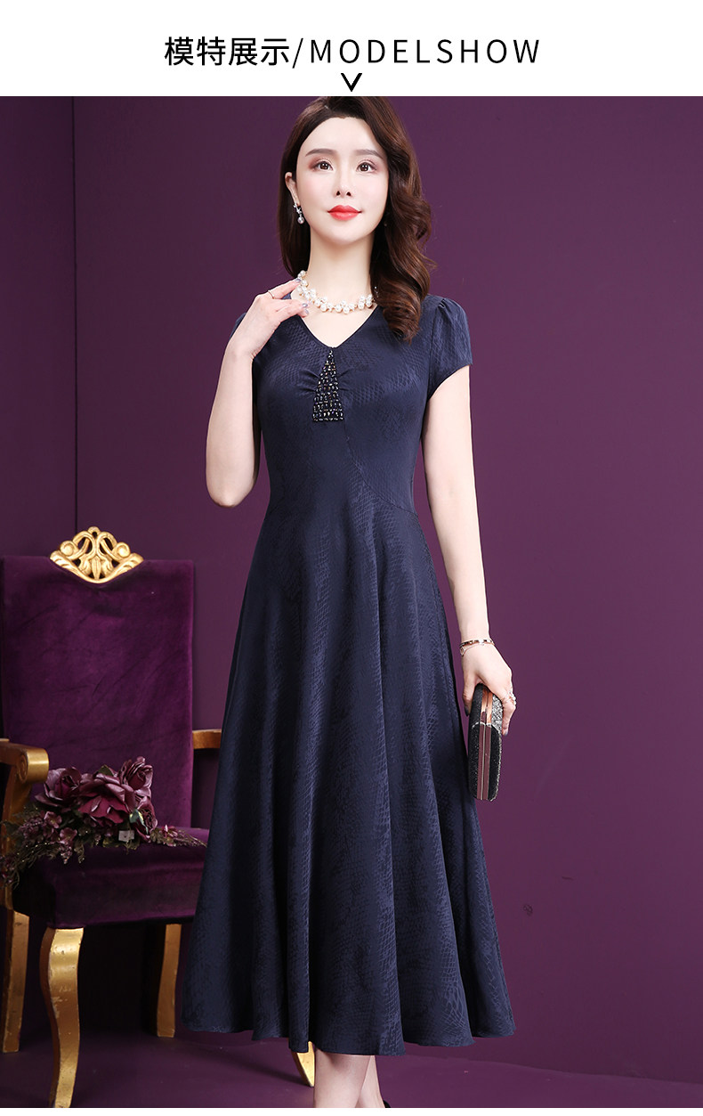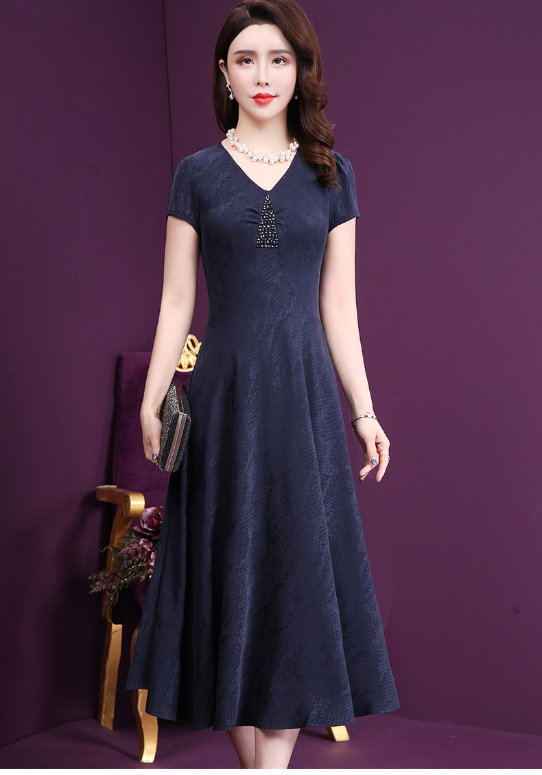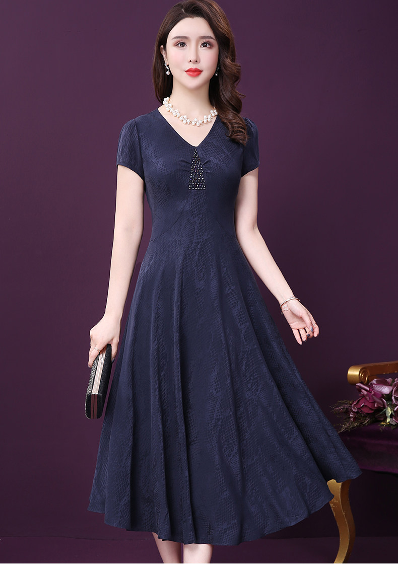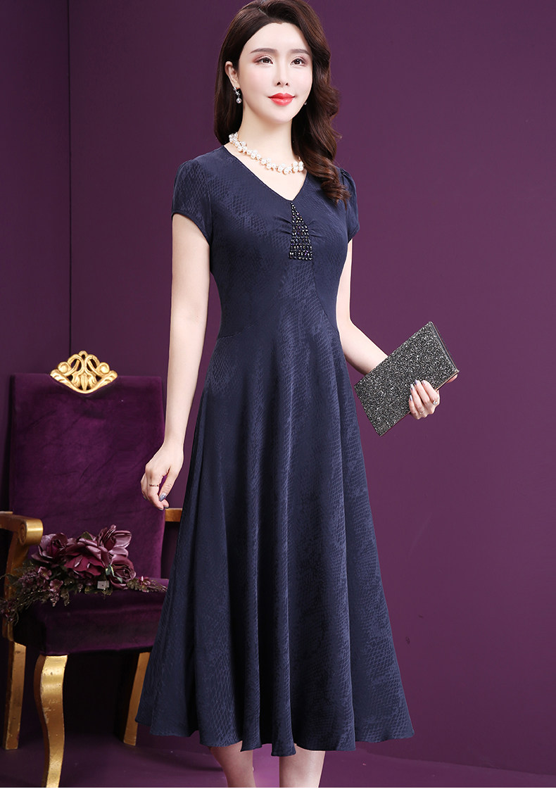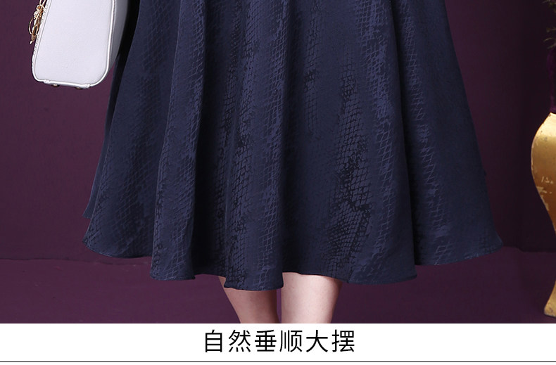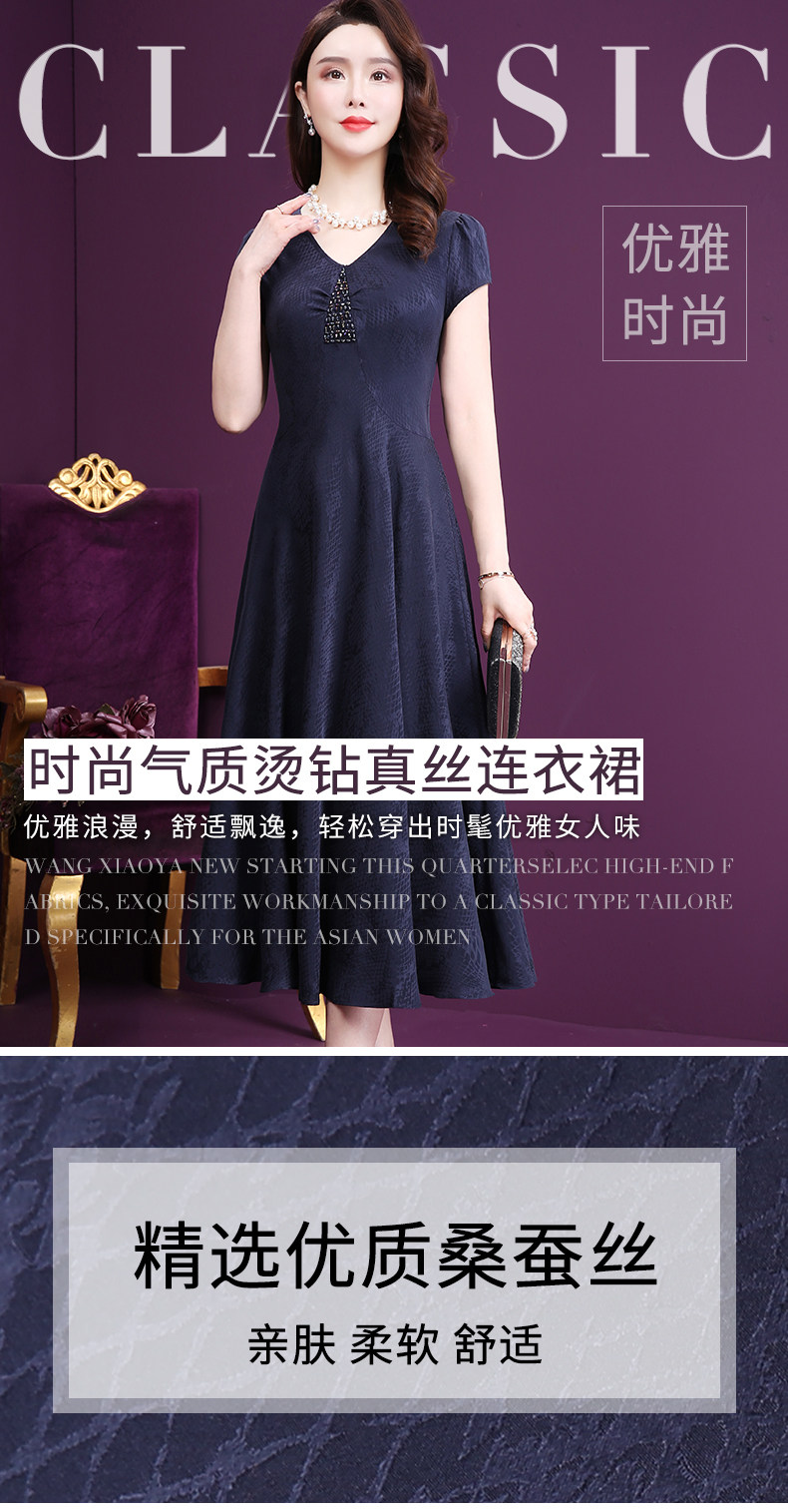 WXY-W-XY-1300真丝 新款V领高贵阔太太中年女士韩版简约A字裙