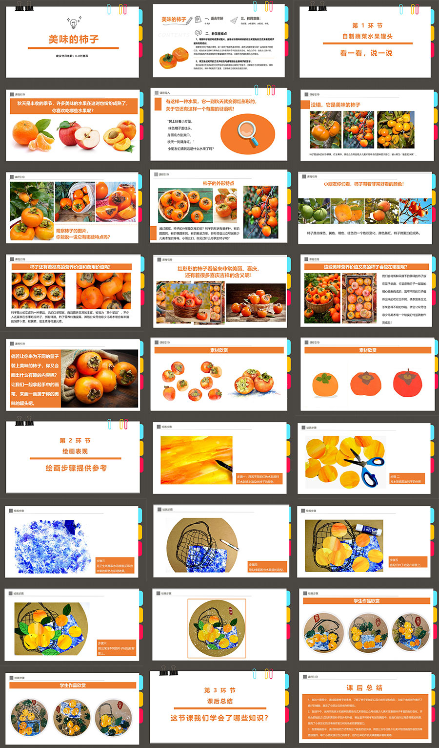 观察有关柿子的图片素材,说一说柿子的颜色是怎样的,颜色又有哪些变化呢?运用深浅不同的红色、橙色的水彩颜料以晕染的方法来表现柿子丰富的色彩变化。并结合剪贴的方式来表现柿子圆溜溜的外形特征,注意柿子的颜色和大小的变化。