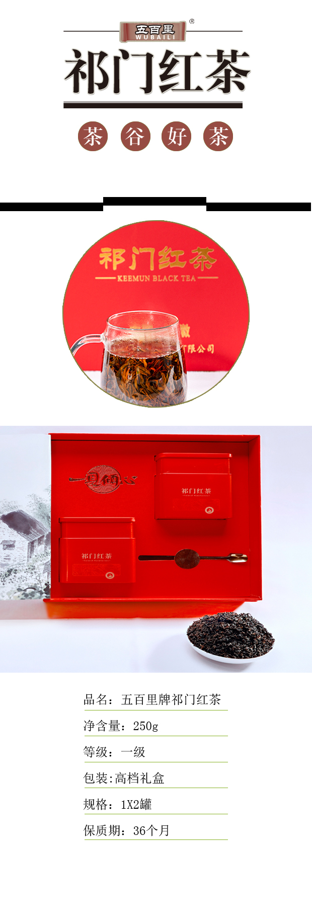 五百里 祁门红茶 一级新茶 250g(2听x125g)