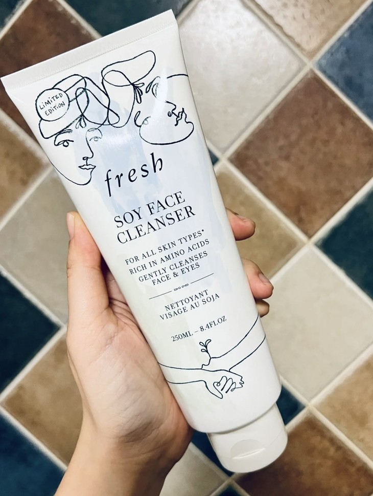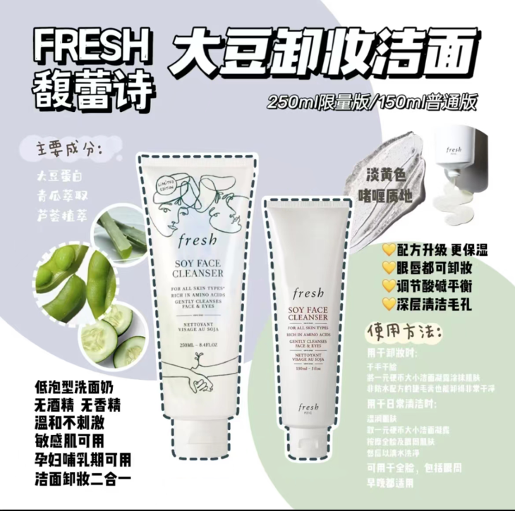 👑Fresh大豆卸妆洁面乳250ml(增量版)/150ml 👍 2022-限量版,全新PCR环保材质!取消花盒外包装,更环保。洁面卸妆二合一💥。 💦极温和配方,含丰富大豆蛋白、青瓜、芦荟、琉璃苣籽油等多从升级配方! ✅有保湿、镇静和爽肤功效。✅能温和洁净肌肤,卸妆及爽肤。 💎升级增量版更加做到额外补水10%。还可以舒缓皮肤、平衡皮肤ph值💋! 🥚清洁之余,还可以卸掉简单的隔离防晒🔅。就真的很绝🌈!