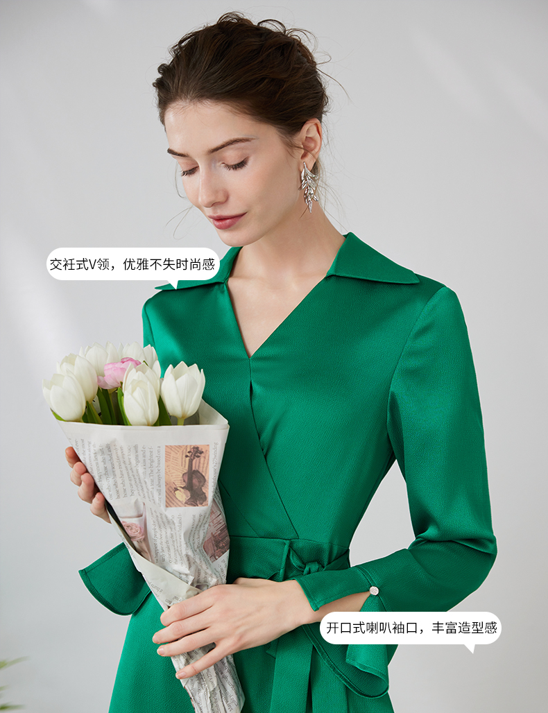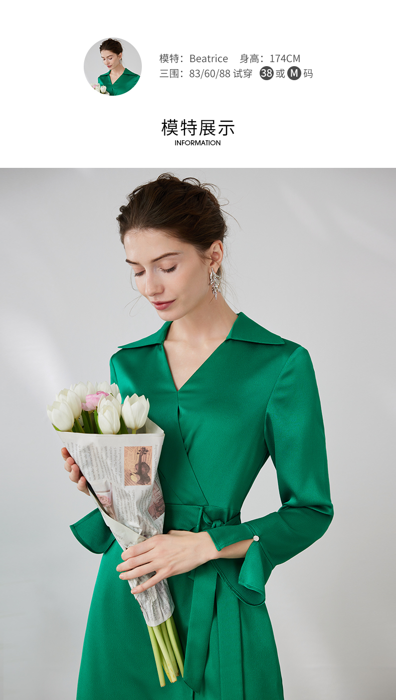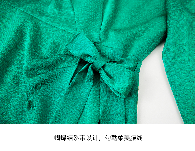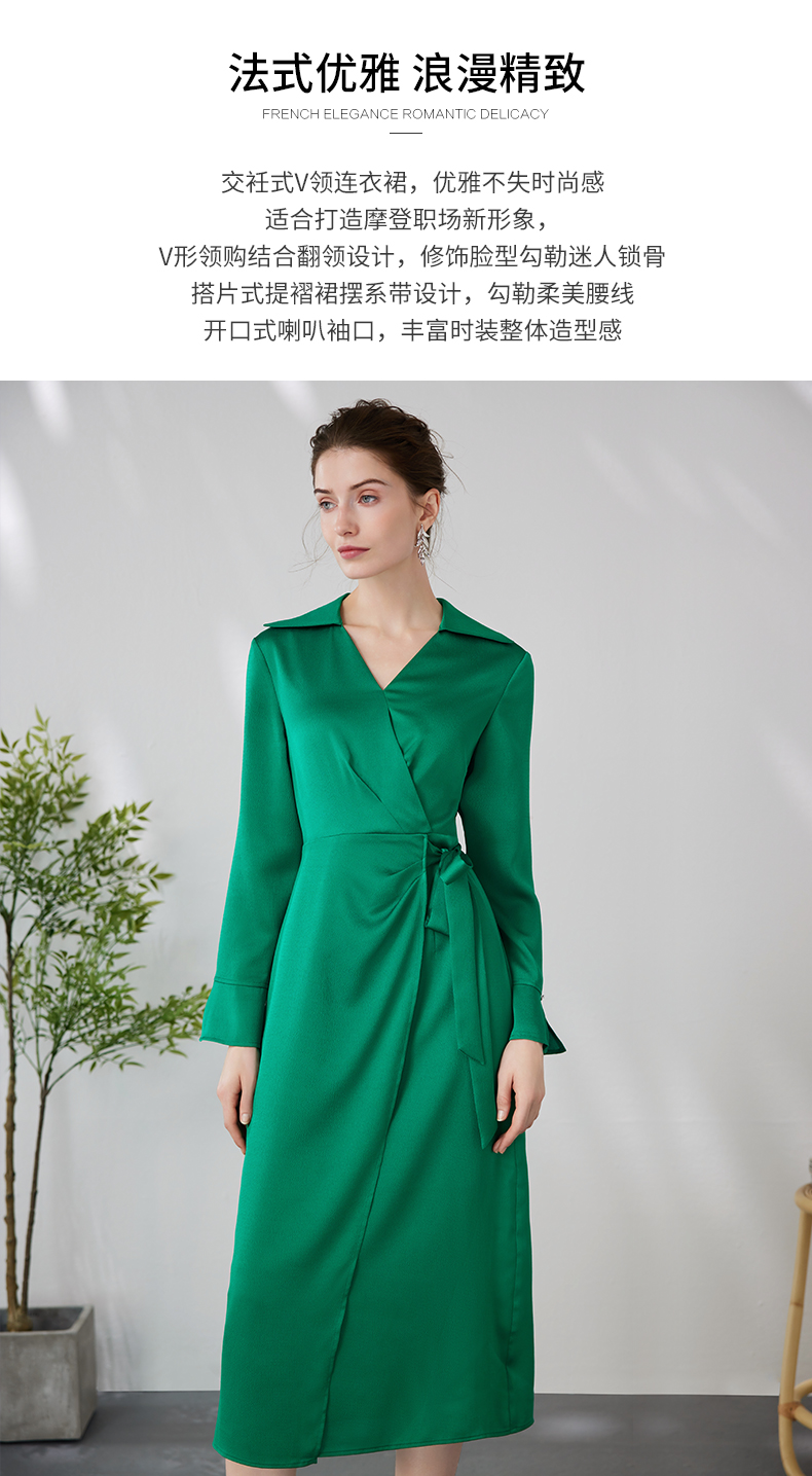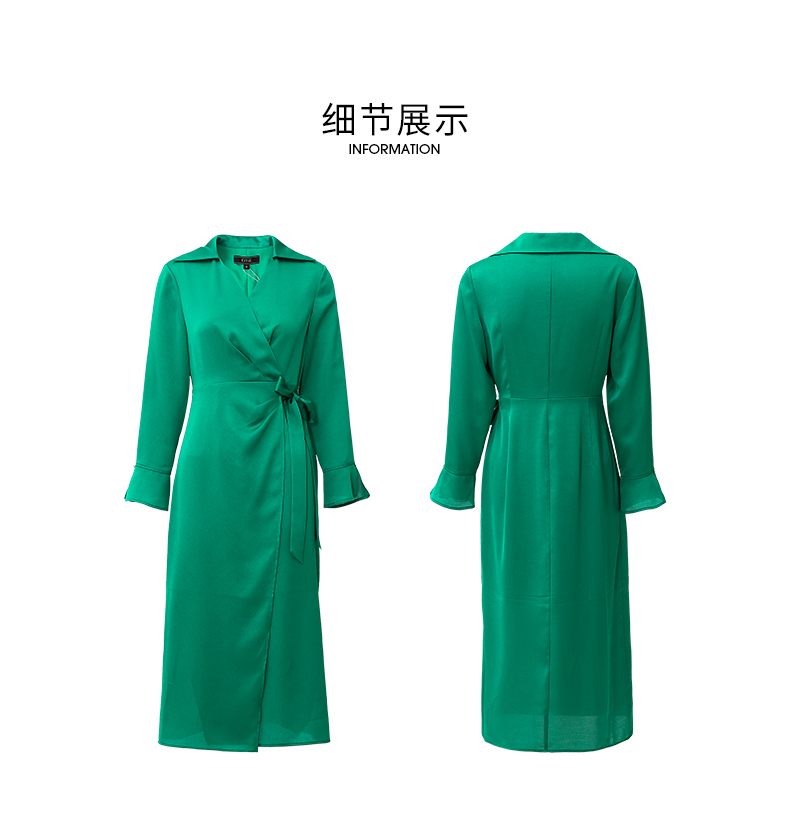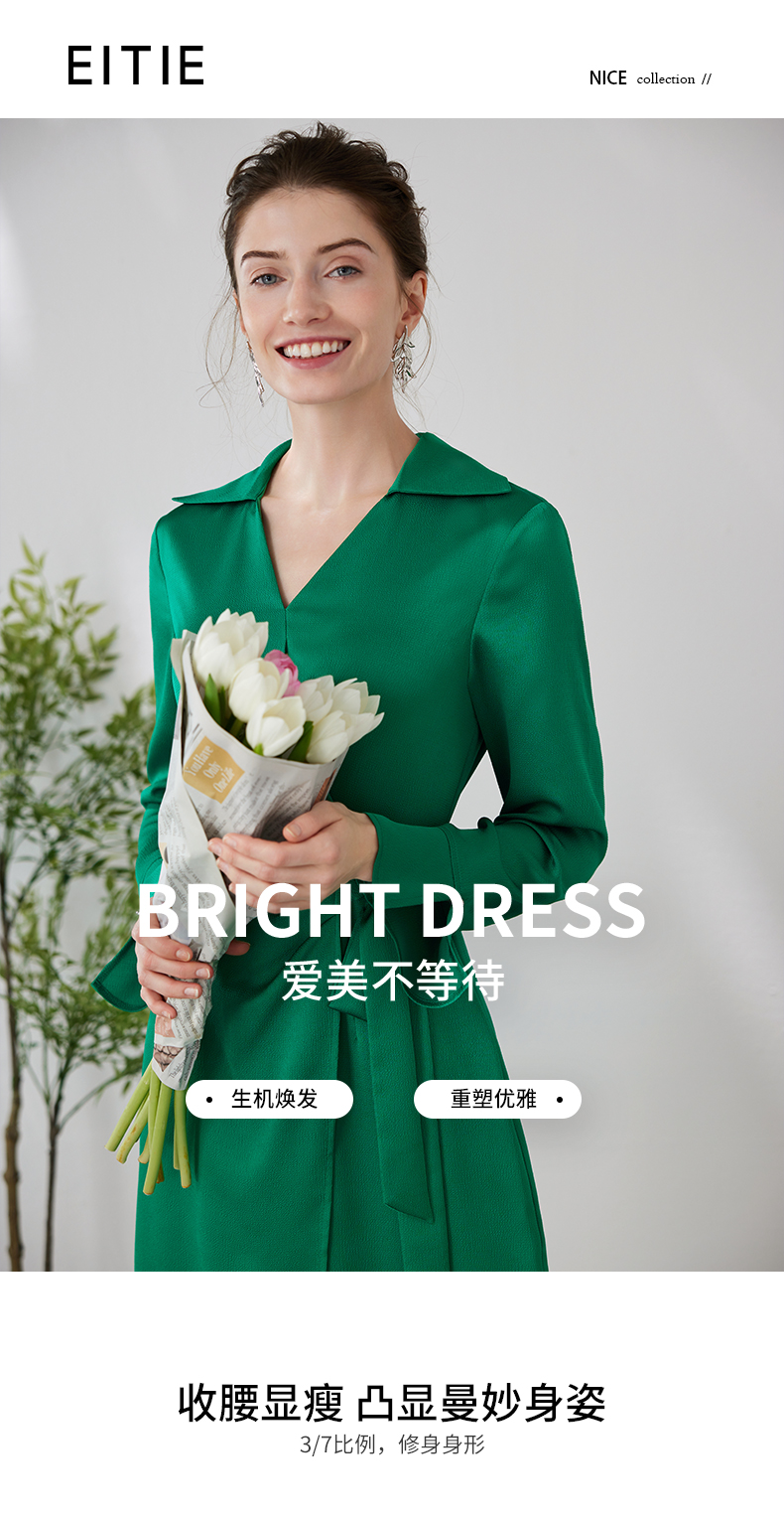 EEITIE爱特爱气质V领收腰系带缎面垂坠通勤显瘦绿色连衣裙24春新款A2407319