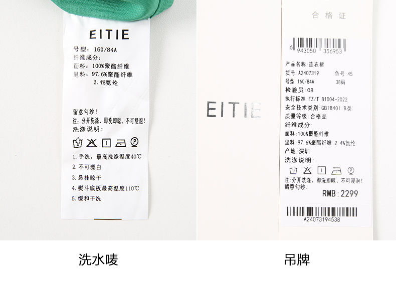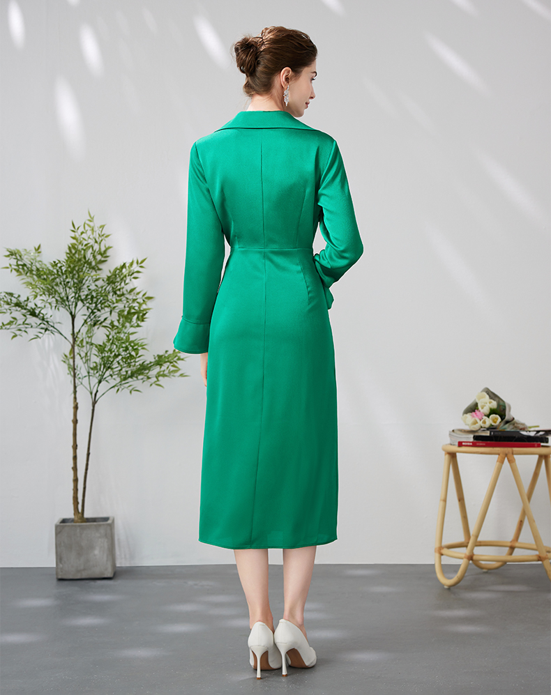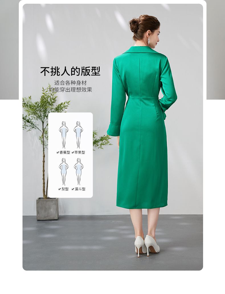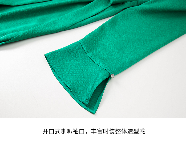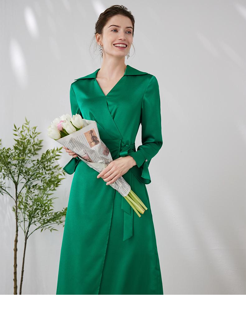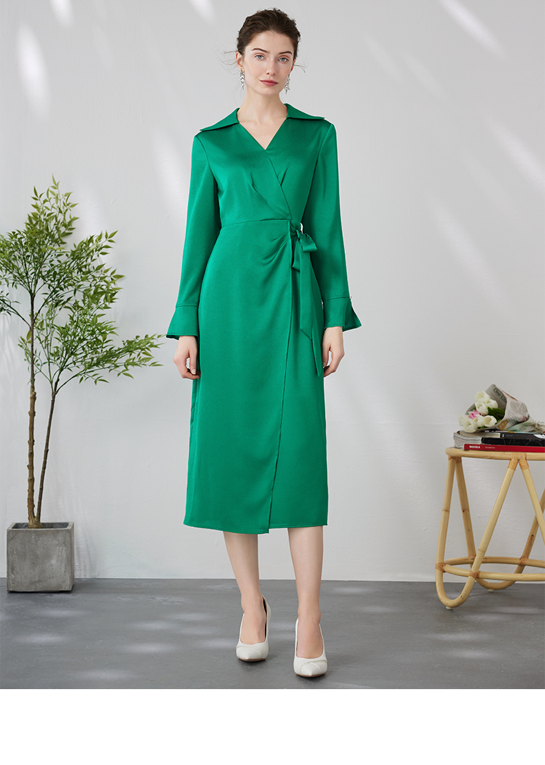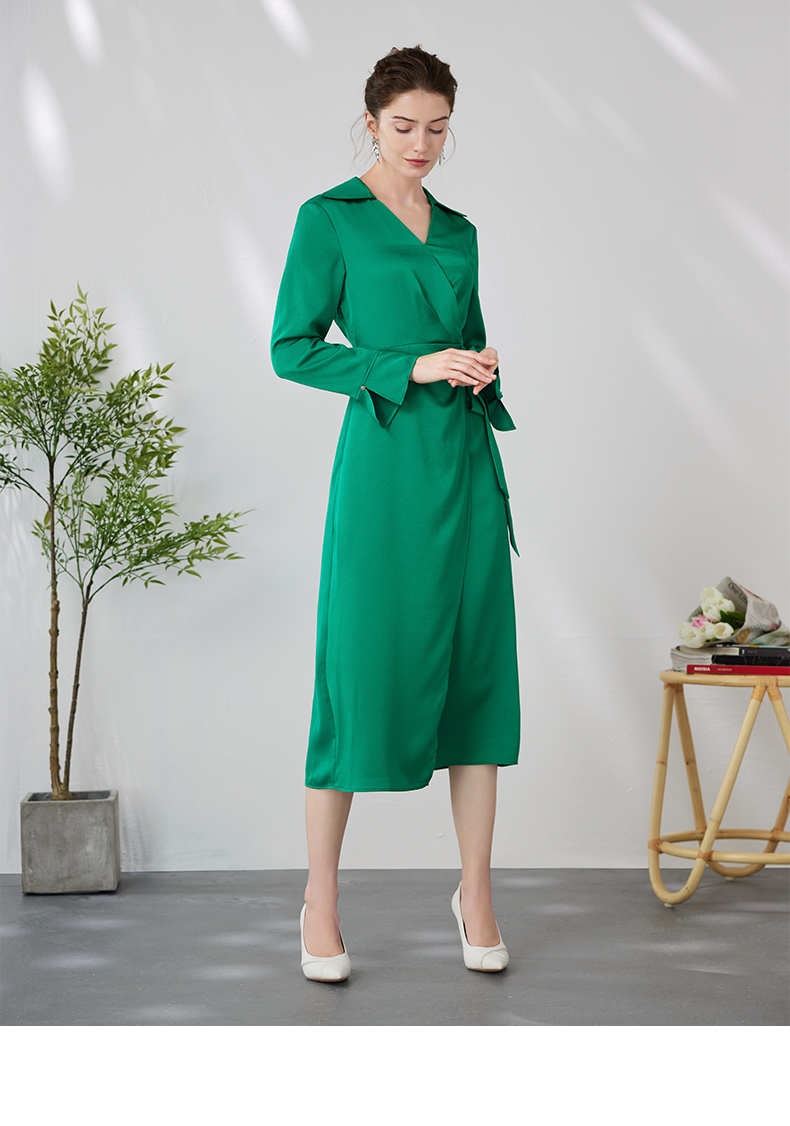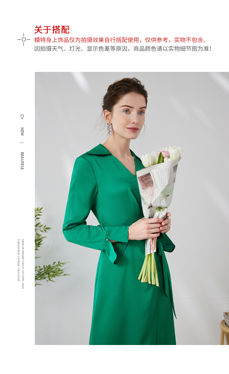EEITIE爱特爱气质V领收腰系带缎面垂坠通勤显瘦绿色连衣裙24春新款A2407319