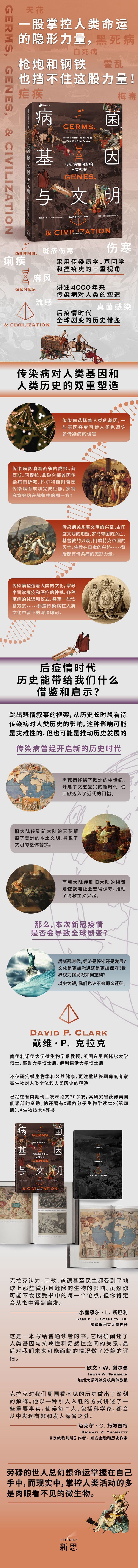 清晰,有思想,发人深省。《病菌、基因与文明》认为传染病在塑造人类社会方面发挥了重要作用。克拉克认为,宗教、道德甚至民主都受到了地球上那些微小且危险的生物的影响。虽然你可能不会接受书中的每一个论点,但你肯定会从书中得到启发。