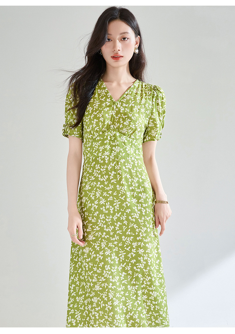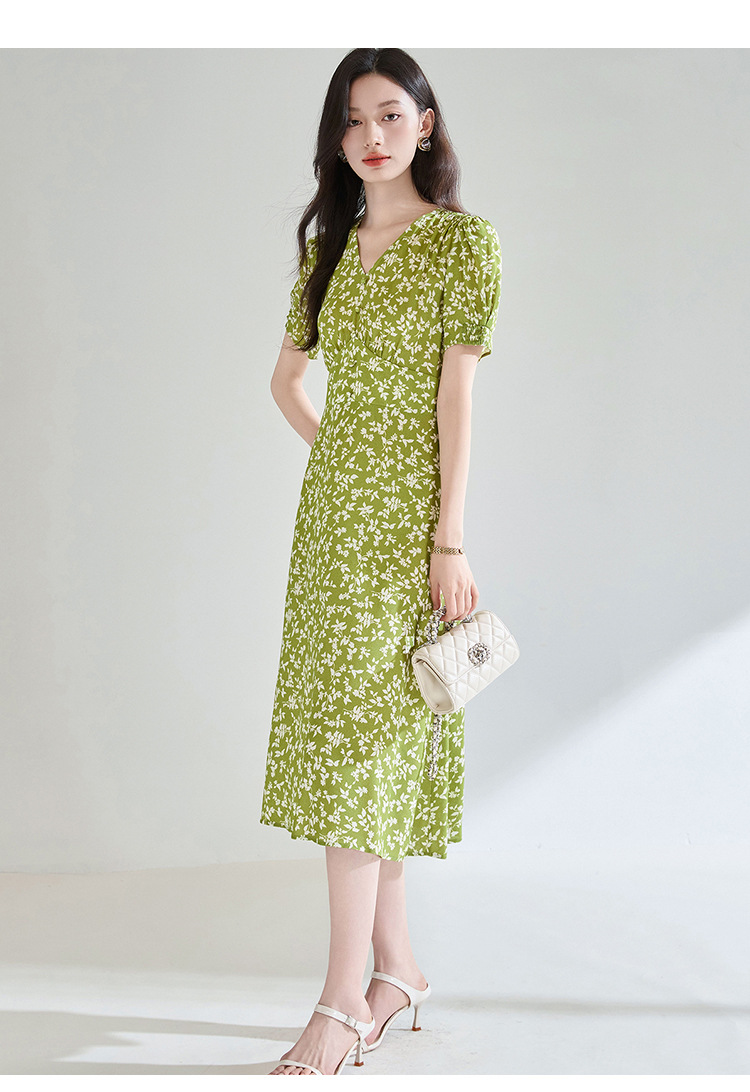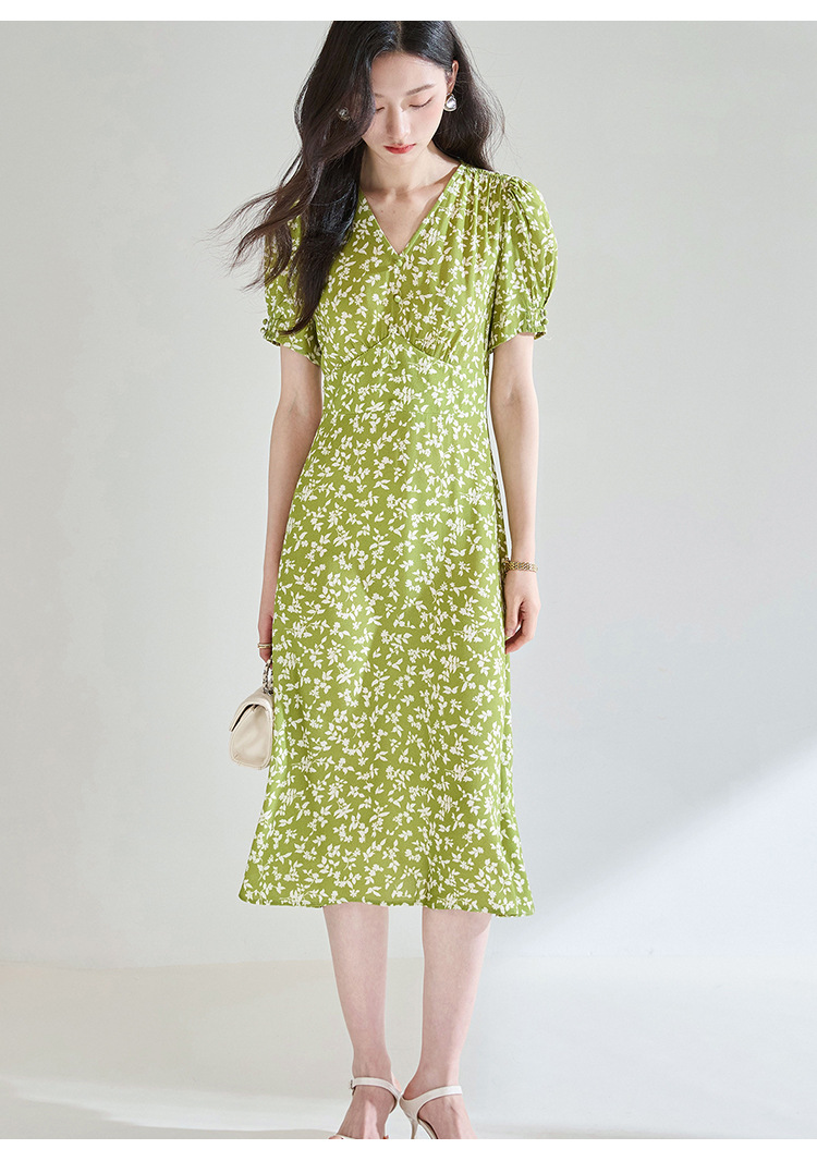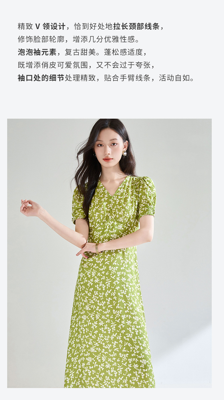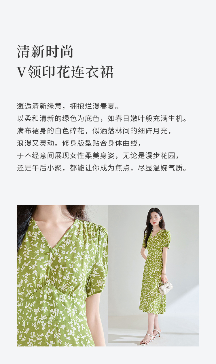 「高货sh」全新升级【铂金会员293/天猫399/差价106】(05046)洛诗琳夏季牛油果绿碎花茶歇裙2025收腰显瘦V领碎花连衣裙