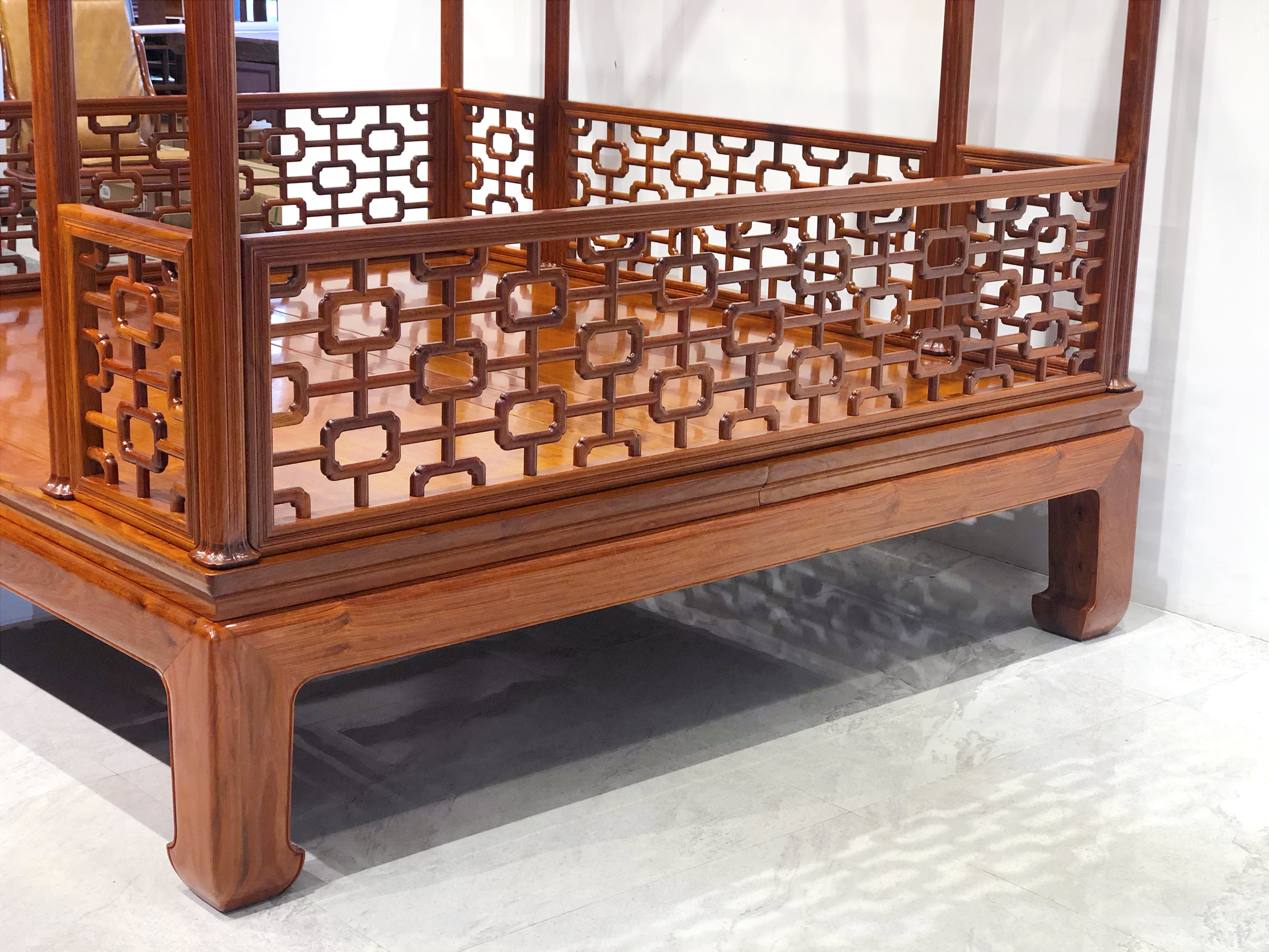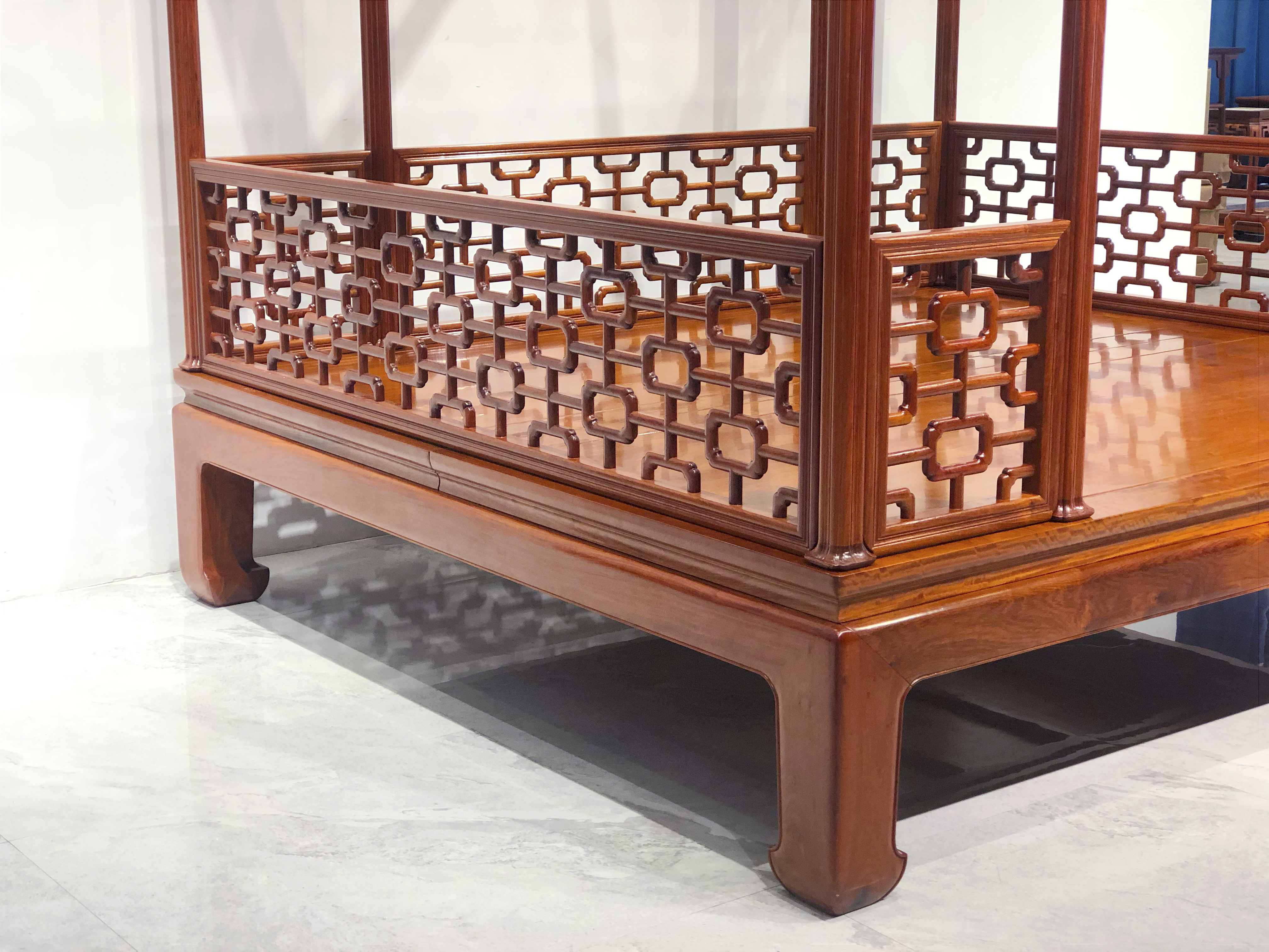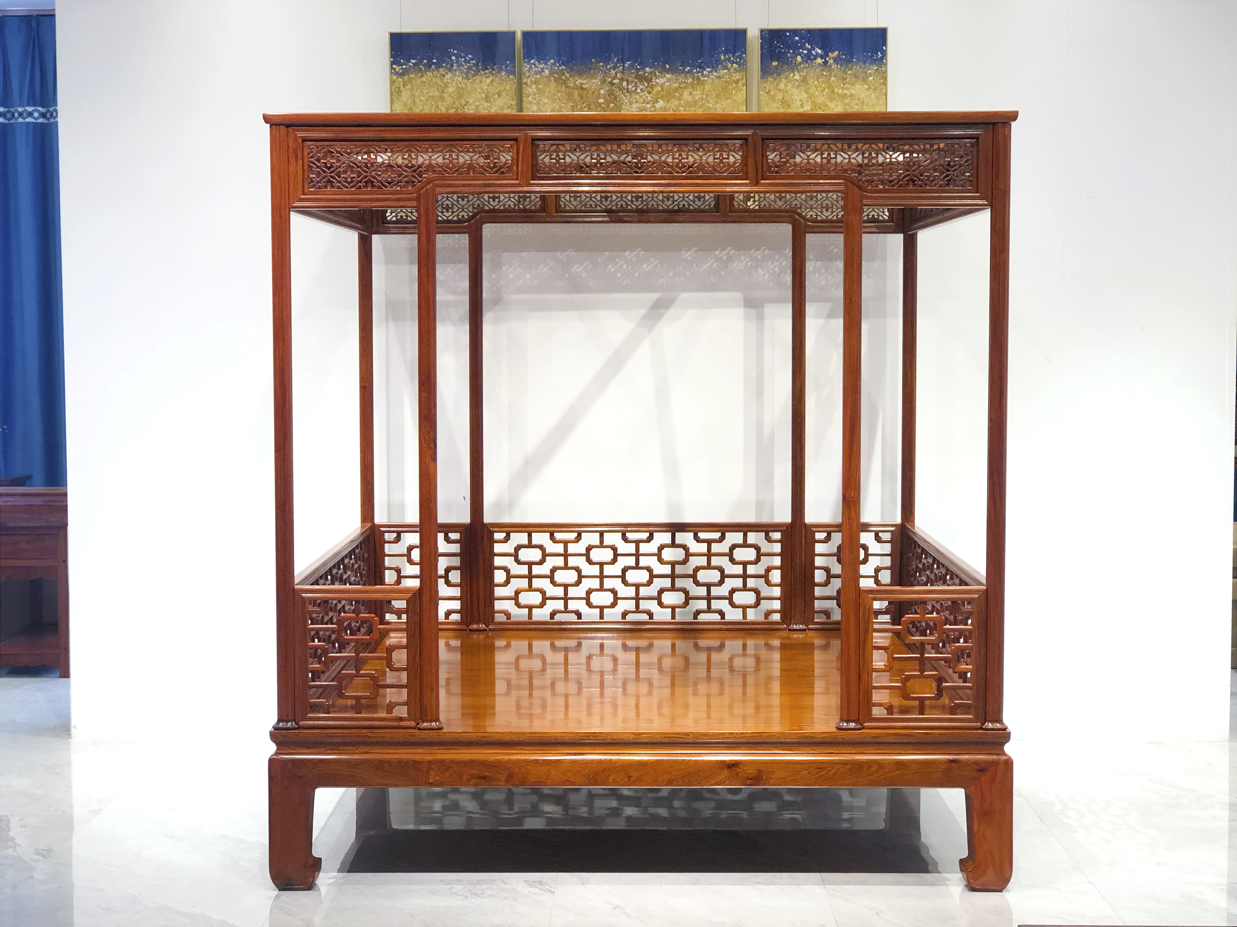 架子床,四面有工,每个角度都是看面,床挂檐嵌镶的绦环板,锼镂出纤细美观的海棠花图案,六根床柱起瓜棱线,前脸挂沿高拱的罗锅枨,新颖又独特,不落俗套。
