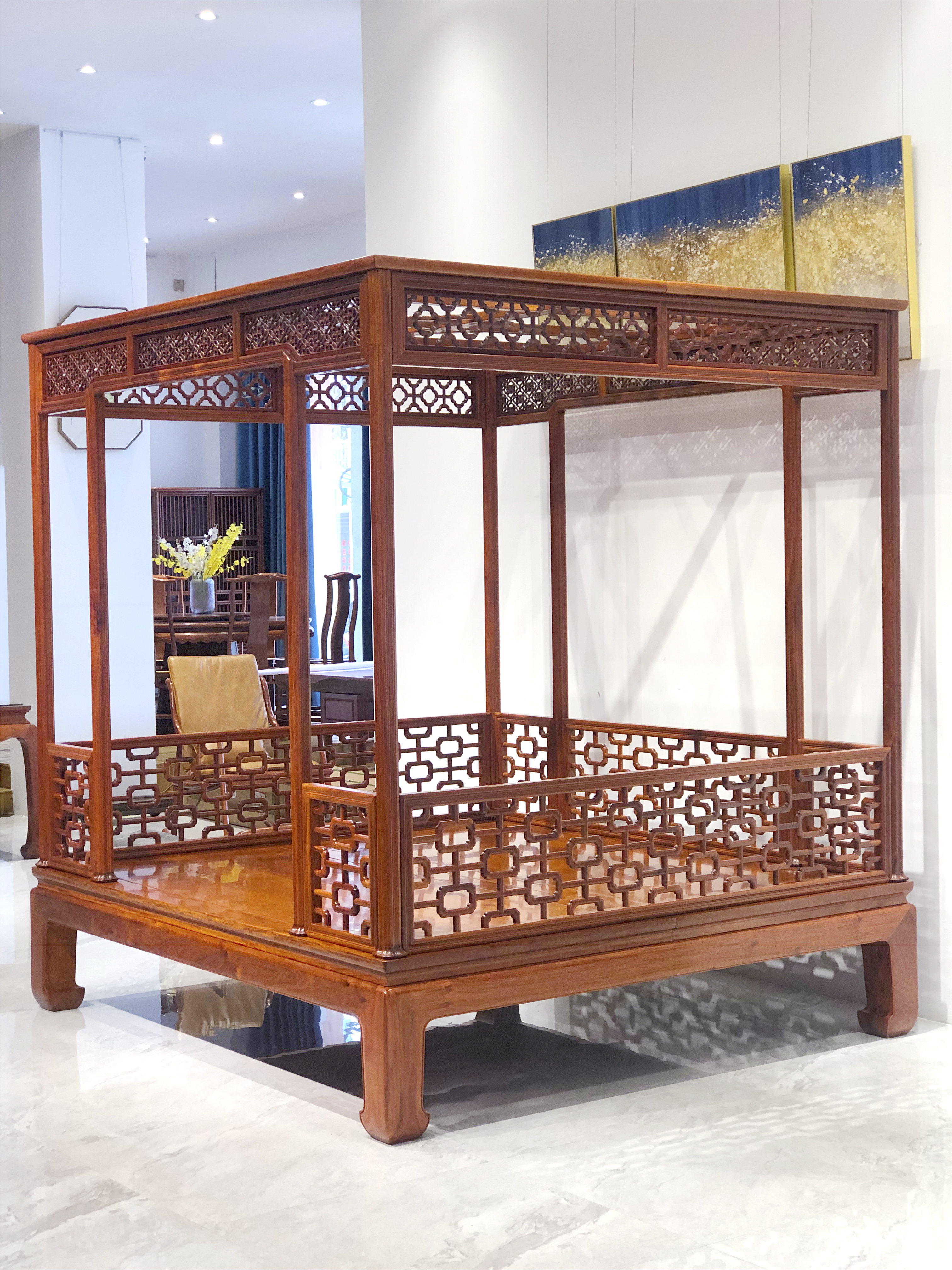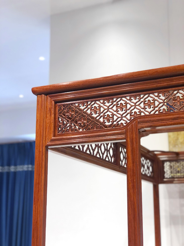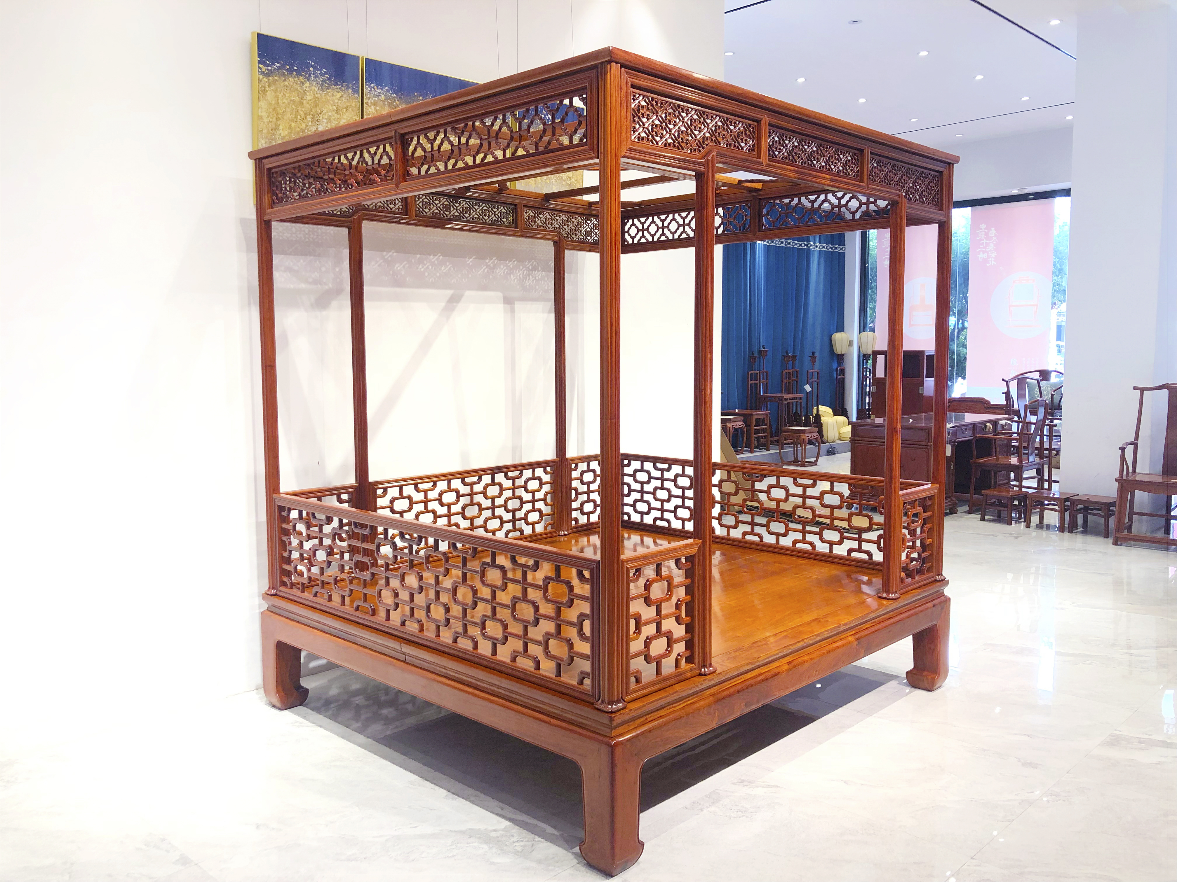 架子床,四面有工,每个角度都是看面,床挂檐嵌镶的绦环板,锼镂出纤细美观的海棠花图案,六根床柱起瓜棱线,前脸挂沿高拱的罗锅枨,新颖又独特,不落俗套。