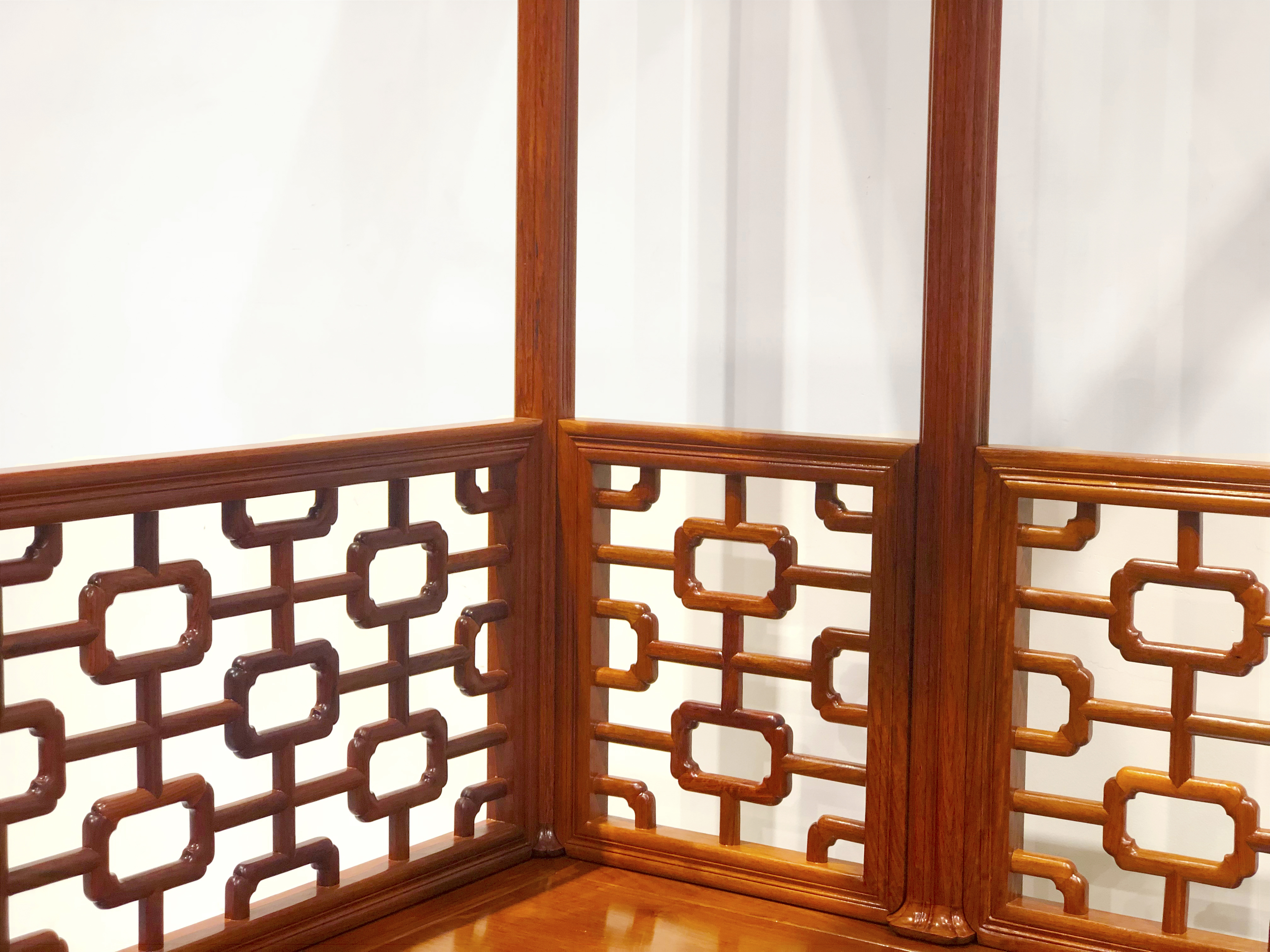 床座为马蹄腿带束腰,用料宽厚大度,围子用短材以榫卯攒接成十字连海棠图案,行列分明。