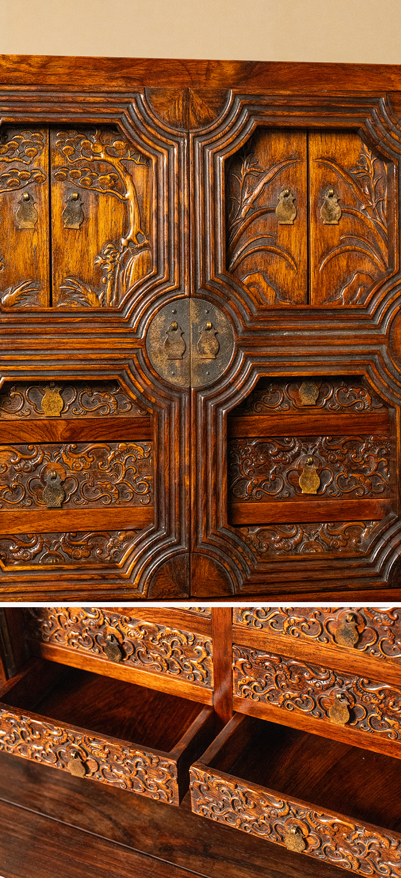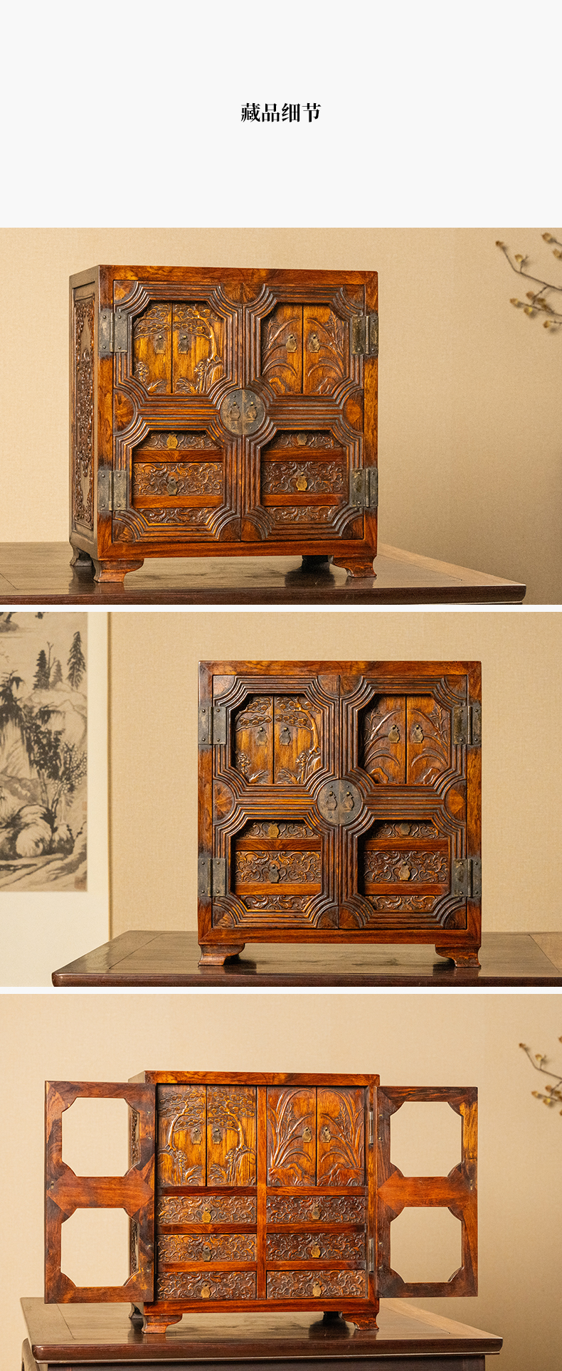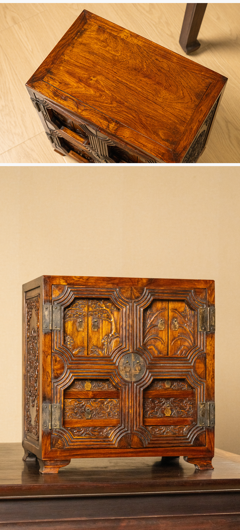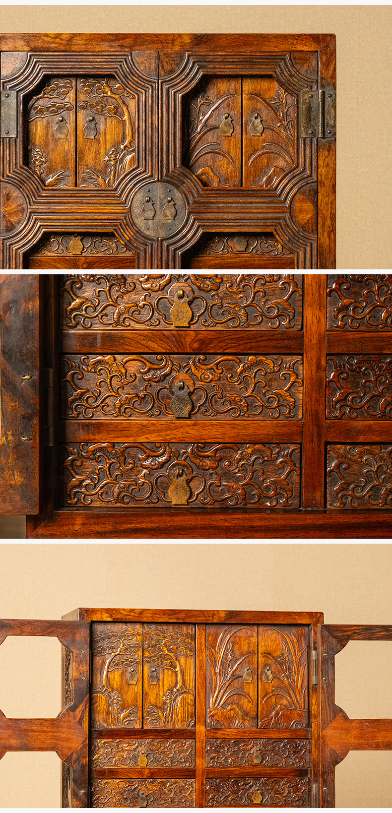 清 红木浮雕松树兰花百宝箱