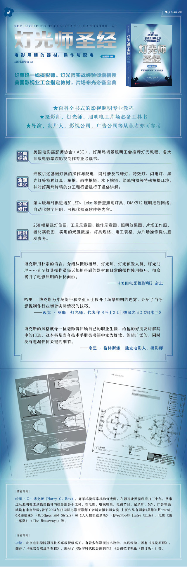 《灯光师圣经》是一本百科全书式的影视照明专业教程,应一名新手照明电工到全面的灯光师的职业成长之需,介绍了当今电影工业中用到的每一类灯具,并结合数据、图表和手把手的指导,教你如何运用设备和工具达到为一场戏的情境创造理想的照明效果。本书出版二十余年,历经四次修订,长销不衰,被好莱坞工会指定为灯光培训教材,是供摄影师、灯光师、照明电工片场查阅的必备工具书。