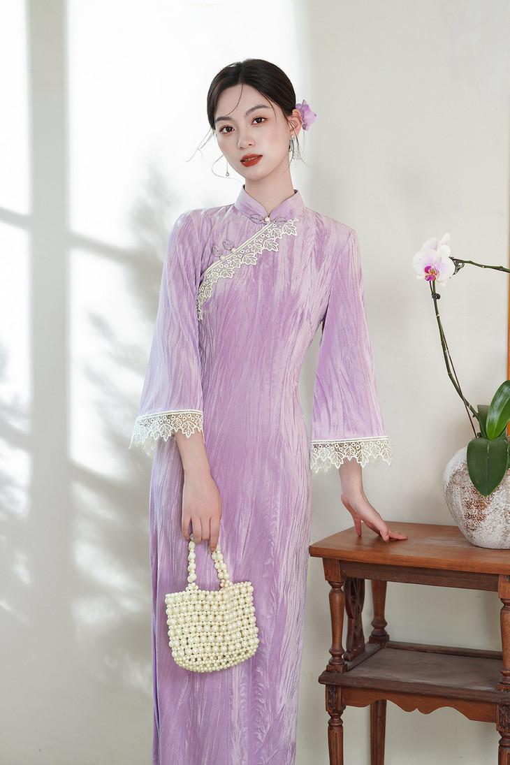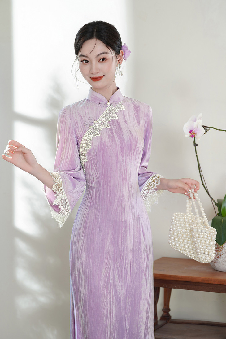 2025年秋季新款改常蕾丝包边年轻款丝绒倒大袖旗袍XL1612 商品图0
