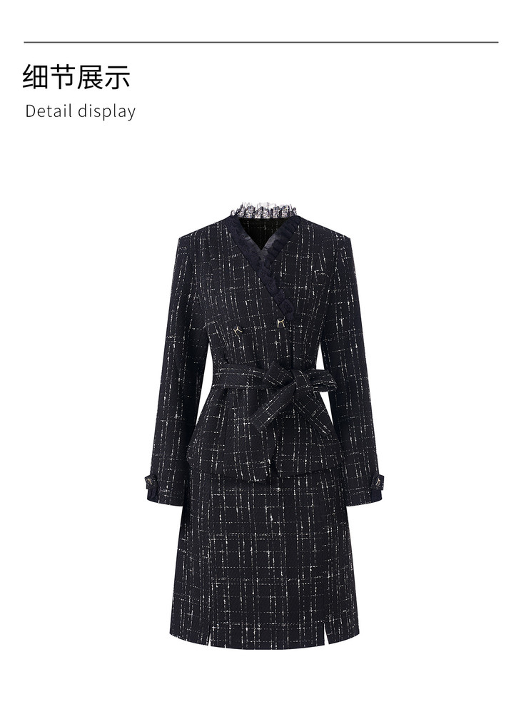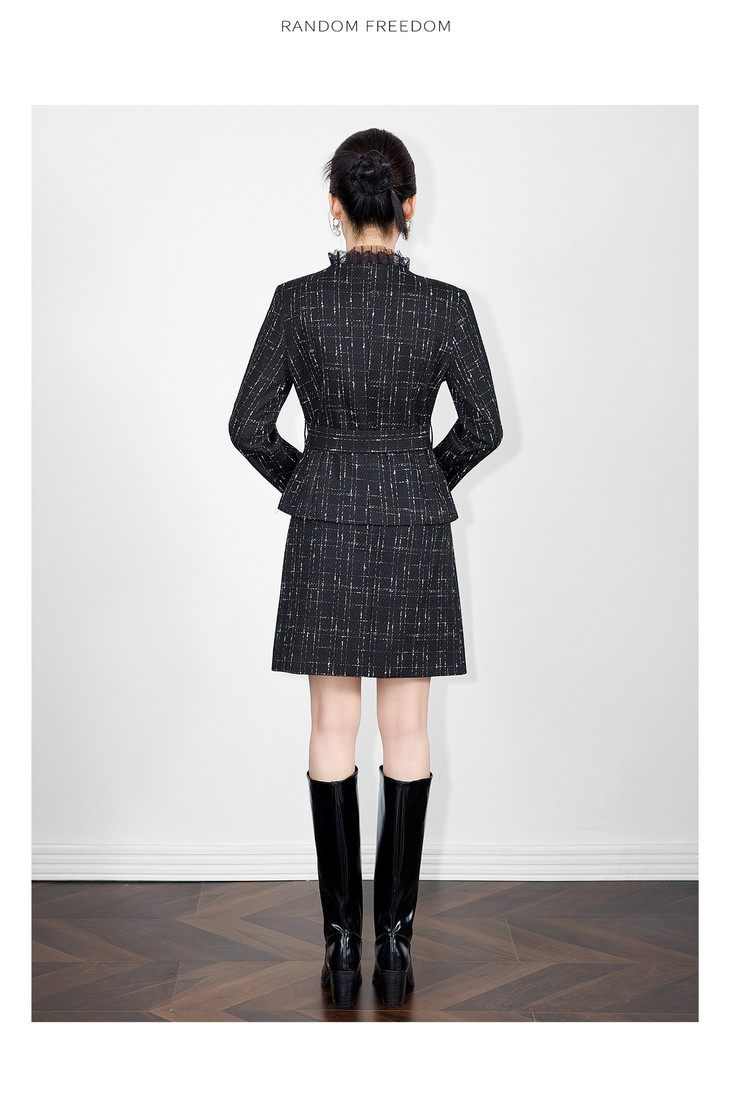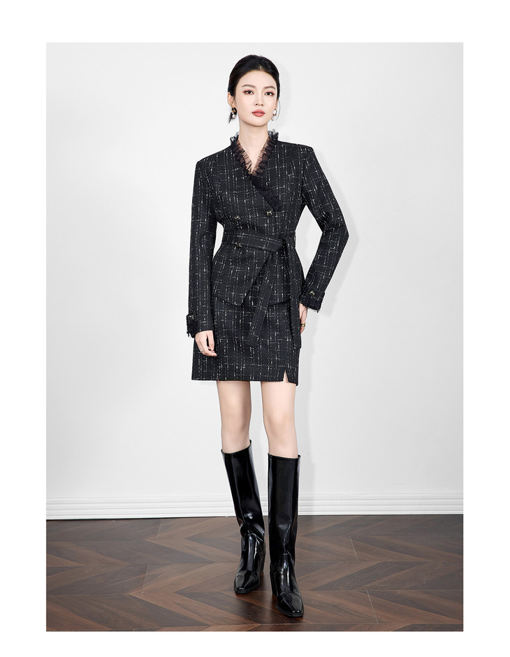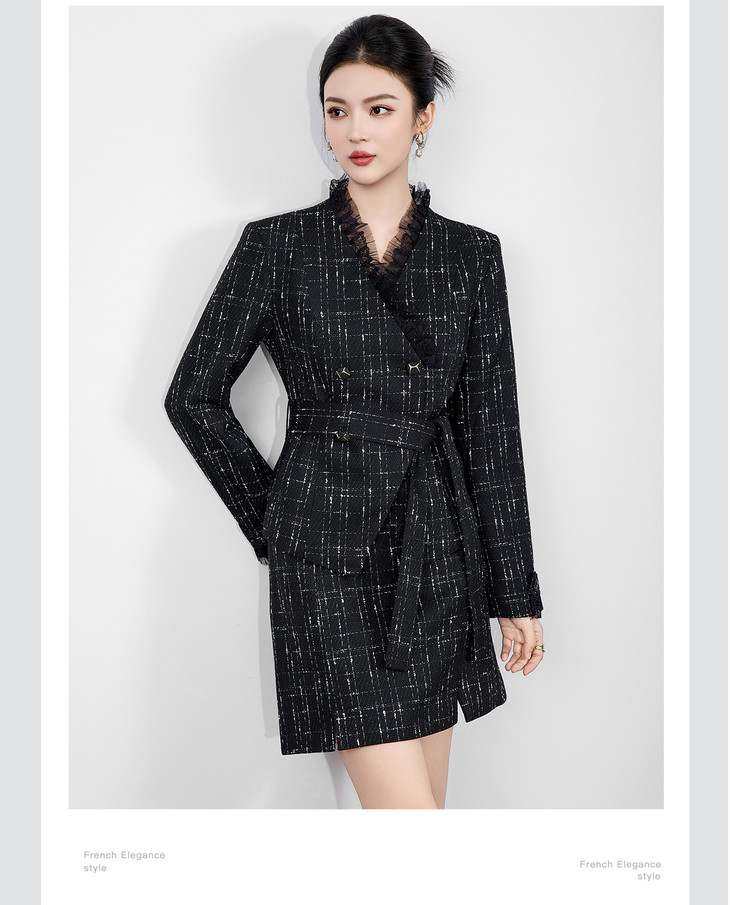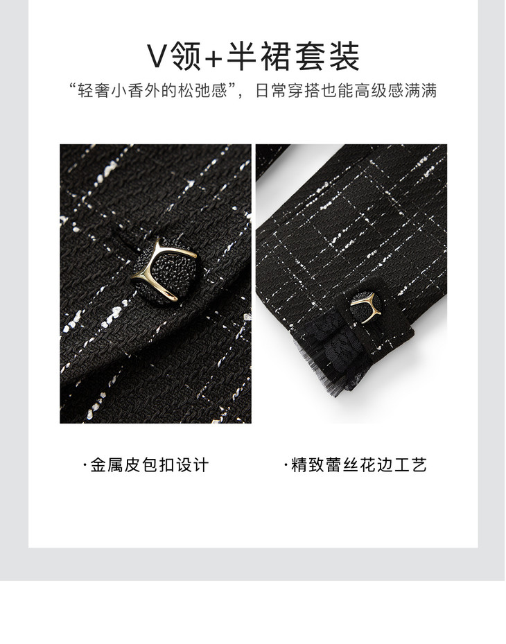 小香风复古格纹收腰蕾丝V领上衣+洋气半裙套装WLZD2515207